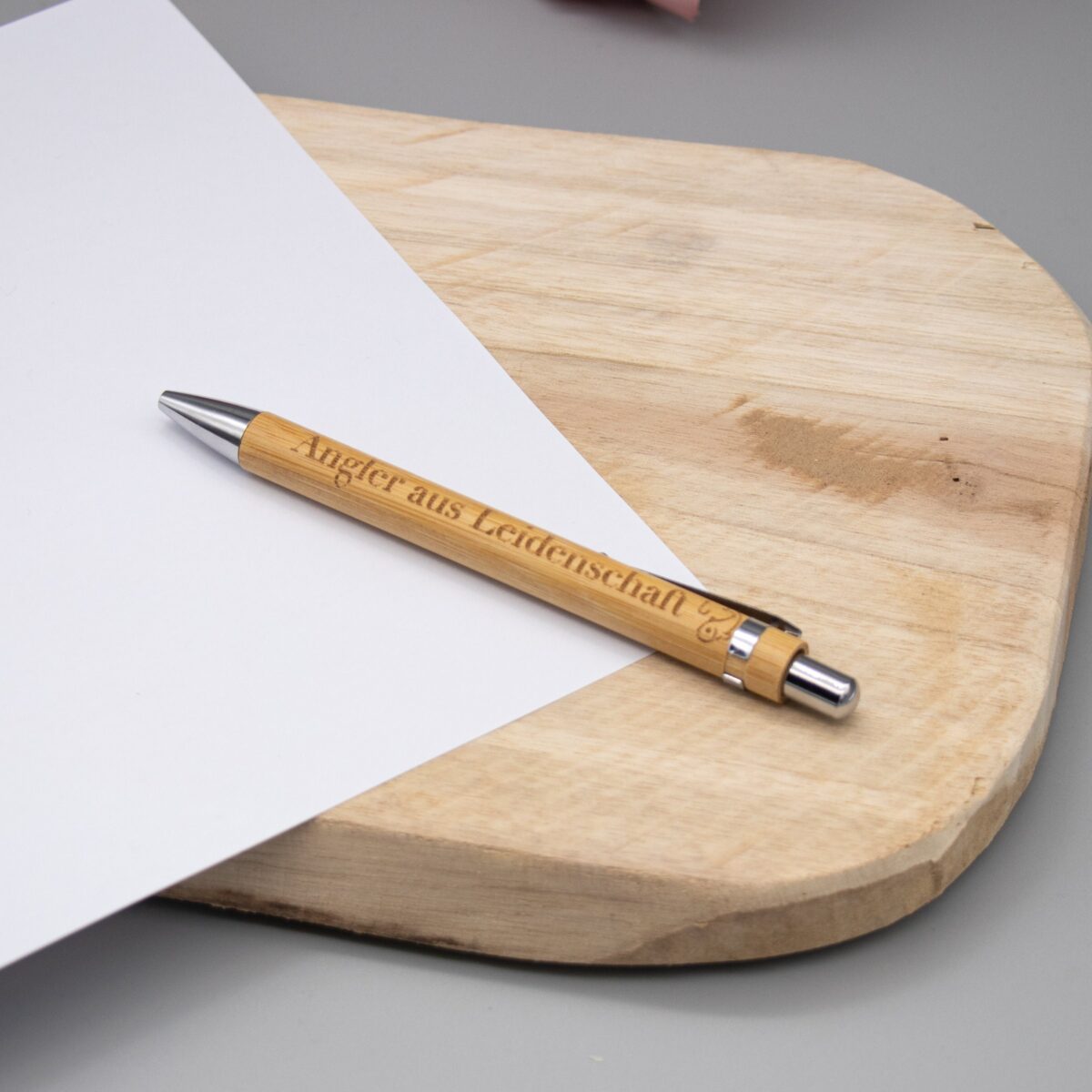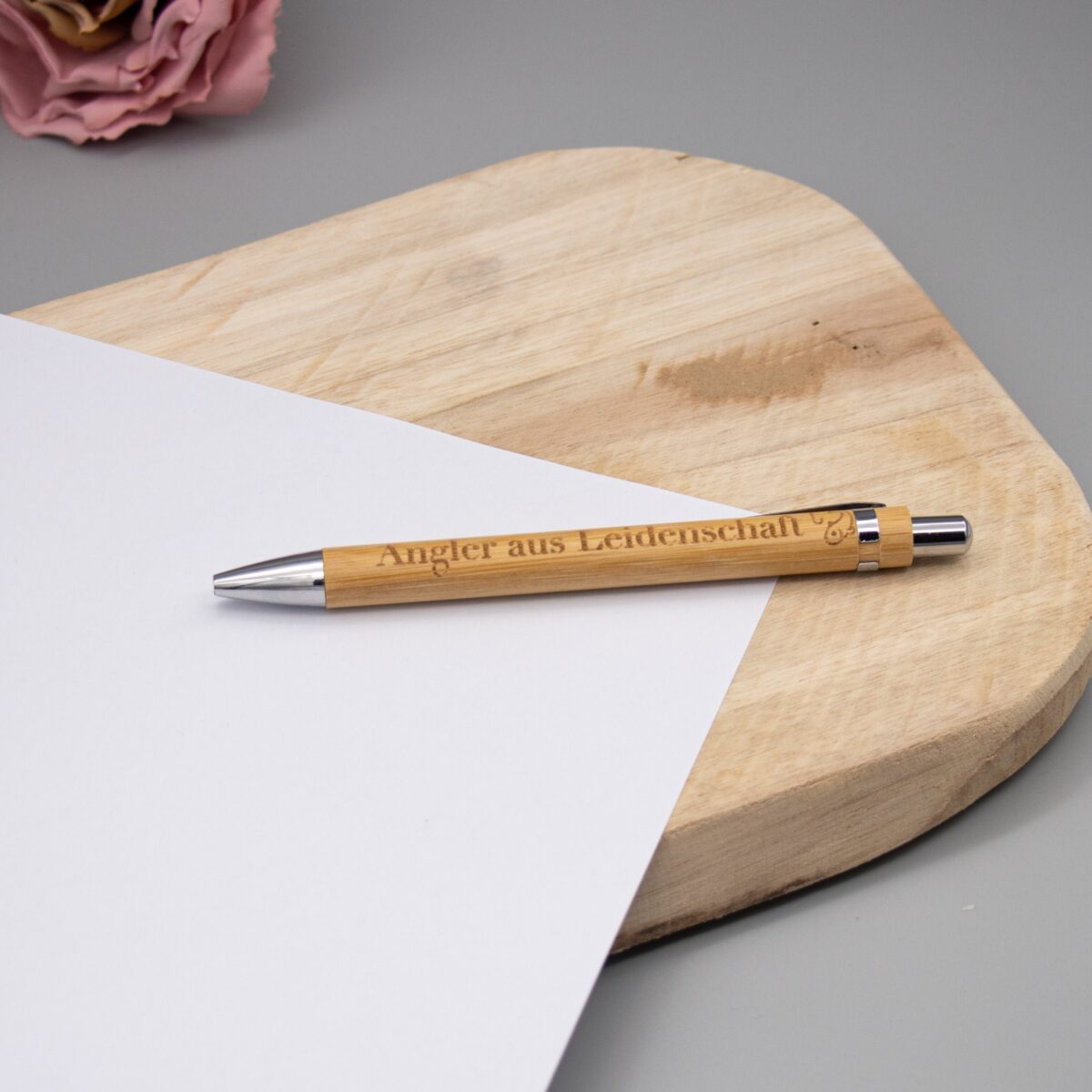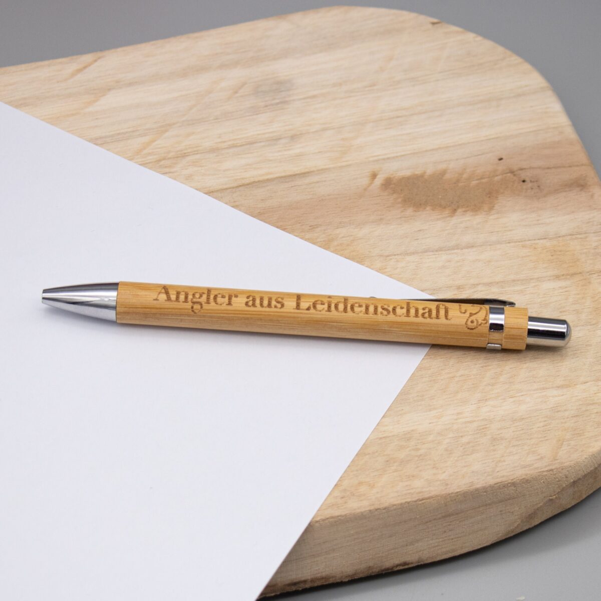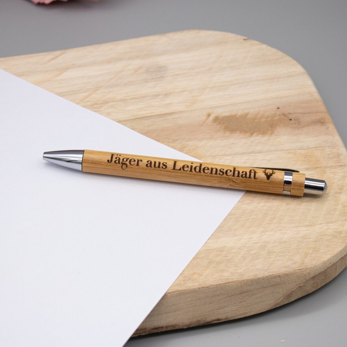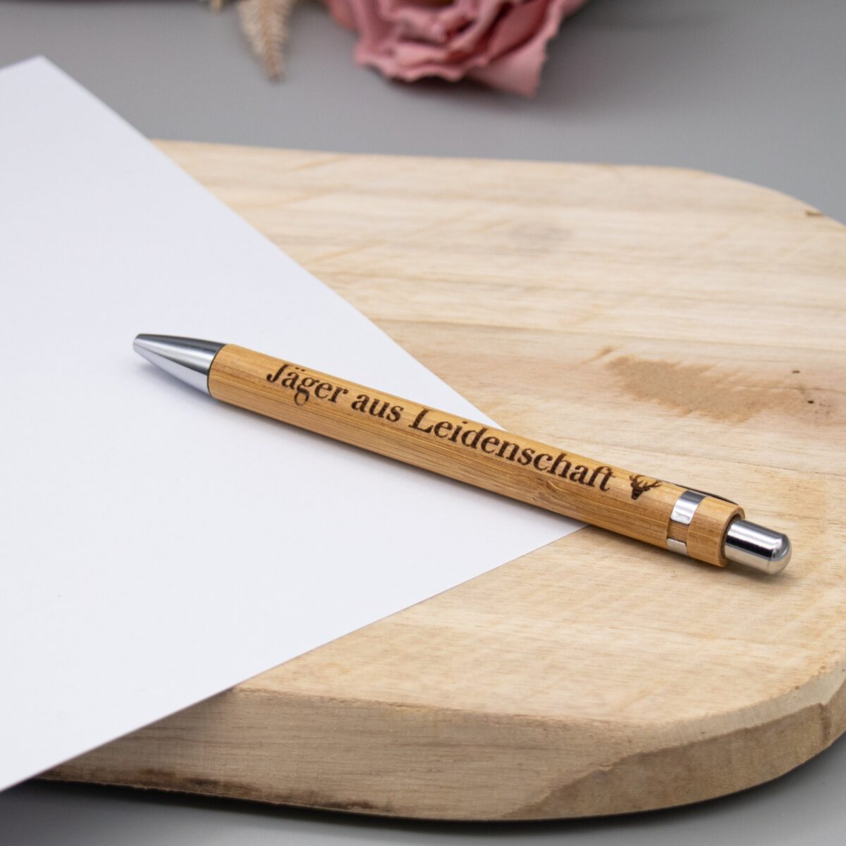 Unser exklusiver Bambuskugelschreiber mit den Gravuren „Jäger aus Leidenschaft“ und „Angler aus Leidenschaft“ ist das ideale Geschenk für alle, die ihre Liebe zur Natur und ihren Passionen für die Jagd oder das Angeln gerne ausdrücken möchten. Aus nachhaltigem Bambus gefertigt und mit individuellen Gravuren versehen, vereint dieser Kugelschreiber Funktionalität und Leidenschaft auf stilvolle Weise.