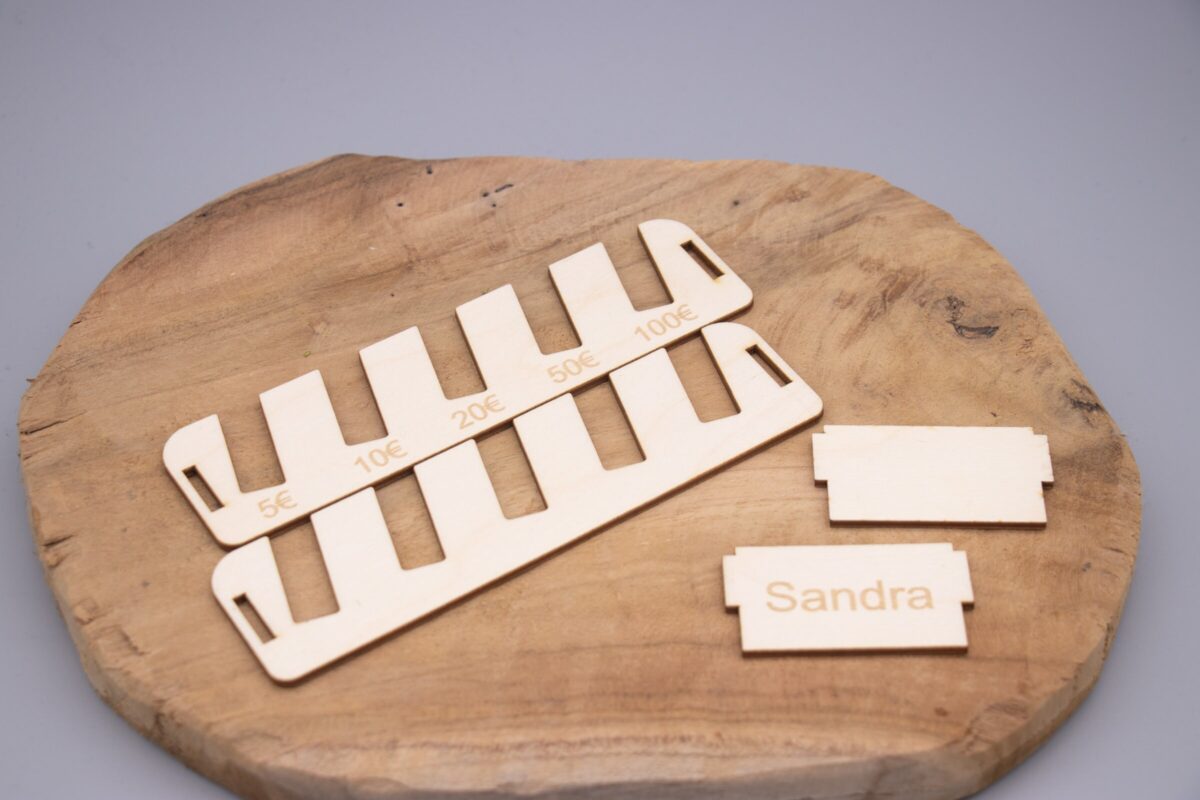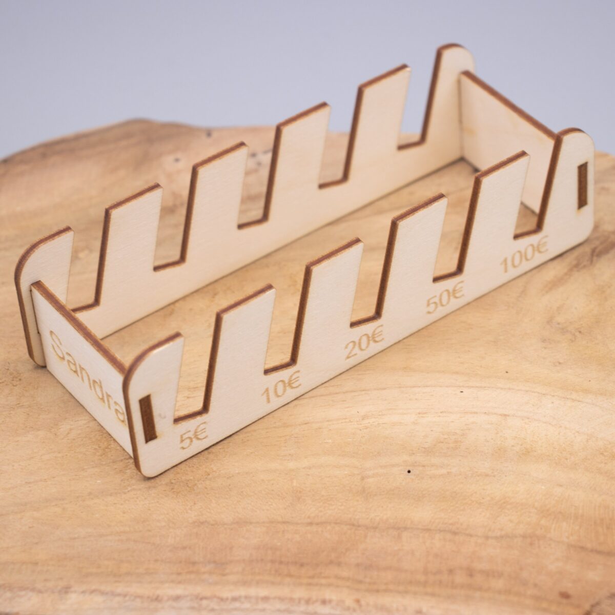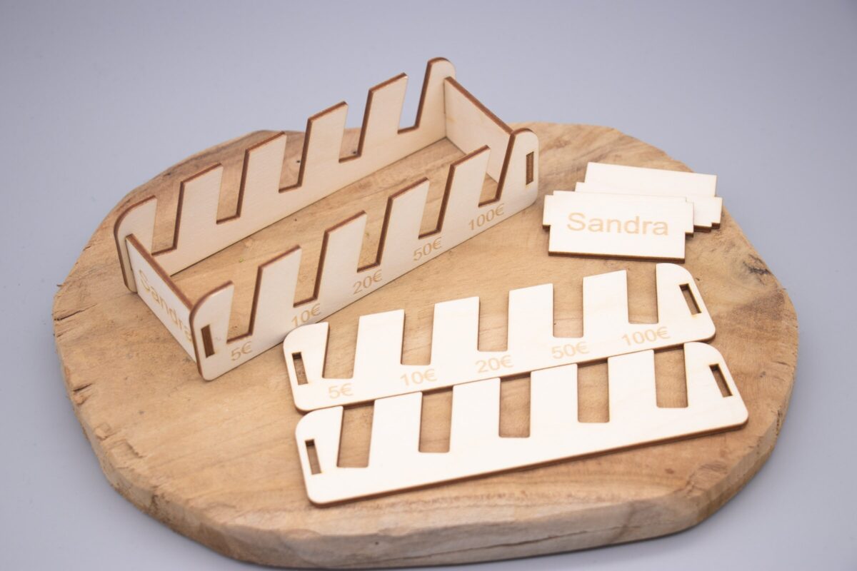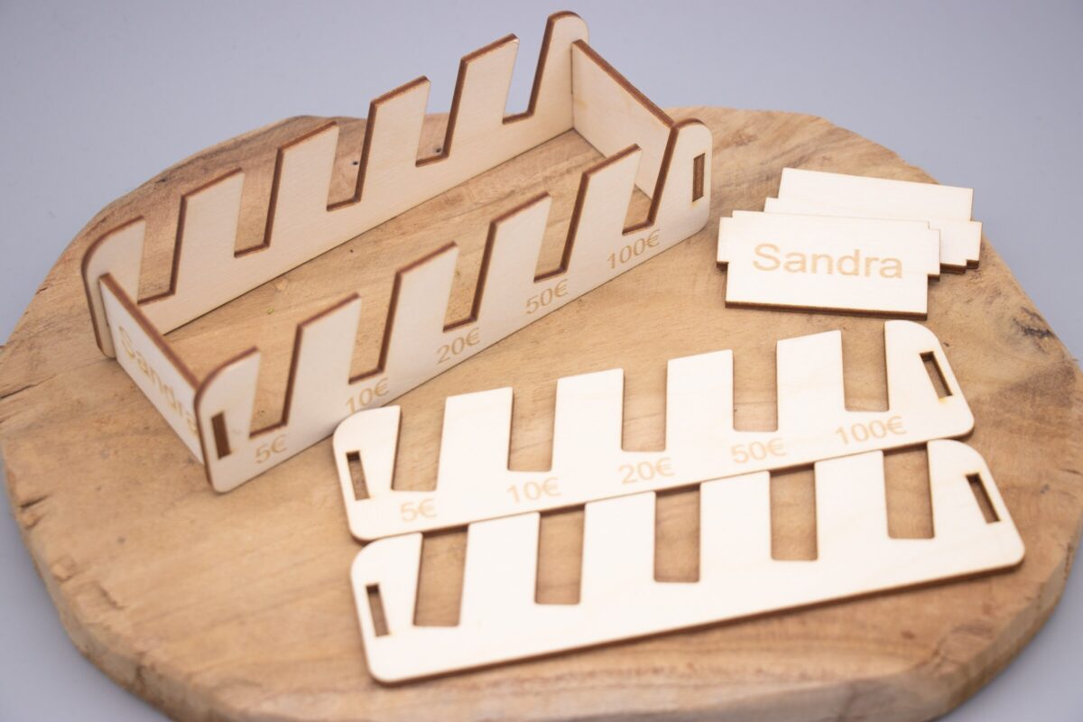 Diese Cash Stuffing Ständer werden mithilfe unseres Lasers hergestellt. Sie bestehen aus 3mm Birkensperrholz.