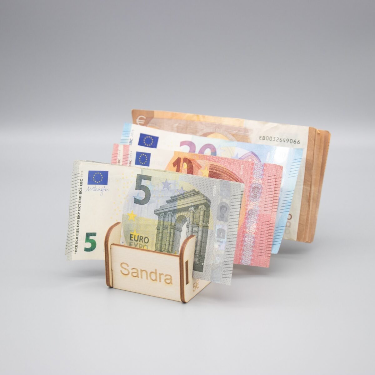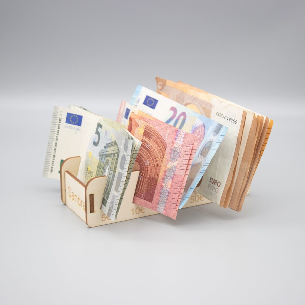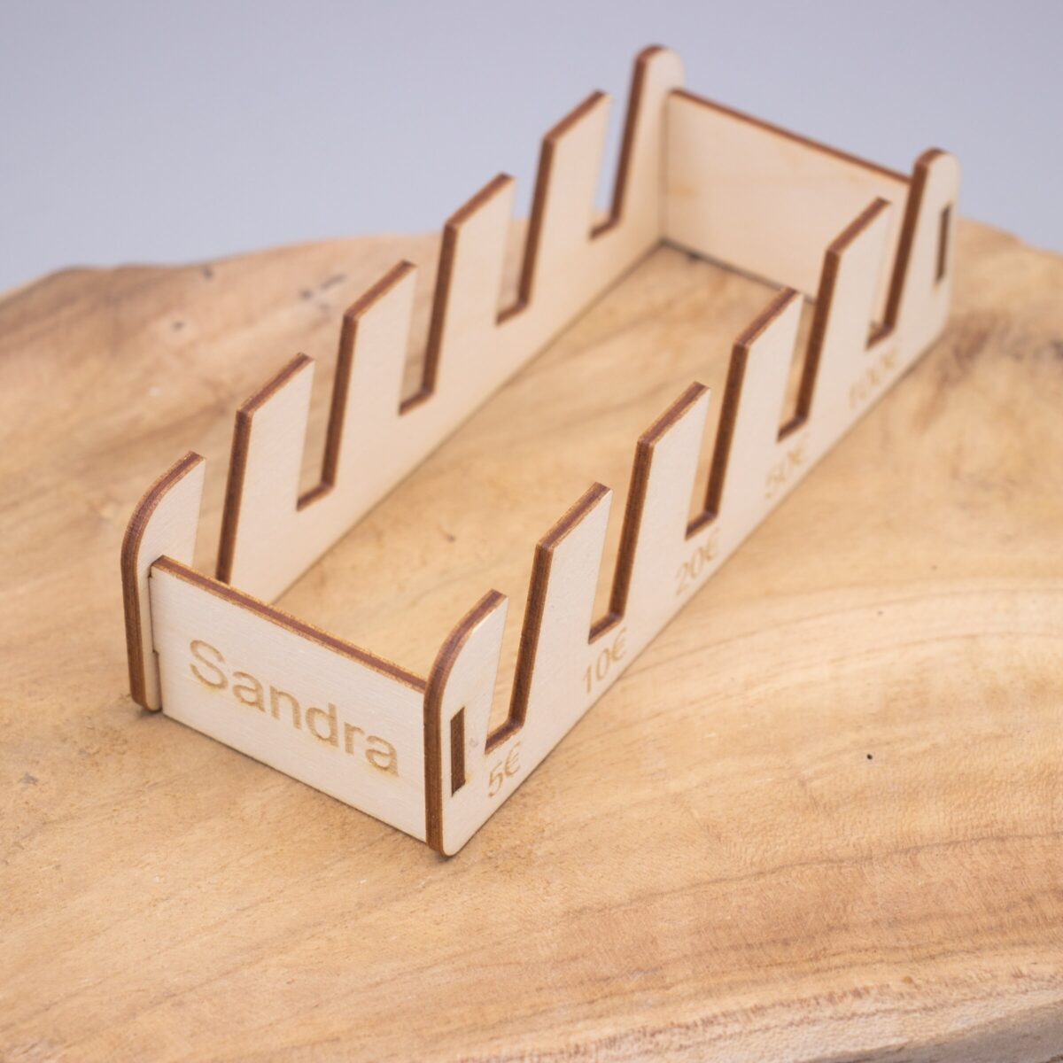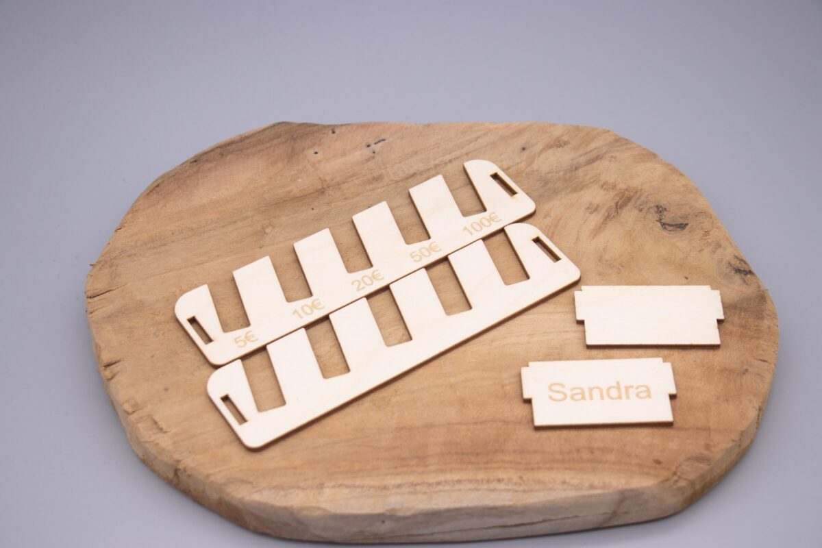 Diese Cash Stuffing Ständer werden mithilfe unseres Lasers hergestellt. Sie bestehen aus 3mm Birkensperrholz.