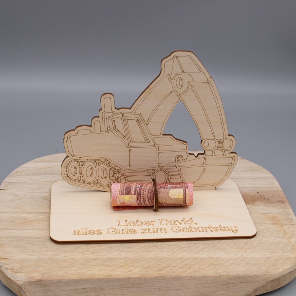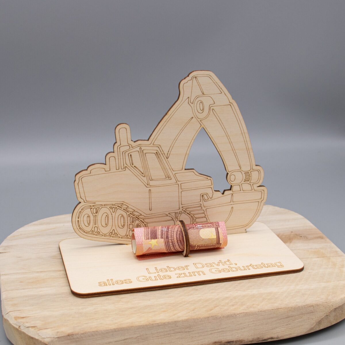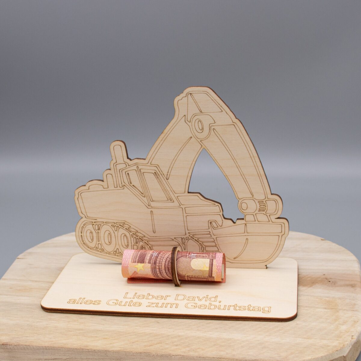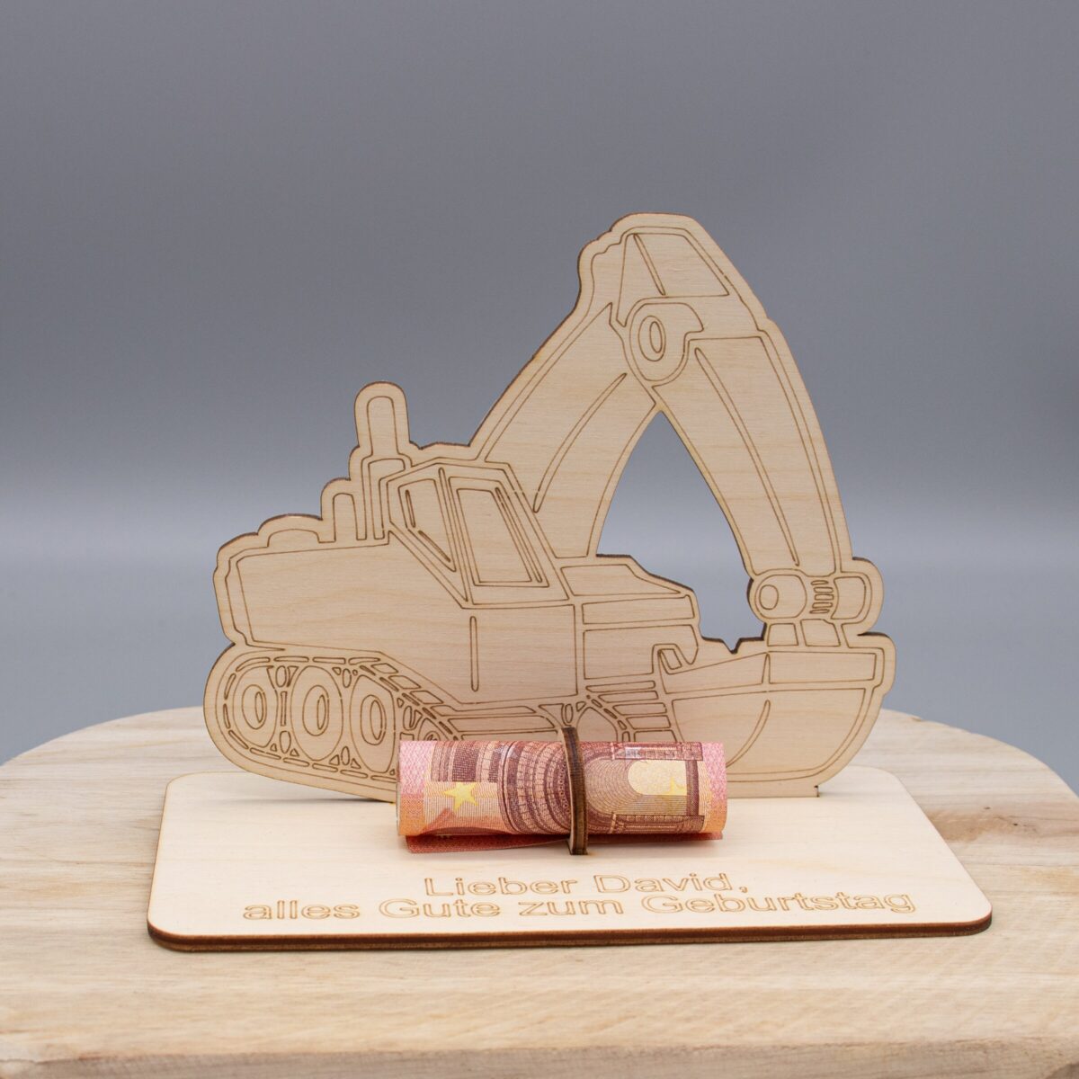 Mach dein Geldgeschenk zu etwas Besonderem – mit einem personalisierten Bagger aus Holz!