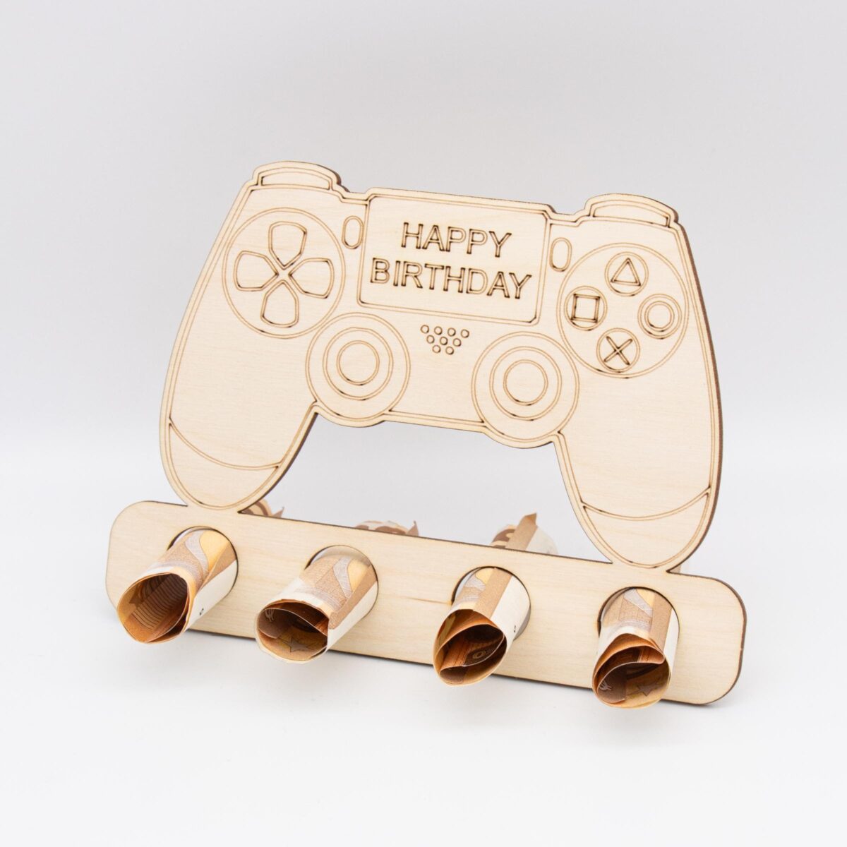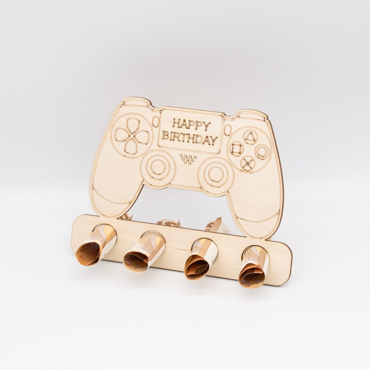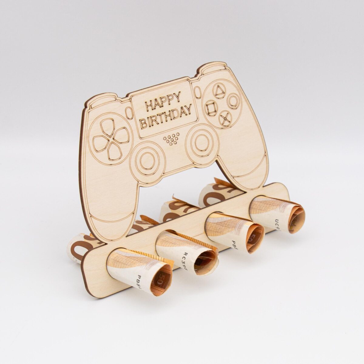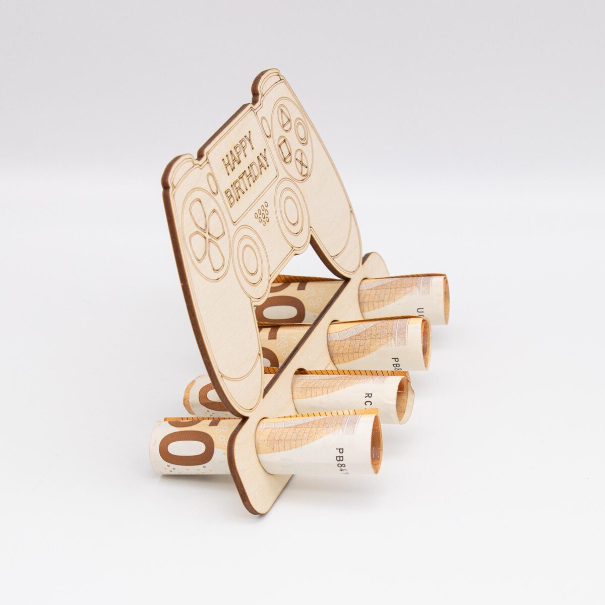 Auf der Suche nach einer originellen Geschenkidee für Gaming-Fans? Unser Geldgeschenk-Halter im Controller-Design aus hochwertigem 3mm Birkenholz ist die perfekte Art, Geld stilvoll zu verschenken!