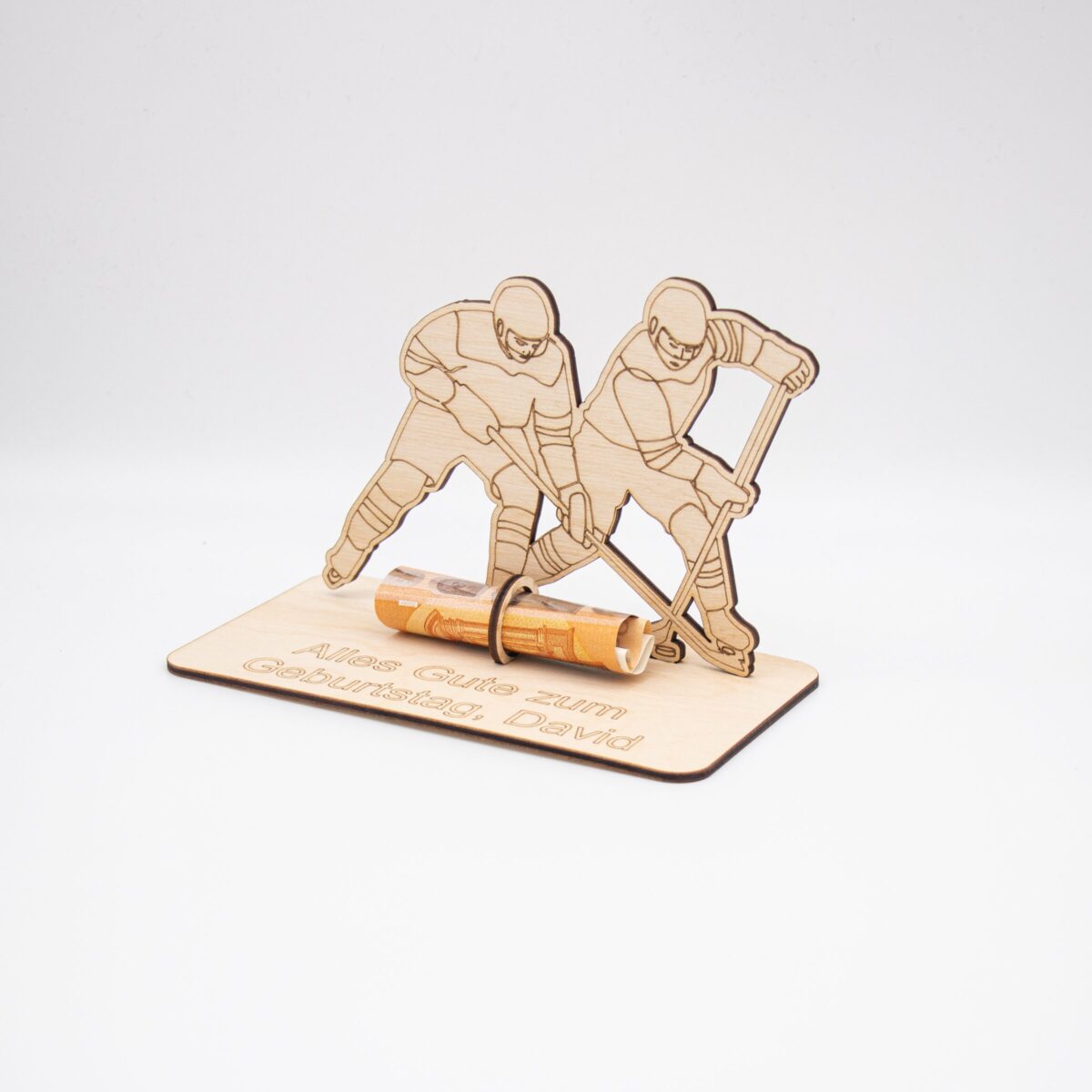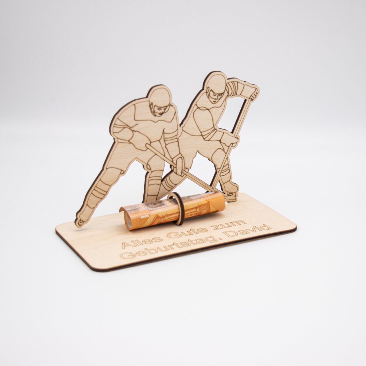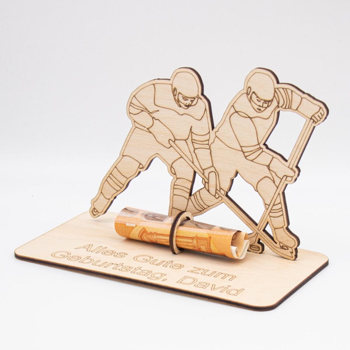 Du suchst nach einer originellen Verpackung für Geldgeschenke mit sportlicher Note? Unser Geldgeschenk aus 3 mm Holz mit Eishockey-Motiv ist die perfekte Lösung für alle Eishockey-Fans!
