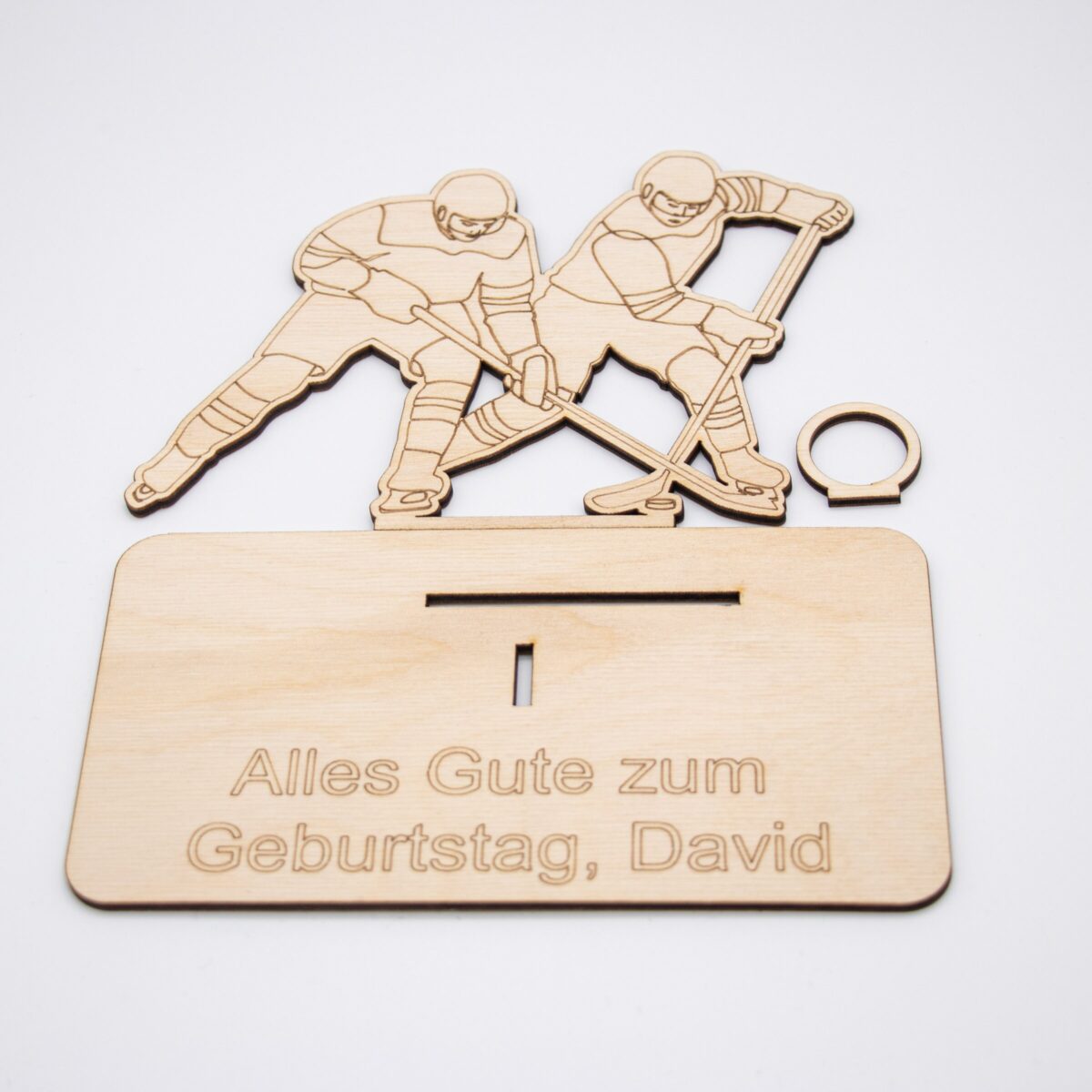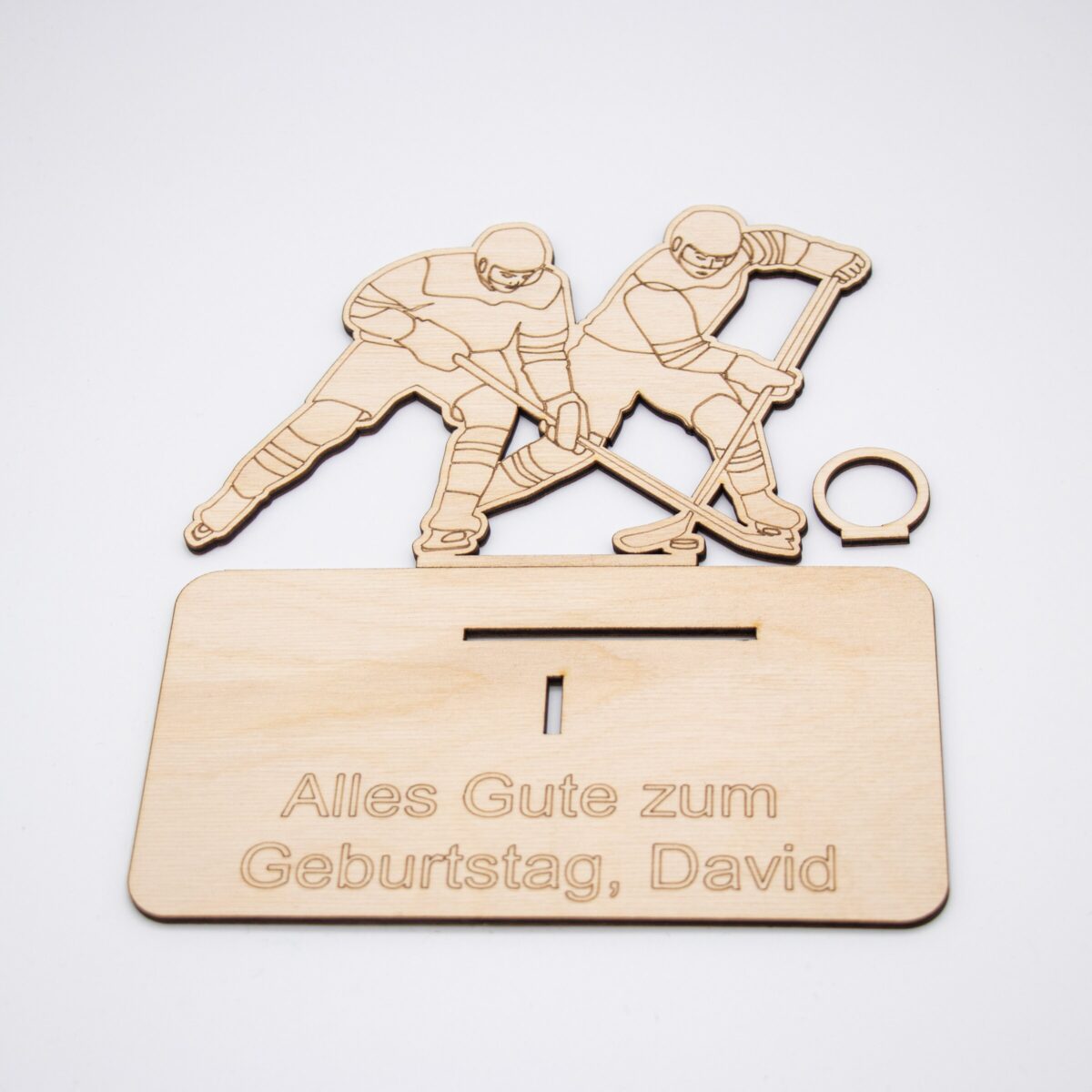 Dieses einzigartige Geschenk besteht aus mehreren präzise gelaserten Einzelteilen, die sich ganz einfach zusammenstecken oder kleben lassen – ein kleiner Bastelspaß inklusive! Das Motiv zeigt dynamische Eishockeyspieler in Aktion und macht dieses Geschenk zu einem echten Hingucker auf jedem Geburtstag, zur Jugendweihe, Konfirmation oder anderen Anlässen.