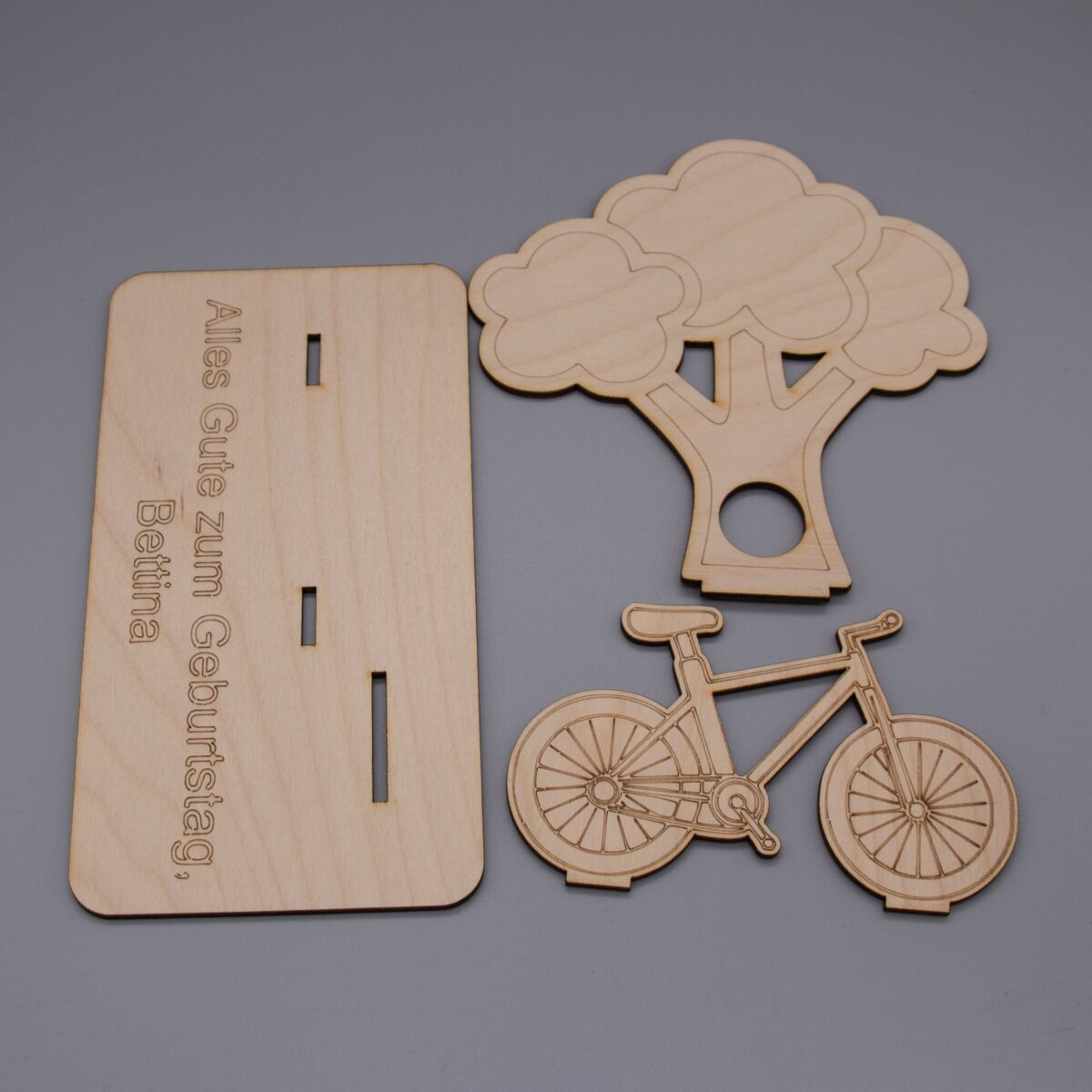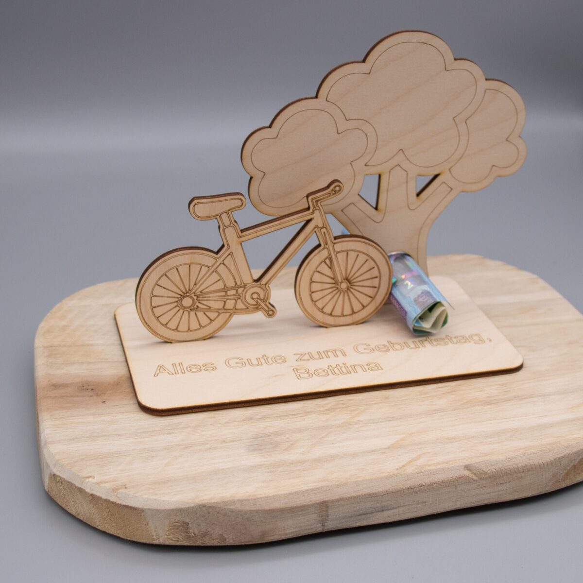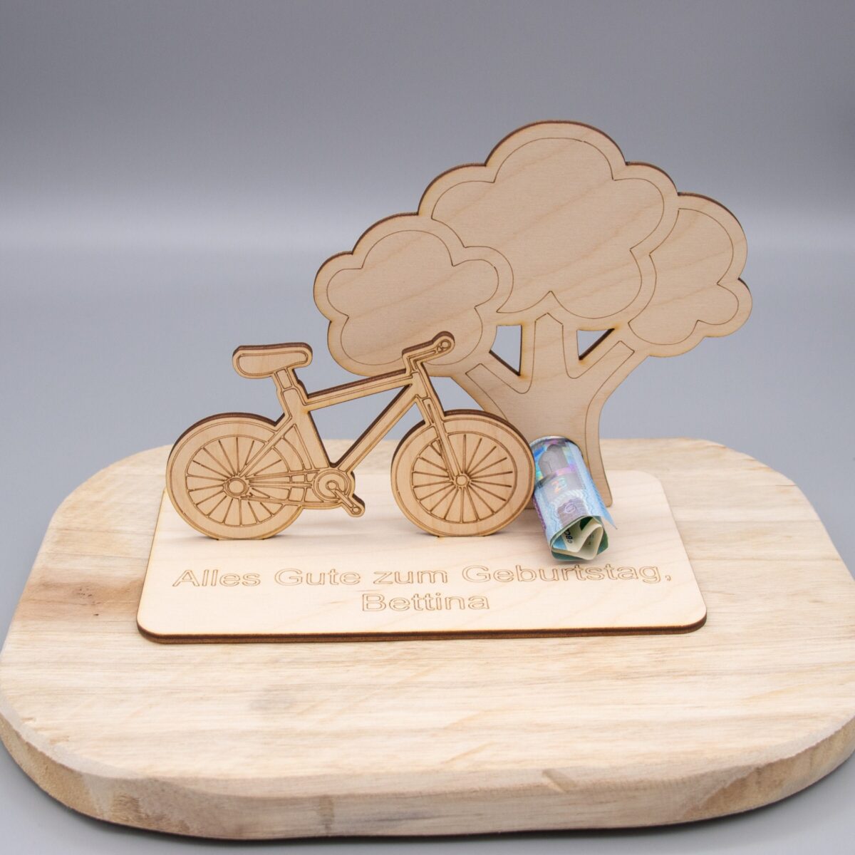 Verschenke Geld mal anders – mit unserem liebevoll designten Holzaufsteller „Fahrrad mit Baum“. Dieses besondere Geldgeschenk besteht aus mehreren präzise gelaserten Holzteilen, die sich ganz einfach zusammenstecken oder kleben lassen. So entsteht im Handumdrehen ein dekoratives kleines Kunstwerk, das nicht nur das Geld stilvoll in Szene setzt, sondern auch lange in Erinnerung bleibt.