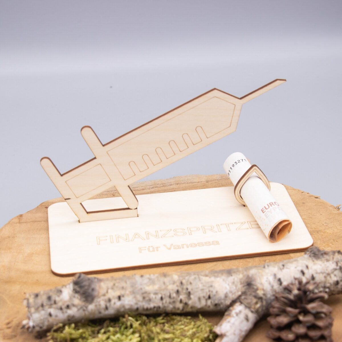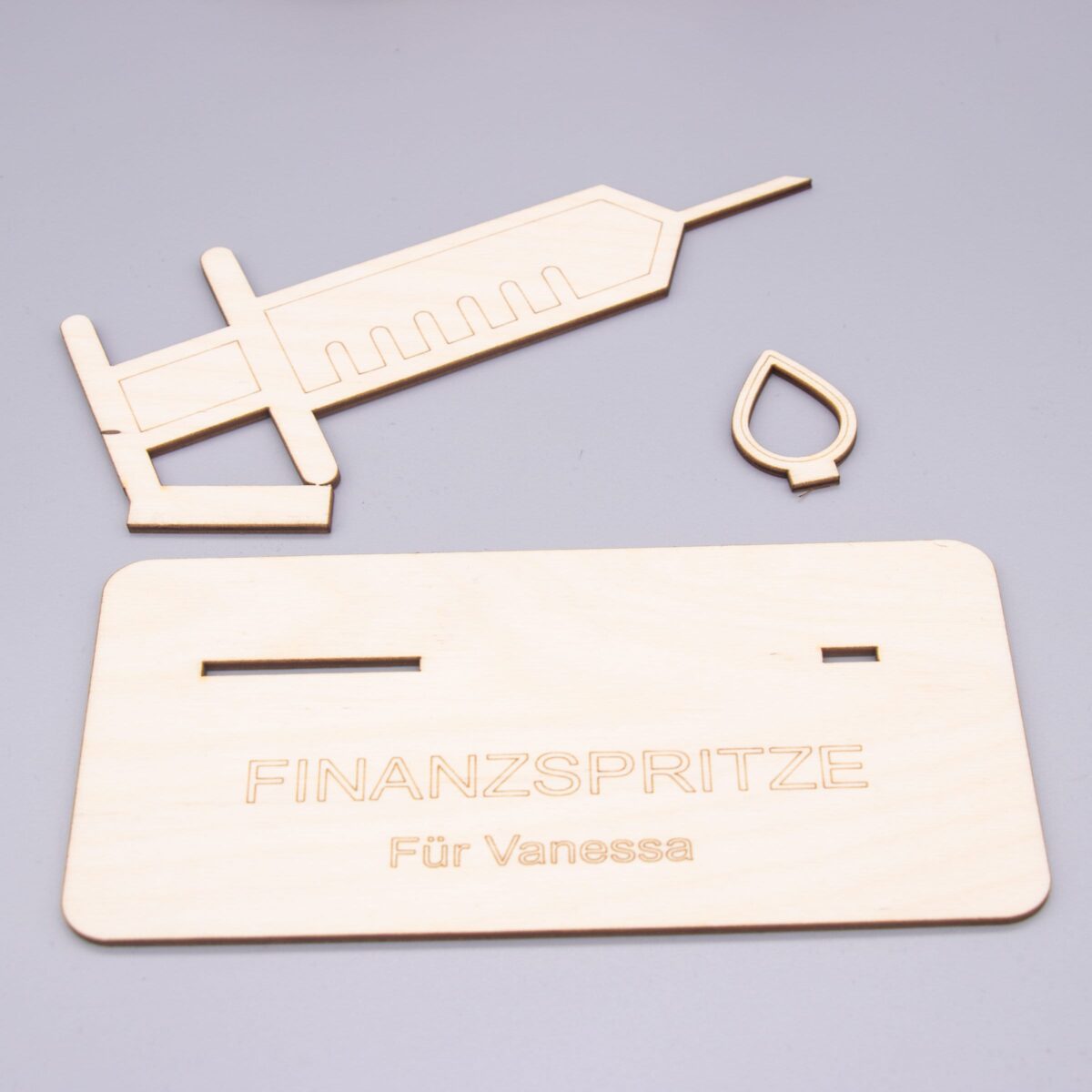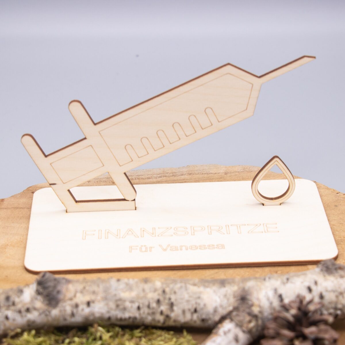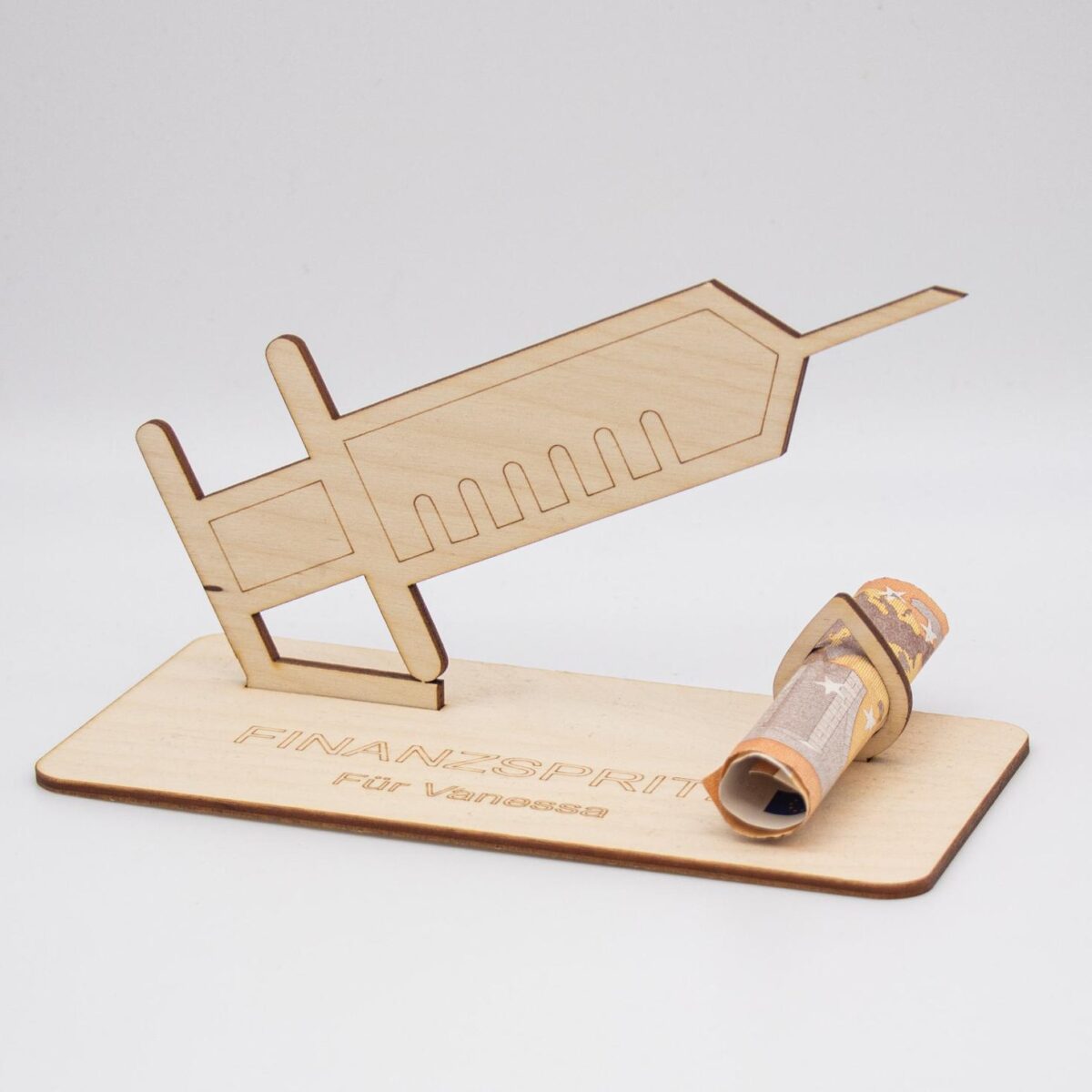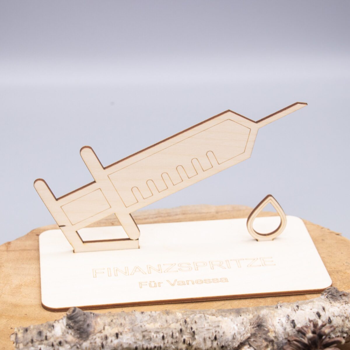 Du suchst nach einer kreativen Art, Geld zu verschenken? Dann ist unser Holzaufsteller „Finanzspritze“ genau das Richtige! Dieses liebevoll gestaltete DIY-Geldgeschenk besteht aus mehreren Einzelteilen, die ganz einfach zusammengesteckt oder geklebt werden können – perfekt für Bastelfans und alle, die eine persönliche Note lieben.