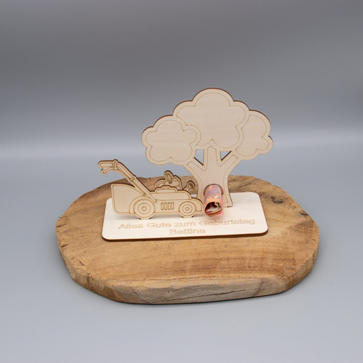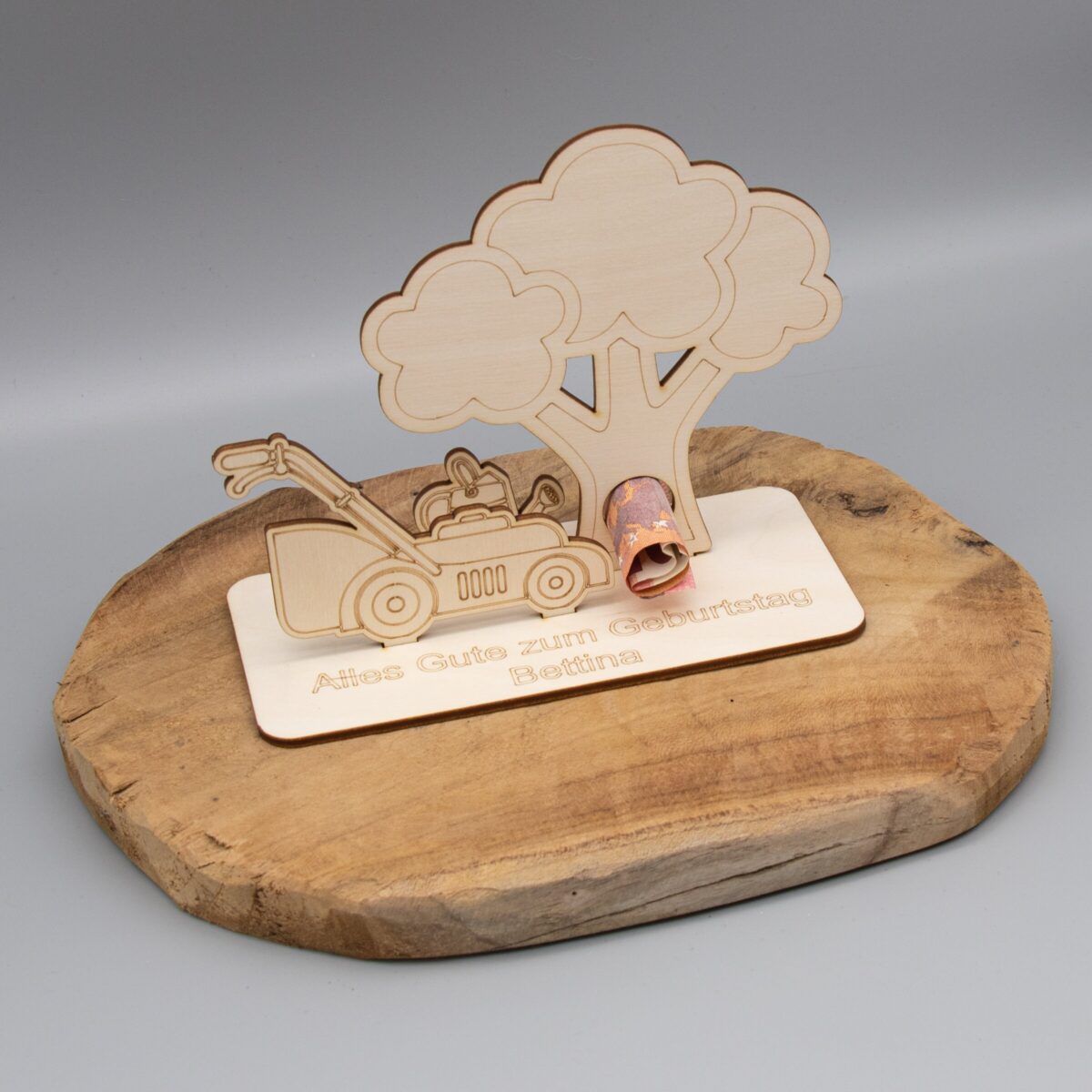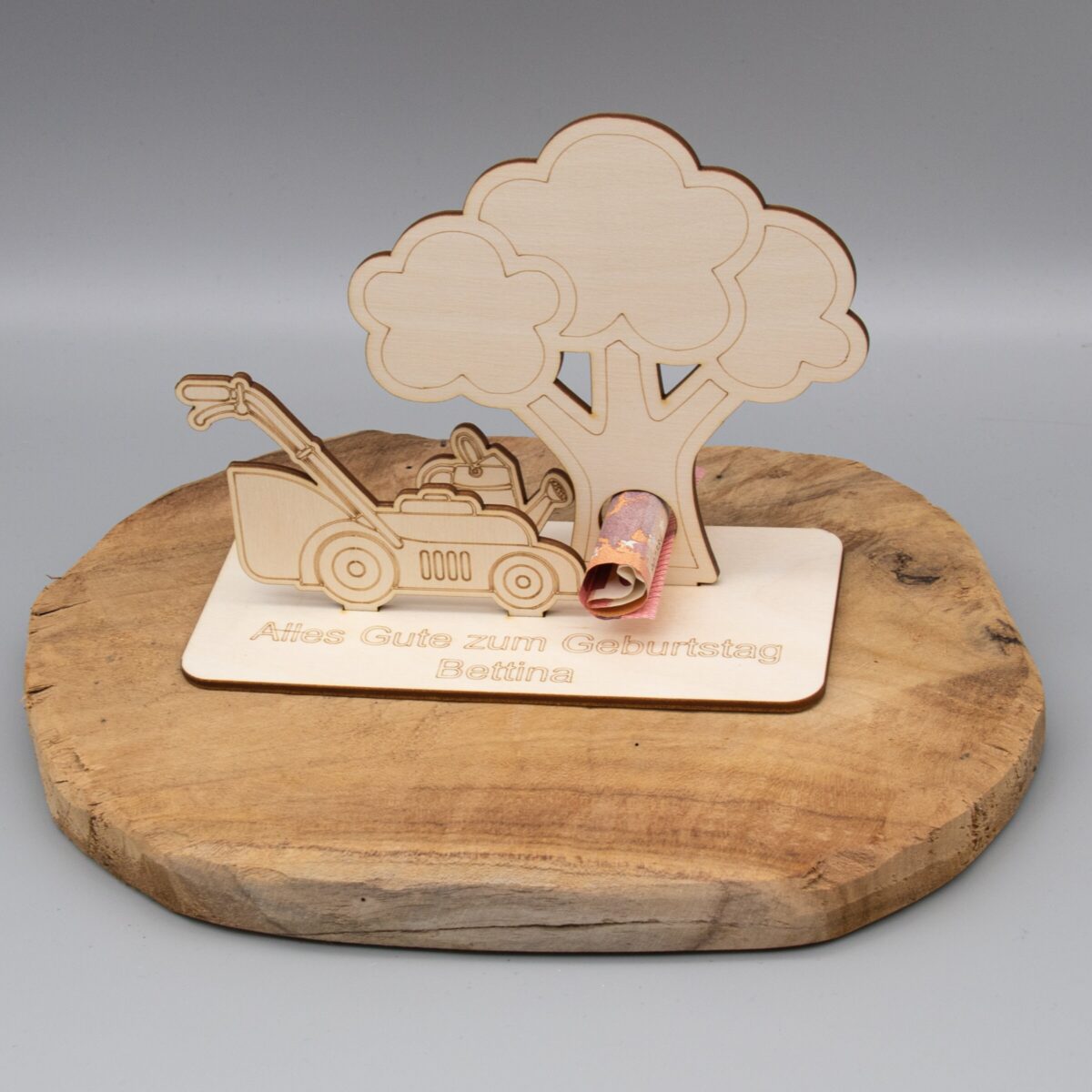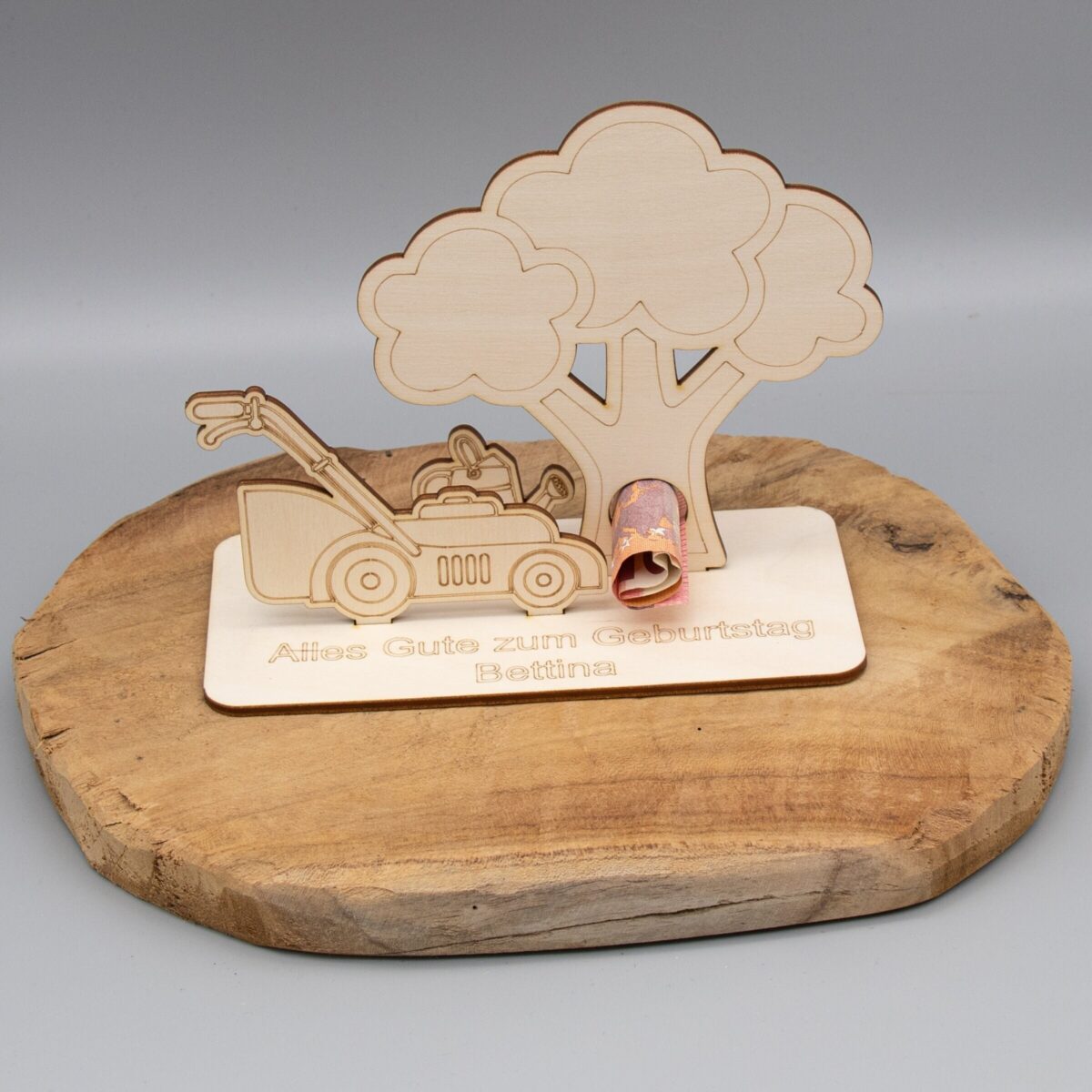 Entdecken Sie unser einzigartiges, handgefertigtes Geldgeschenk, das kunstvoll aus 3 mm dickem Birkensperrholz gefertigt und mit höchster Präzision lasergraviert wurde. Dieses exklusive Kunstwerk, perfekt für Gartenliebhaber und Naturfreunde, verbindet Ästhetik mit Funktion und bietet eine kreative Möglichkeit, Geld zu verschenken.