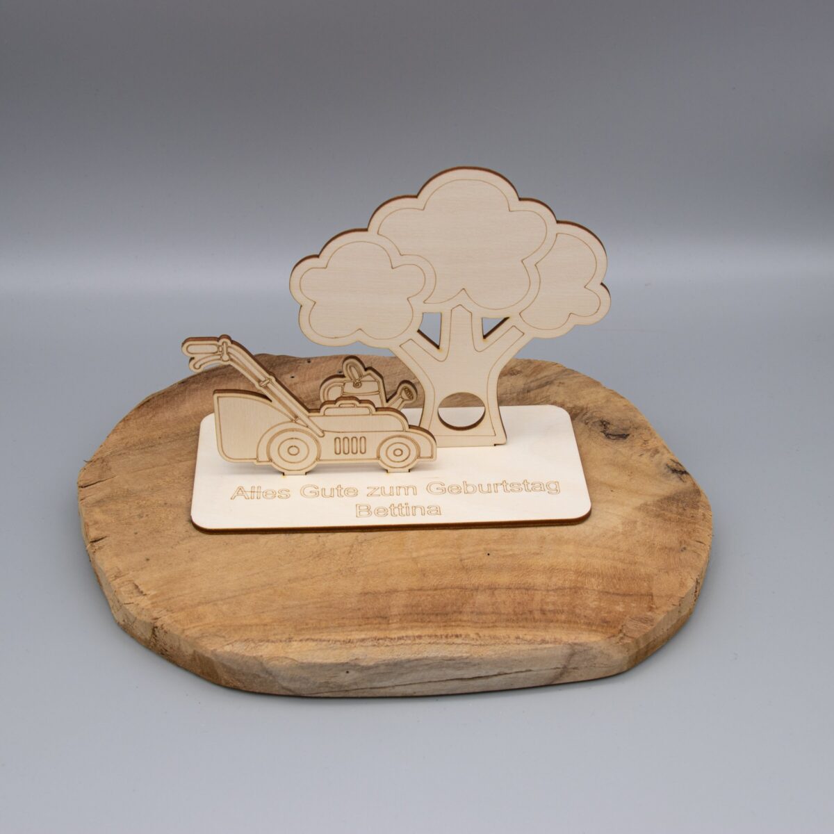 Unser Gartenmotiv ist sorgfältig durchdacht und symbolisiert die ruhige und blühende Atmosphäre eines Gartens. Der zentral platzierte Baum steht für Wachstum und Entwicklung, während die liebevoll gravierte Gießkanne die Fürsorge und Pflege symbolisiert, die ein Garten benötigt. Ein detailreich dargestellter Rasenmäher rundet das Design ab und steht für die Mühe und Arbeit, die in die Pflege eines prächtigen Gartens investiert wird.