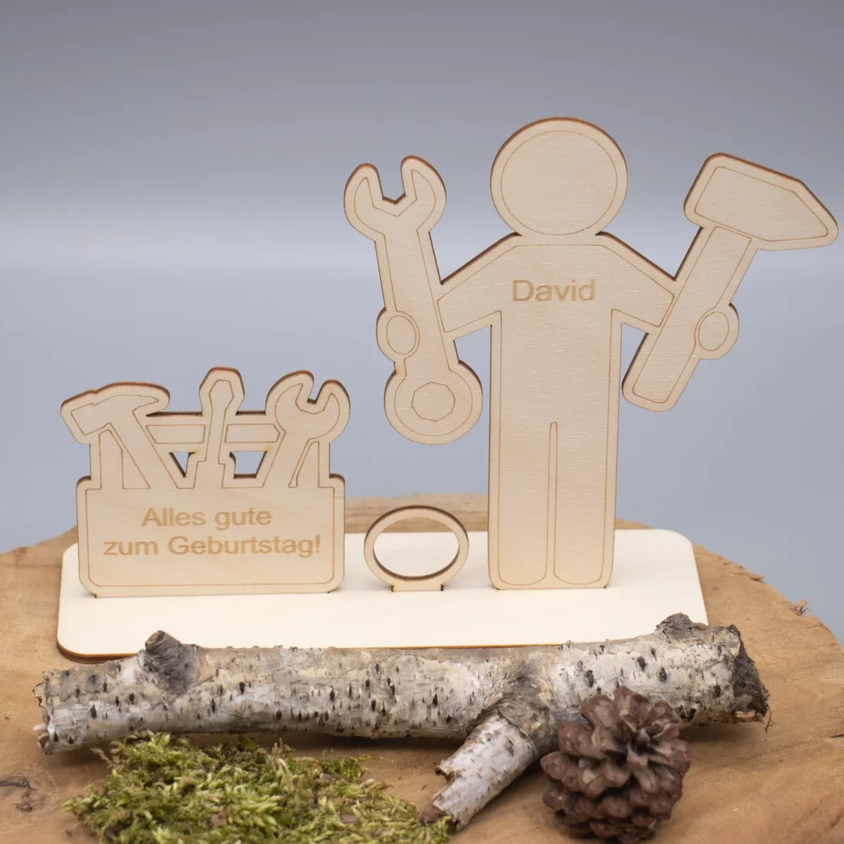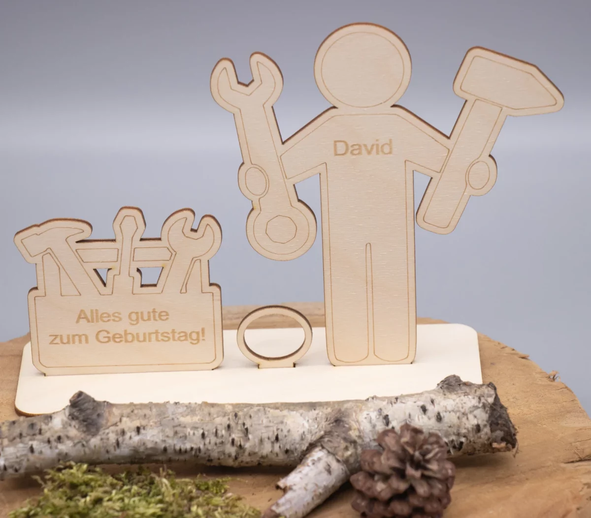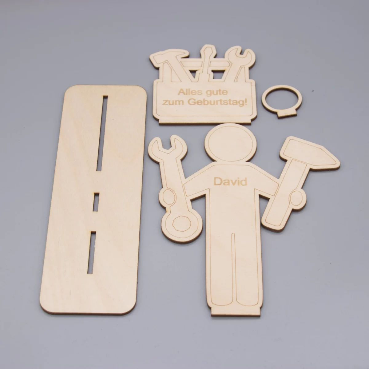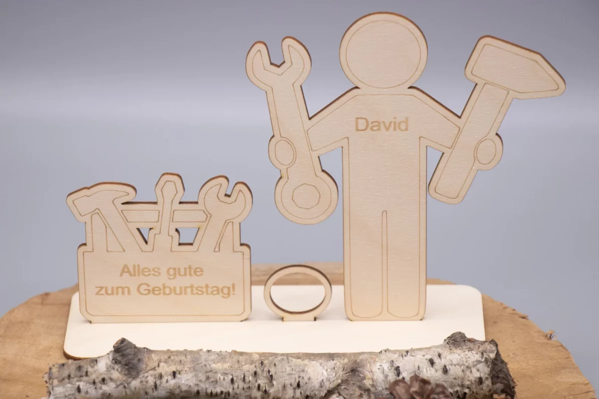 Das Set besteht aus mehreren hochwertig gelaserten Holzteilen, die ganz einfach zusammengesteckt oder mit etwas Kleber fixiert werden können. Im Mittelpunkt steht eine charmante Handwerkerfigur mit Werkzeugkasten – detailreich und mit einem Augenzwinkern gestaltet.