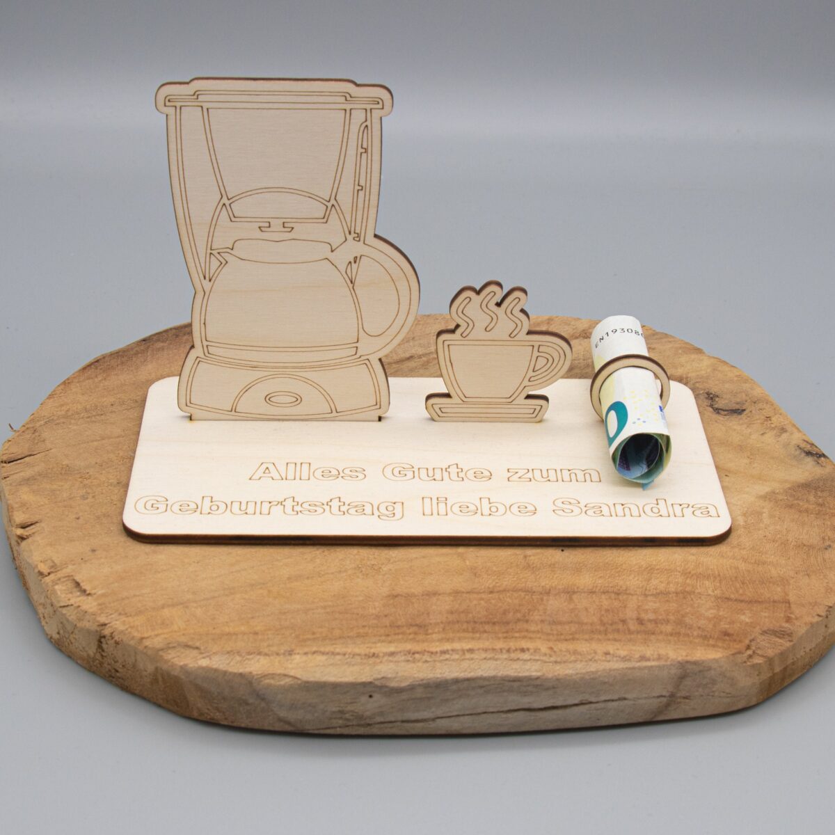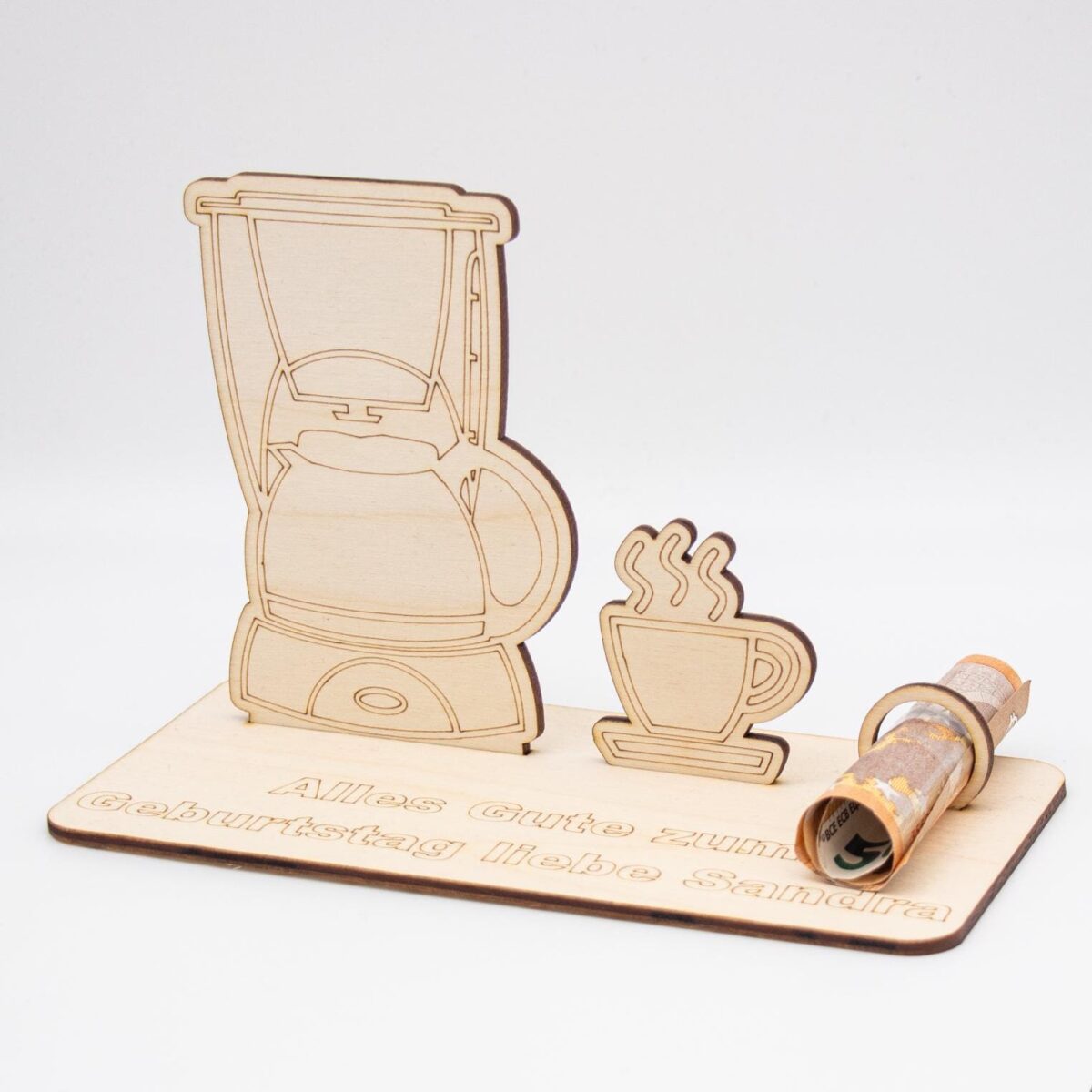 Unser Geldgeschenk aus 3 mm Birkensperrholz bietet nicht nur eine stilvolle Präsentation für Geldscheine, sondern kann auch als dekoratives Element in jedem Zuhause dienen. Es kann an der Wand aufgehängt oder auf einem Regal platziert werden, um eine wunderbare Erinnerung an den besonderen Anlass zu schaffen.