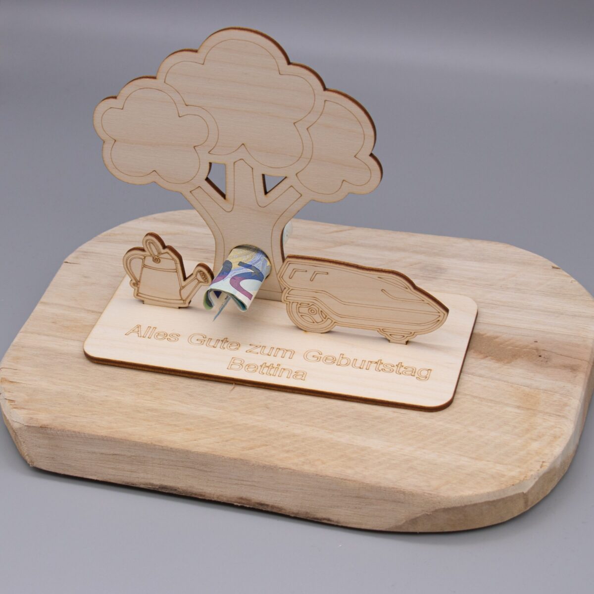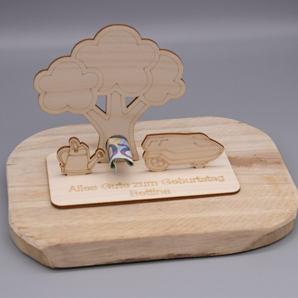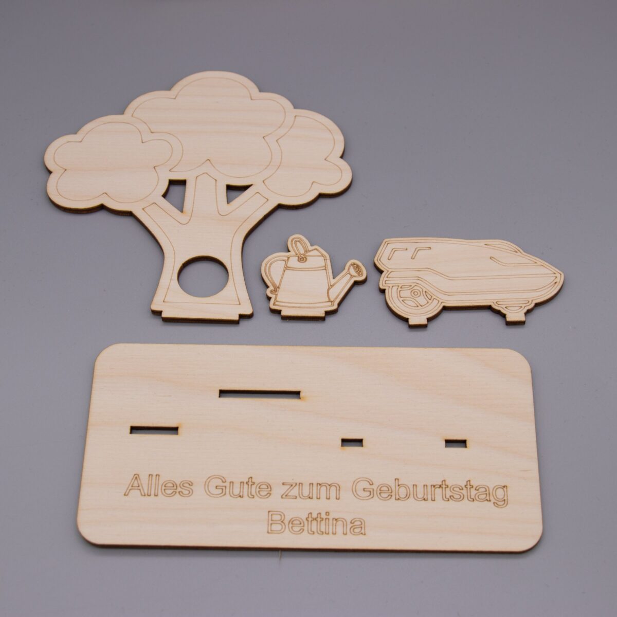 Auf der Suche nach einem einzigartigen und kreativen Geldgeschenk? Entdecke „Der blühende Garten“, ein meisterhaft hergestelltes Geldgeschenk aus 3mm dickem Birkensperrholz, präzise und kunstvoll mit Laser geschnitten.