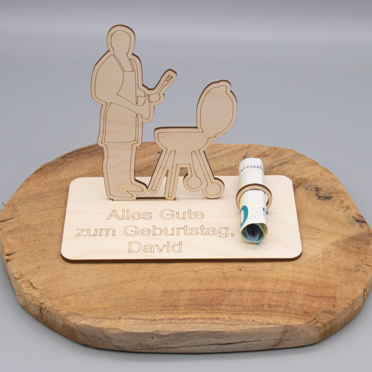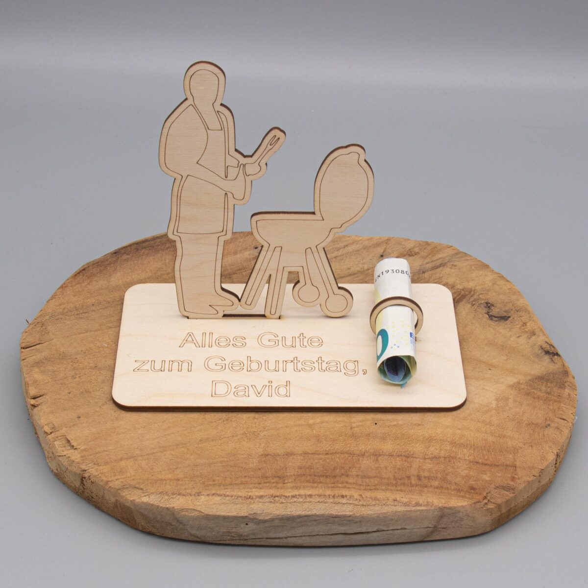 Auf der Grundplatte hast du die Möglichkeit, eine individuelle Gravur hinzufügen zu lassen – z. B. mit Namen, Glückwünschen oder einem witzigen Spruch. So wird das Geldgeschenk zu einem ganz persönlichen Highlight!