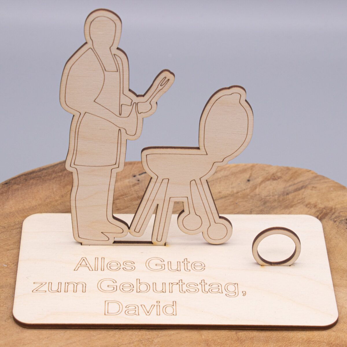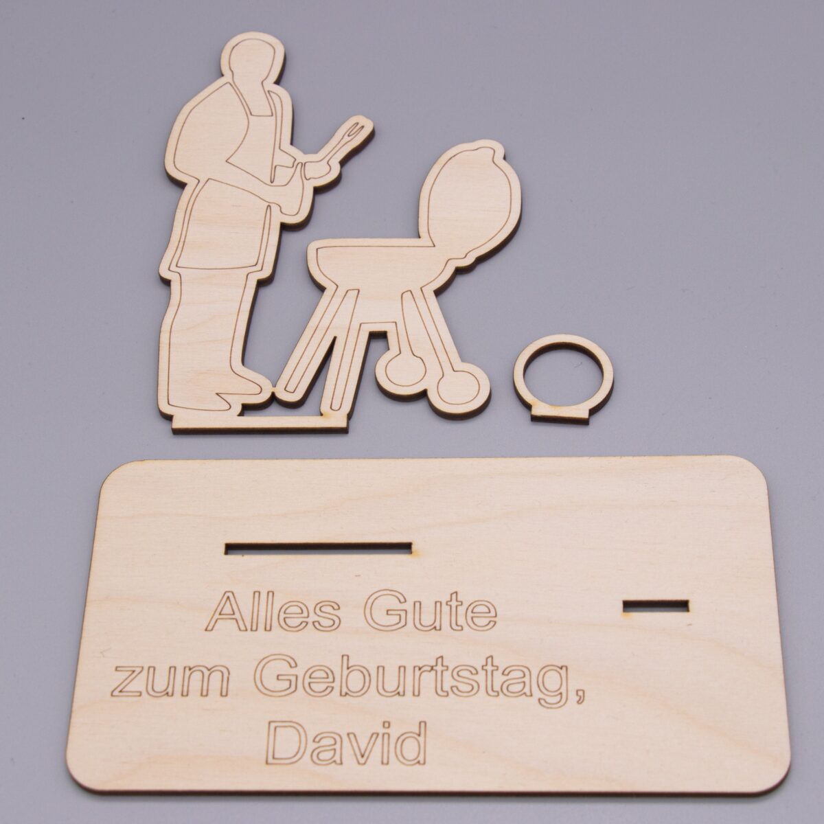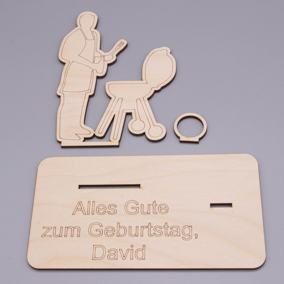 Der Aufsteller besteht aus mehreren präzise gelaserten Holzteilen, die ganz einfach zusammengesteckt oder nach Wunsch auch geklebt werden können. Das zentrale Motiv zeigt einen Mann am Grill – mit typischen Details wie Grillzange, Grillgut und jeder Menge guter Laune.