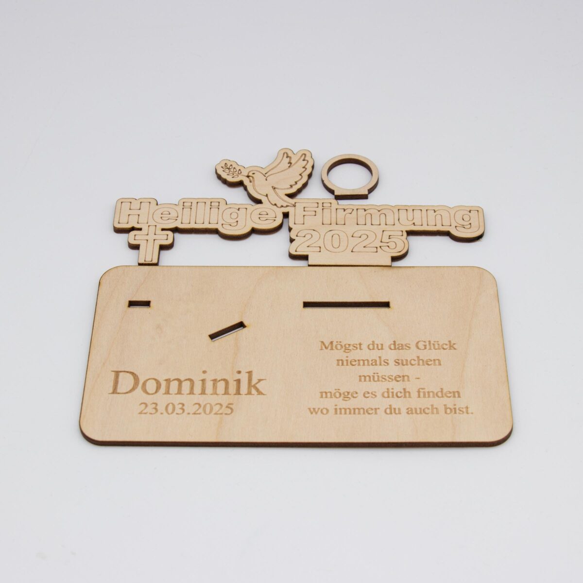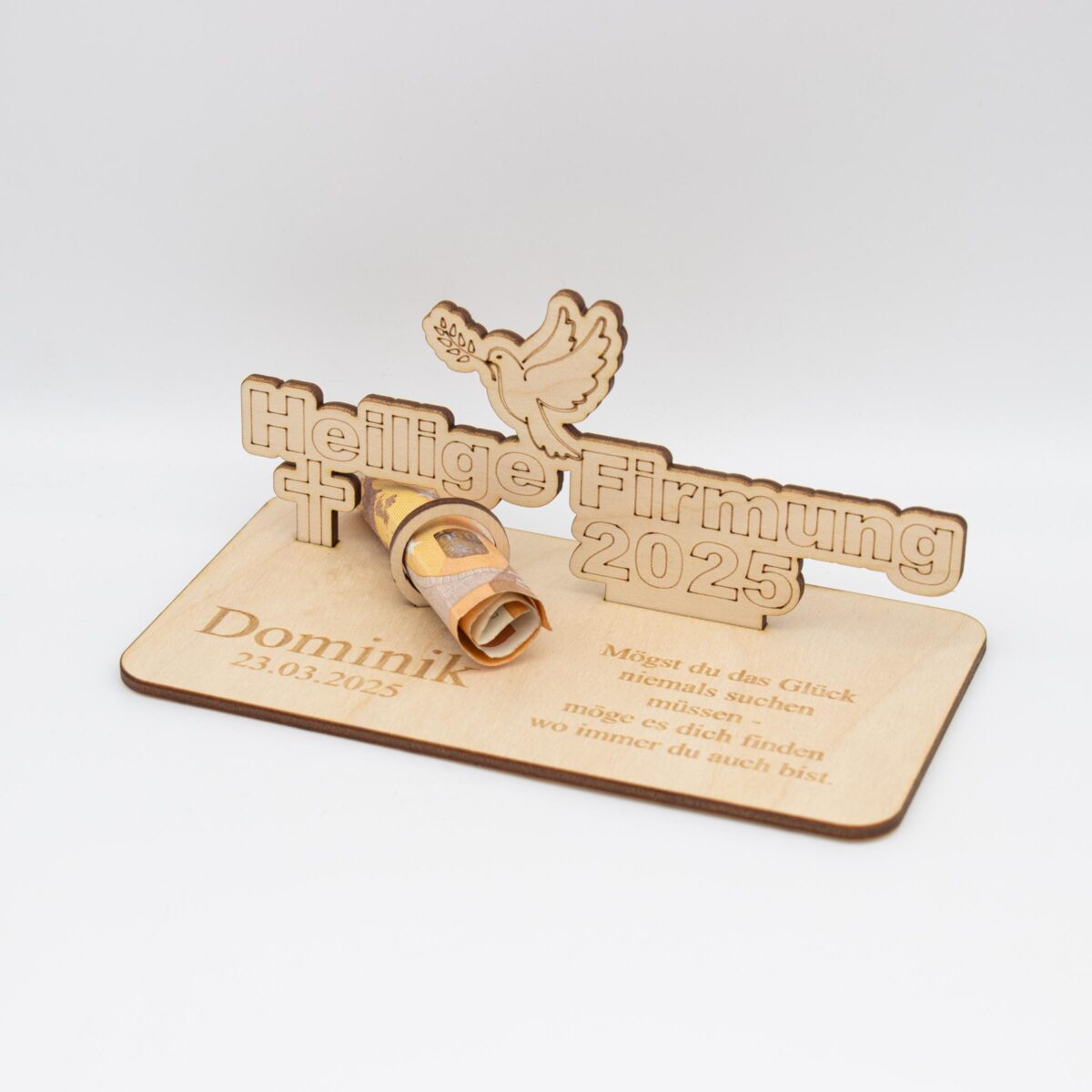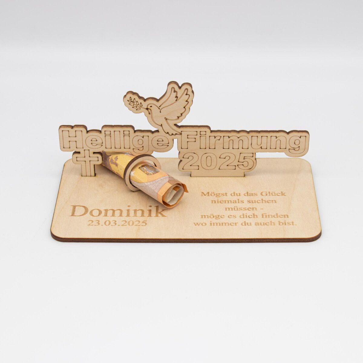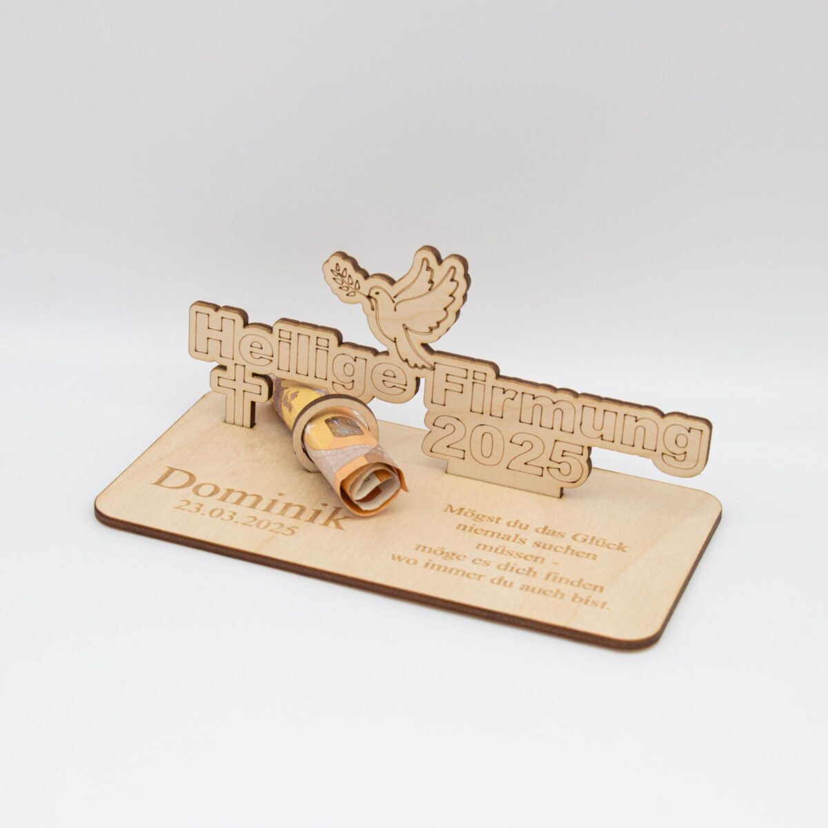 Du suchst ein besonderes Geldgeschenk zur Heiligen Firmung? Unser liebevoll gestalteter Holzaufsteller ist die perfekte Mischung aus Symbolik, Kreativität und persönlicher Note.