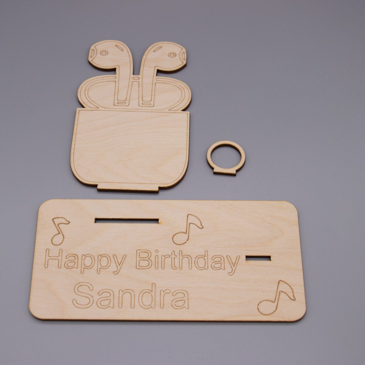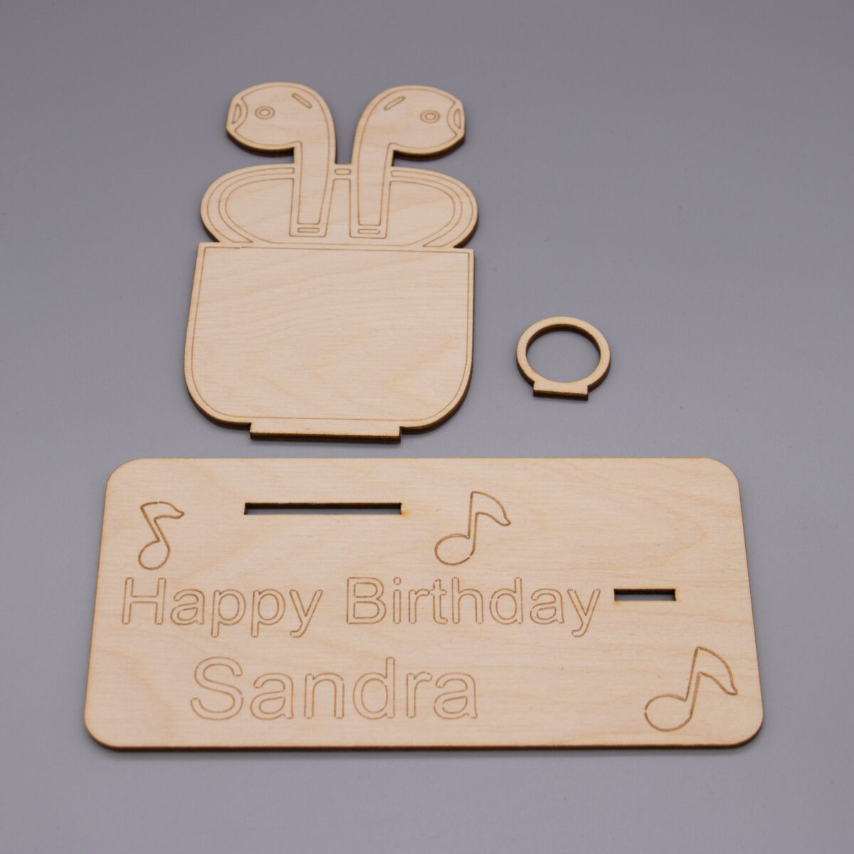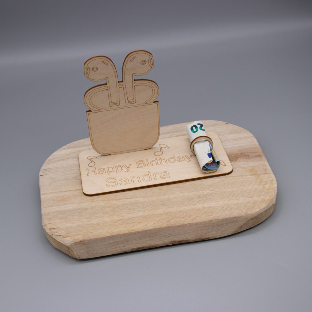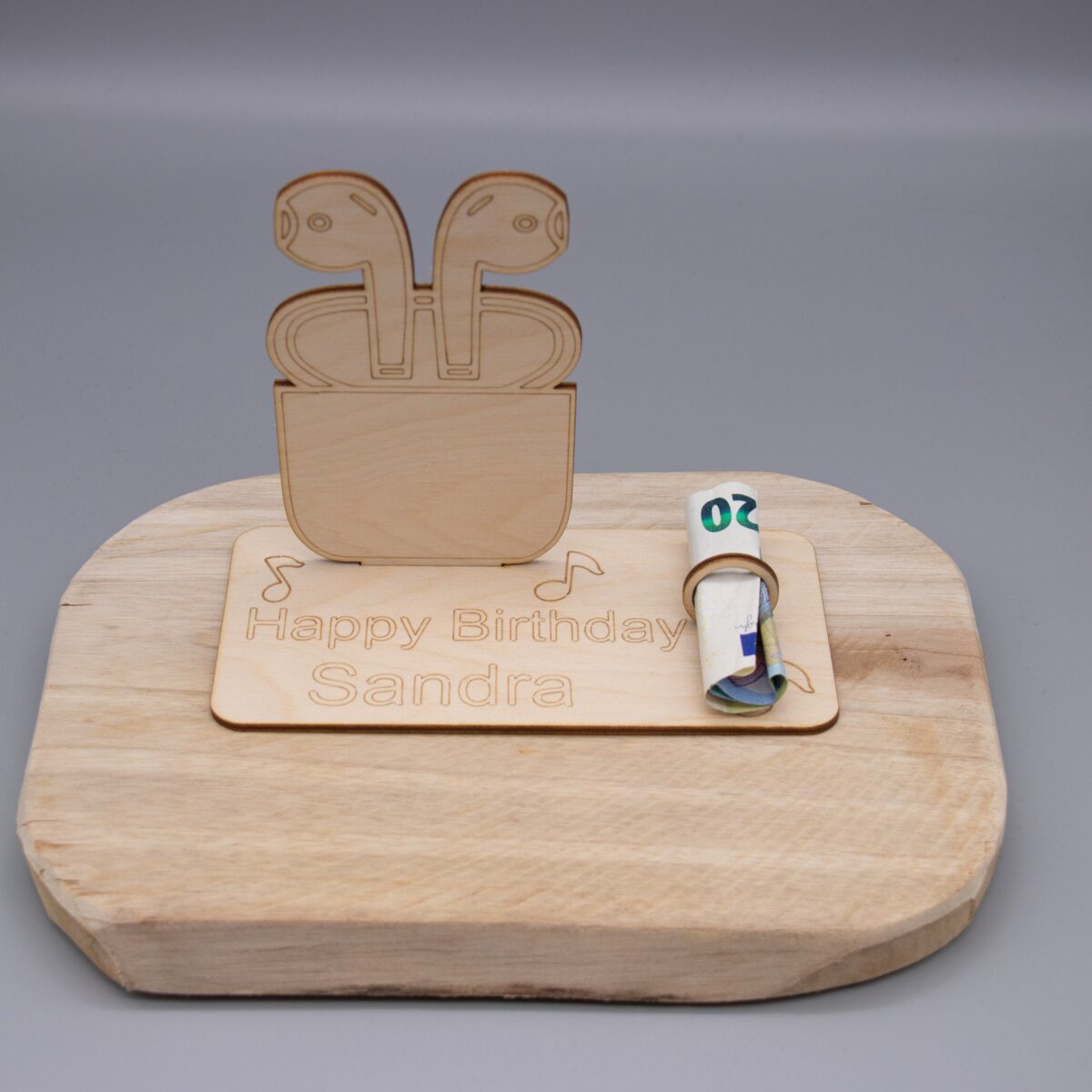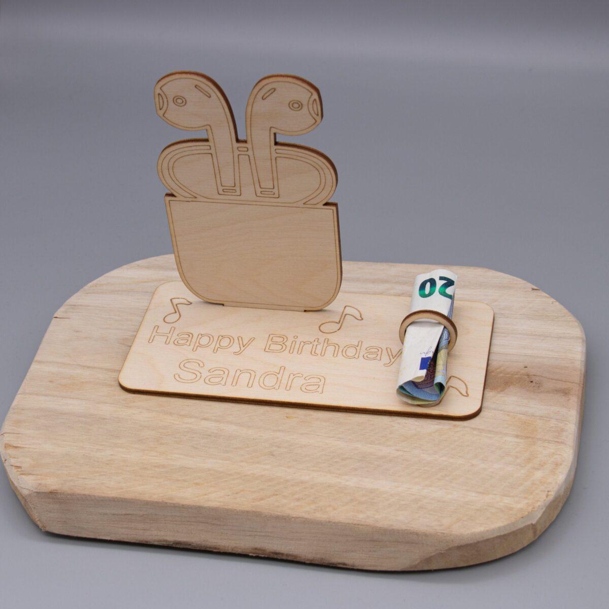 Dieses originelle Geldgeschenk aus hochwertigem 3 mm Holz ist nicht nur eine kreative Verpackung für Geldscheine, sondern auch ein echter Hingucker! Das Motiv zeigt kabellose Kopfhörer – modern, stilvoll und ideal für Geburtstage, Weihnachten, Abschlussfeiern oder jeden Anlass, bei dem Musik eine Rolle spielt.