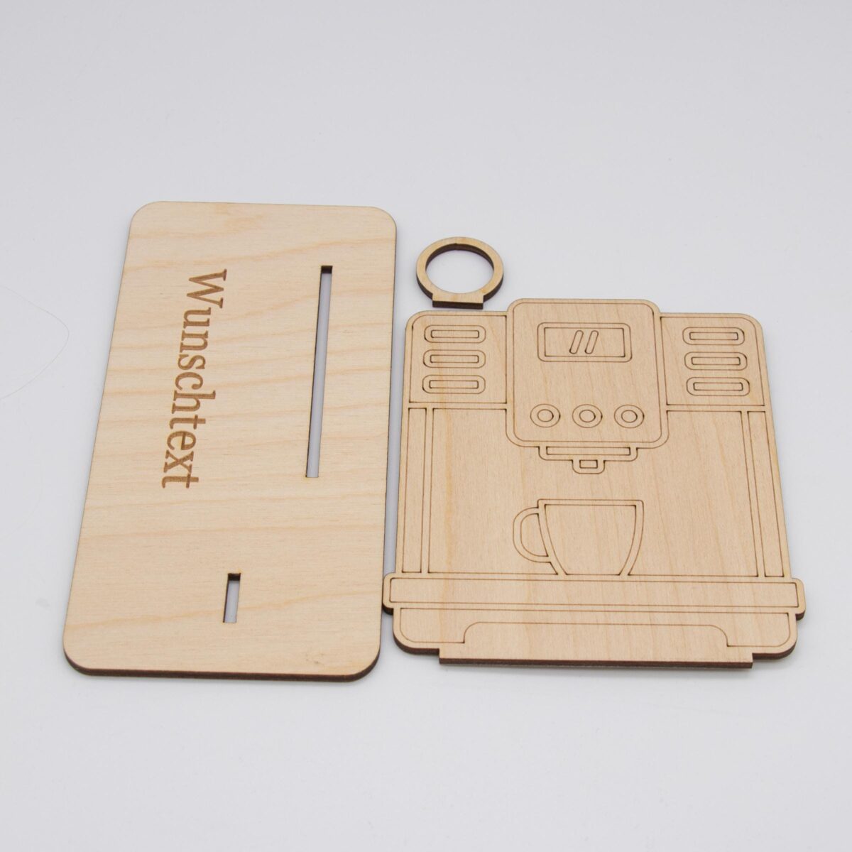 Gefertigt aus hochwertigem 3 mm Birkenholz, besteht das Motiv aus mehreren präzise gelaserten Einzelteilen. Diese können ganz einfach ineinandergesteckt oder bei Bedarf verklebt werden. So entsteht Schritt für Schritt ein dekorativer Kaffeevollautomat, der das Geldgeschenk stilvoll in Szene setzt.