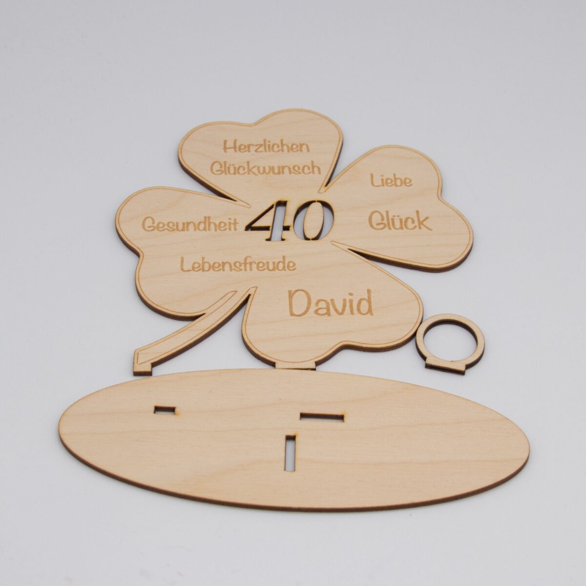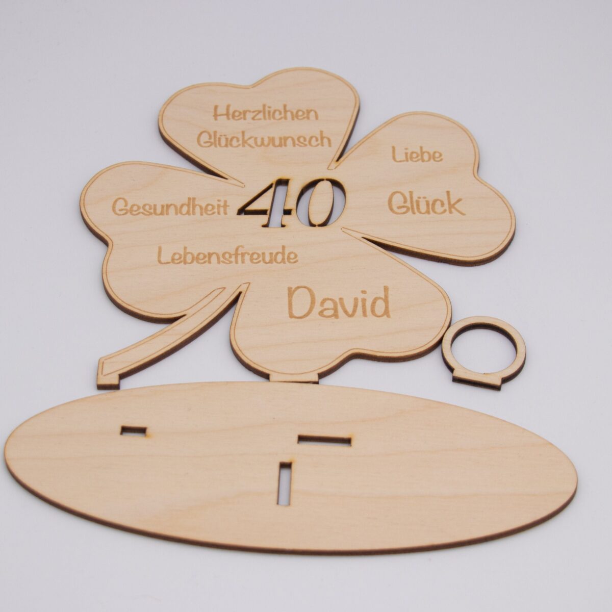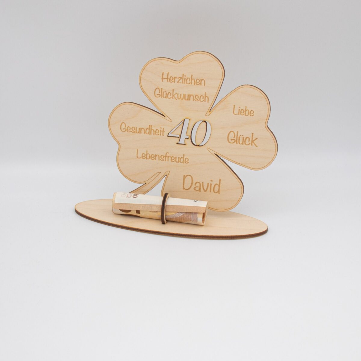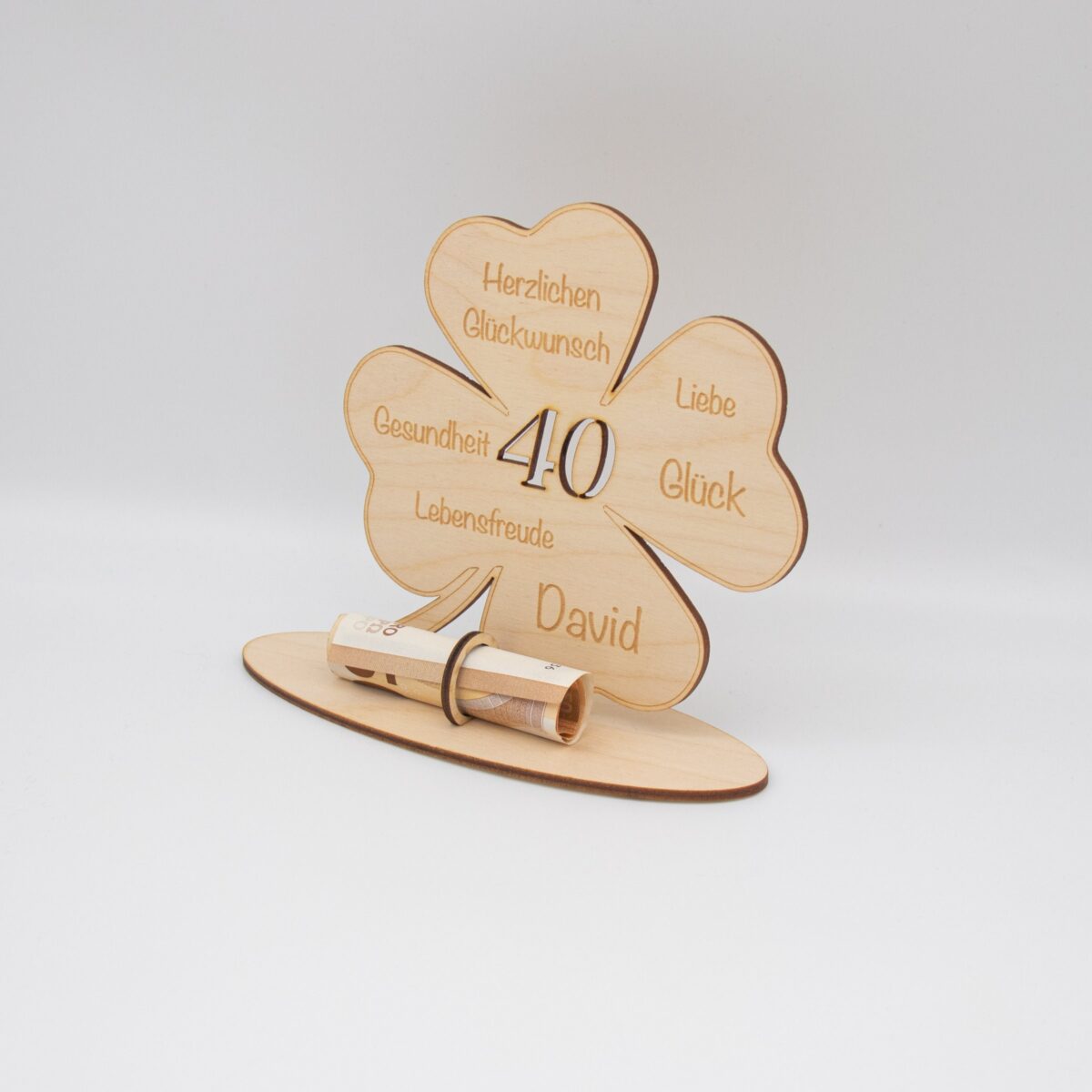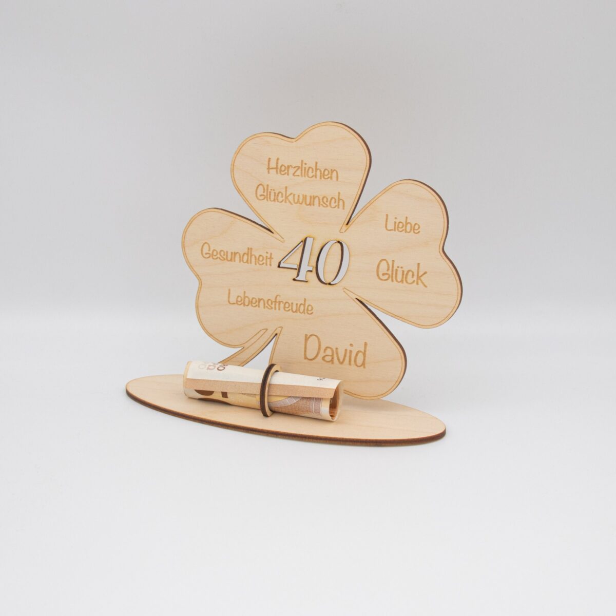 Dieses liebevoll gestaltete Geldgeschenk aus 3 mm starkem Birkenholz ist eine besondere Art, Glückwünsche und ein Geldgeschenk stilvoll zu verbinden. Das Motiv zeigt ein Kleeblatt als Symbol für Glück, ergänzt durch eine gravierte Glücksbotschaft und eine ausgeschnittene Zahl passend zum Geburtstag oder einem anderen Jubiläum.