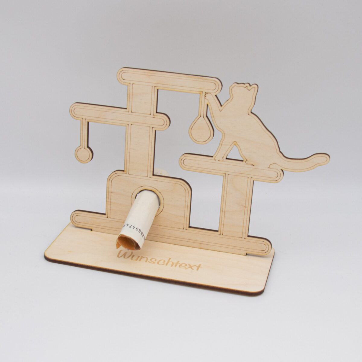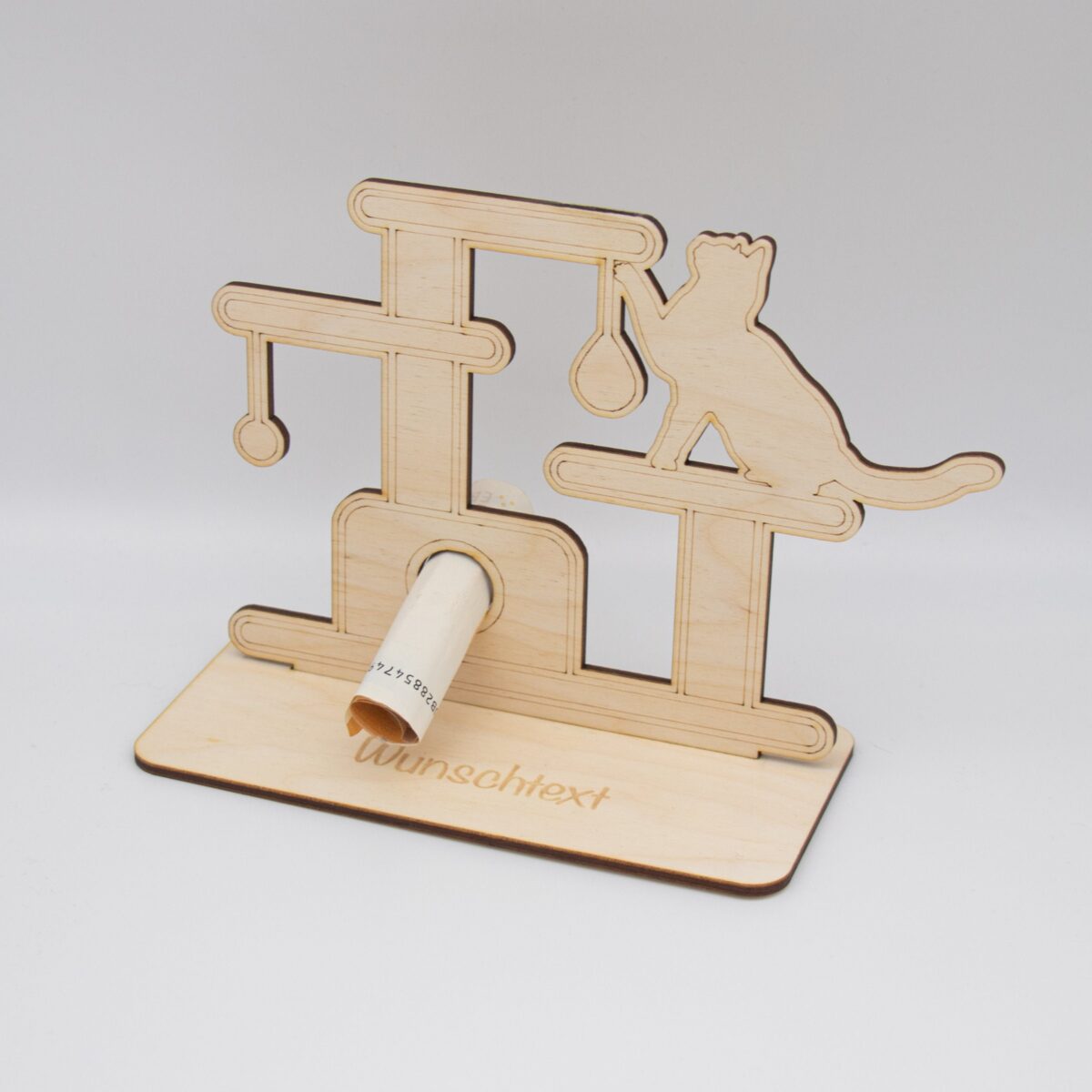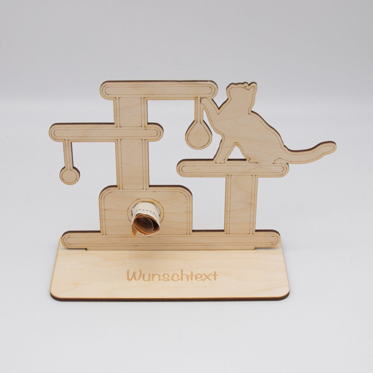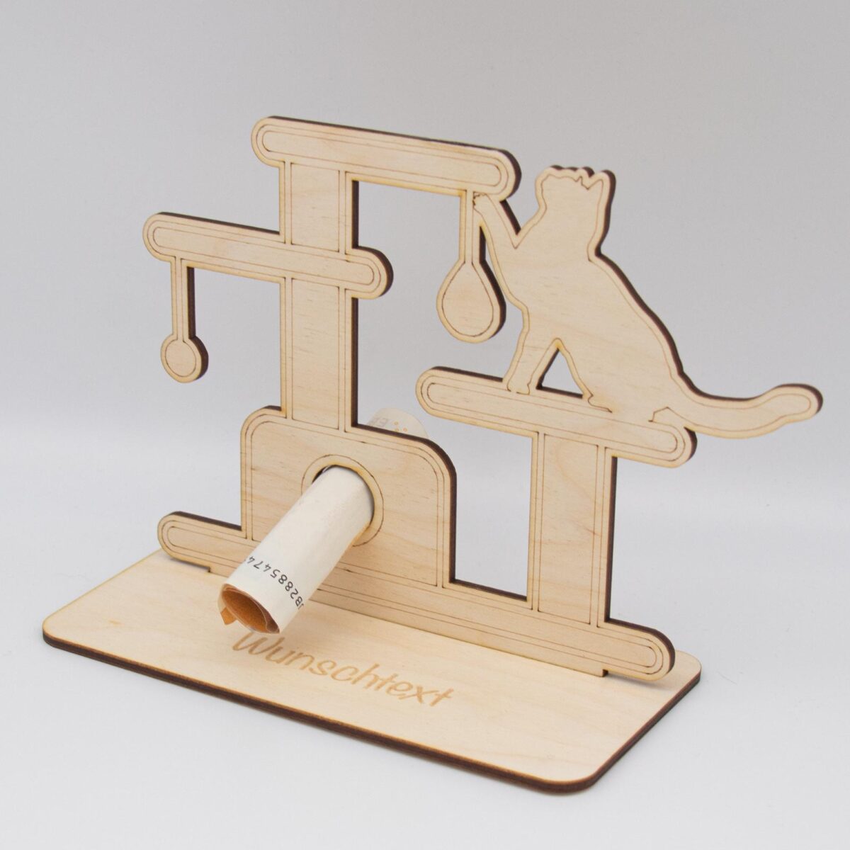 Schenken Sie Geld auf originelle und stilvolle Weise mit unserem einzigartigen Geldgeschenk aus 3mm unbehandeltem Birkensperrholz, das mit einem Kratzbaummotiv versehen ist. Dieses sorgfältig gefertigte Geschenk vereint Handwerkskunst und Funktionalität, um jedem Anlass eine besondere Note zu verleihen.