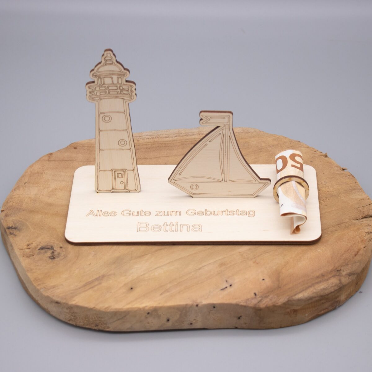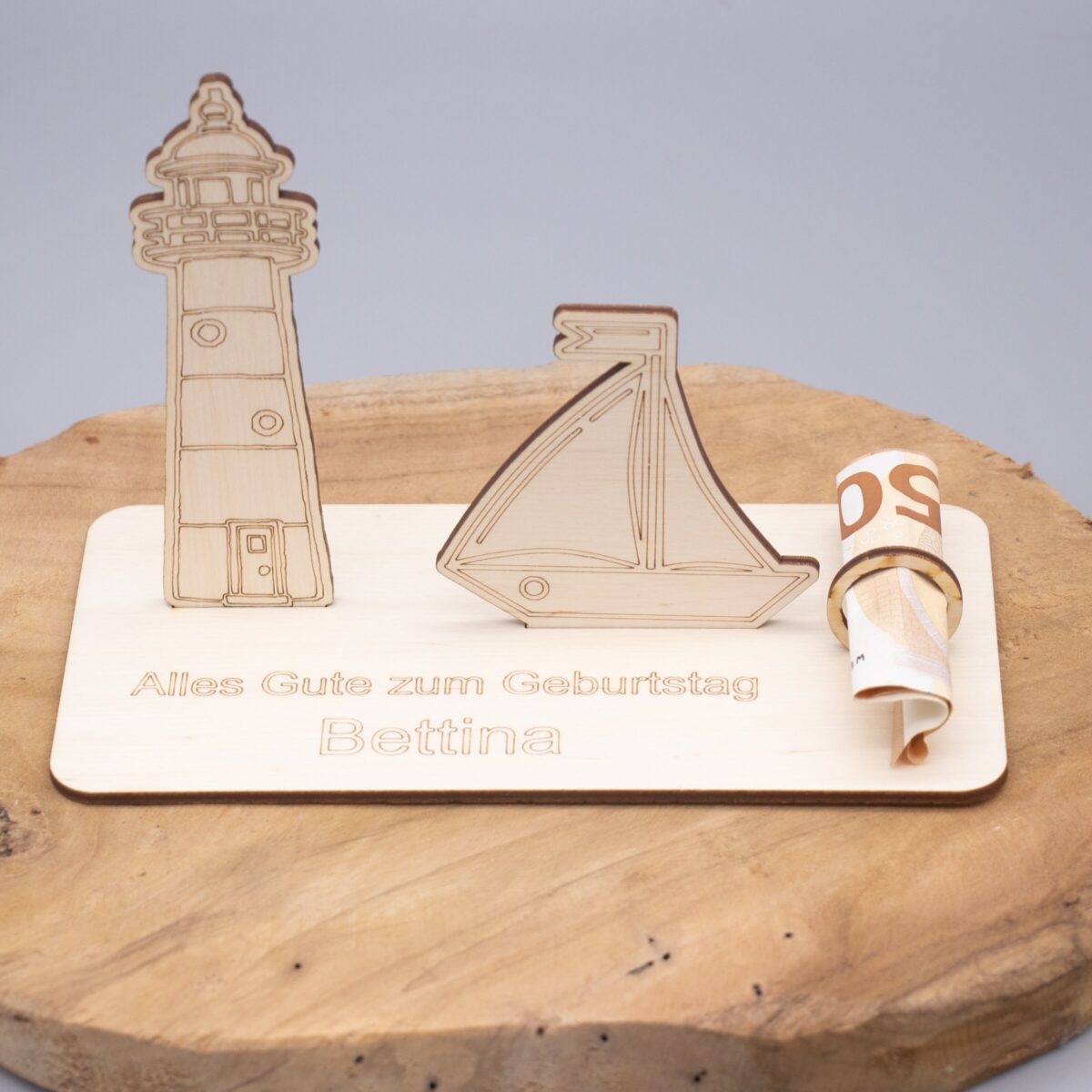 Du suchst nach einer originellen Möglichkeit, Geld stilvoll und persönlich zu verschenken? Unser liebevoll gestalteter Holzaufsteller mit maritimem Leuchtturm-Motiv ist die perfekte Wahl!