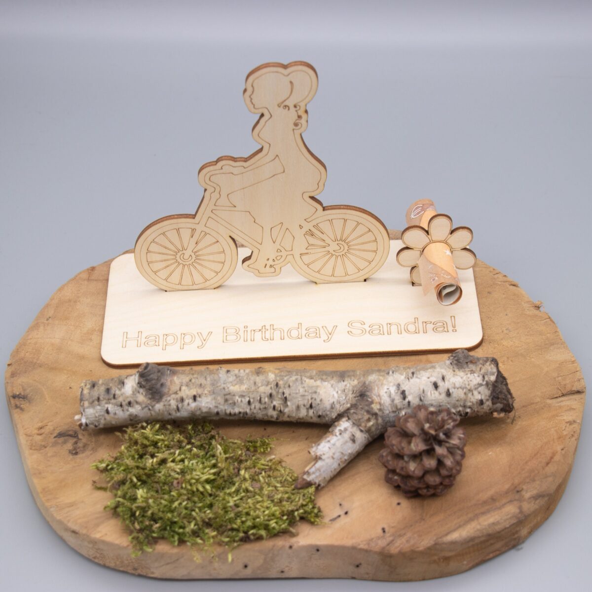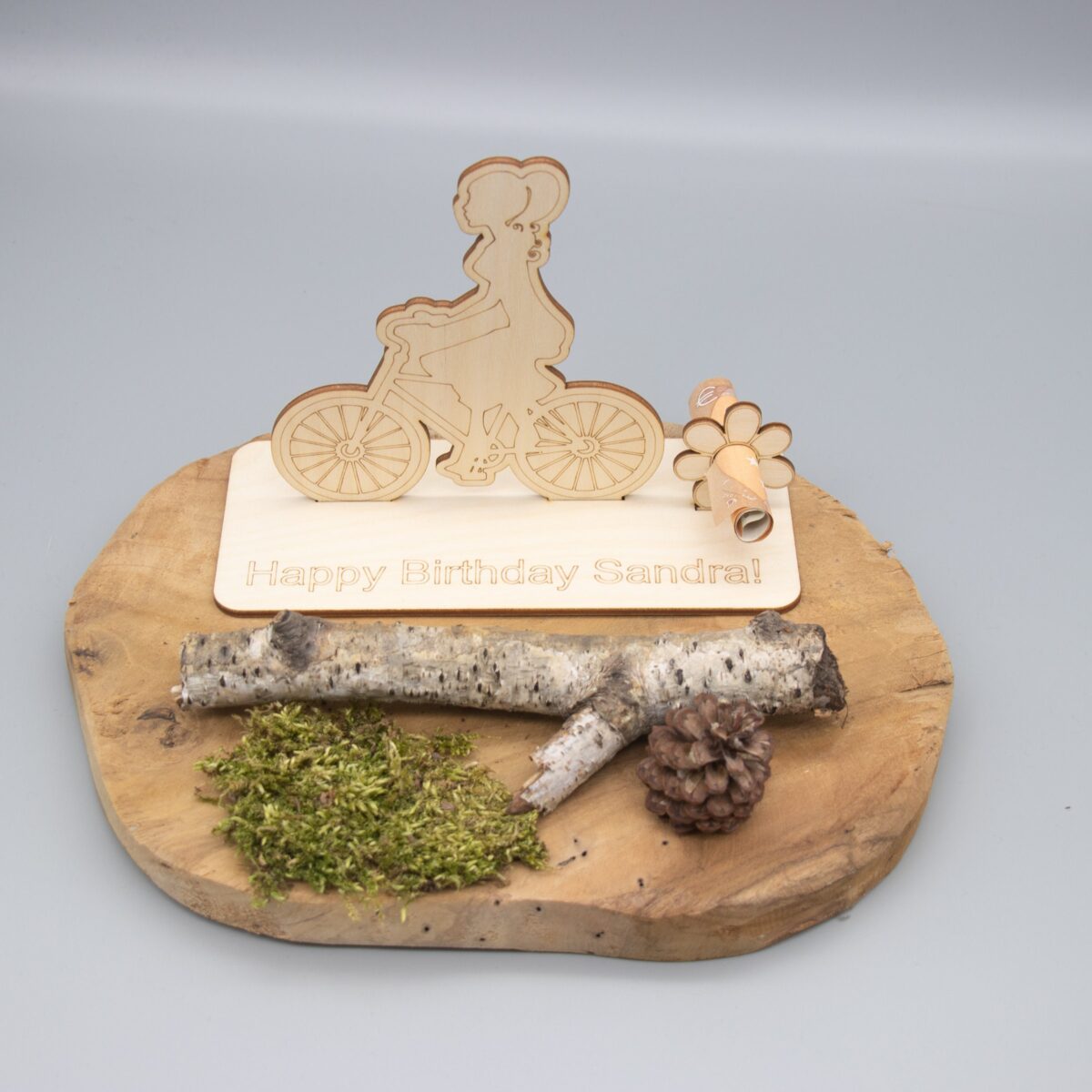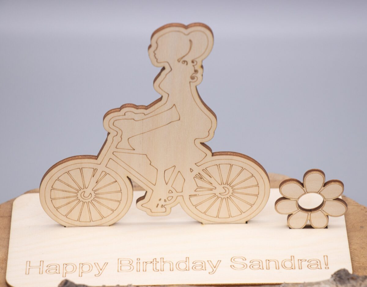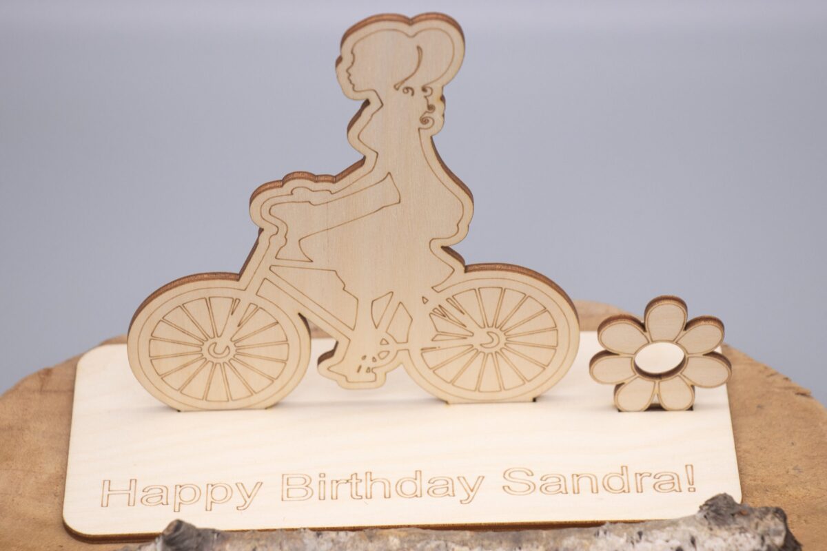 Geldgeschenk mit Fahrradfahrerin – aus Holz personalisiert