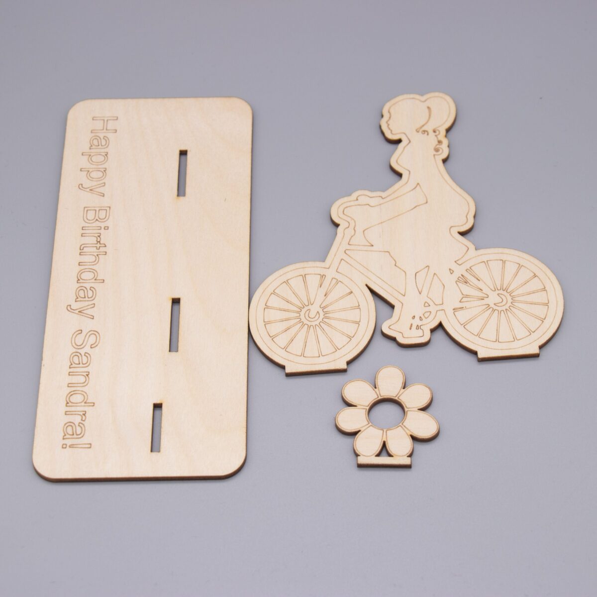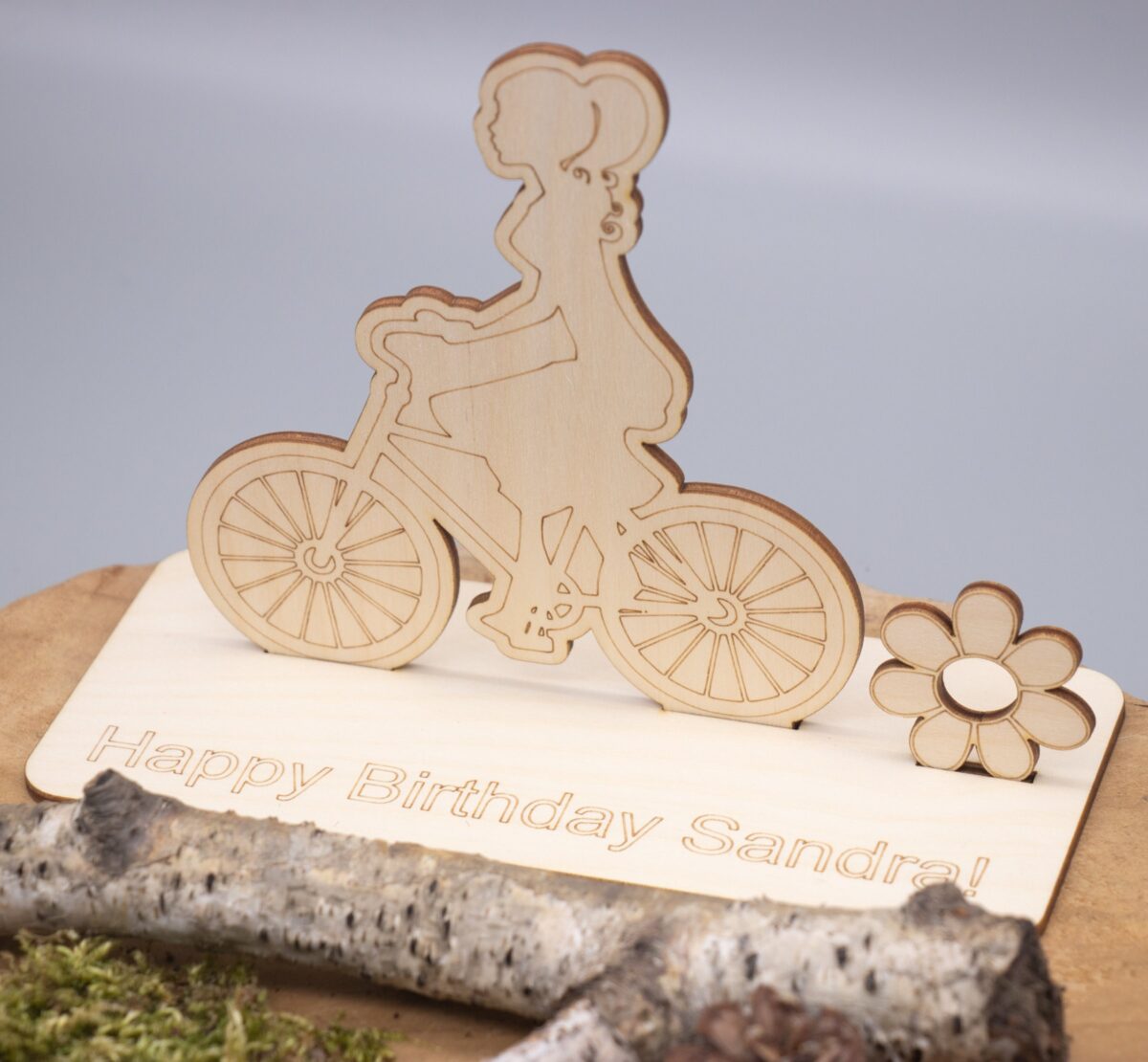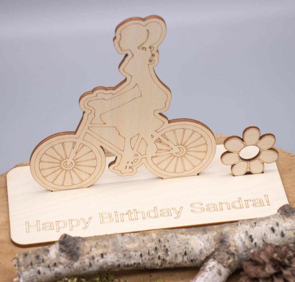 Geldgeschenk mit Fahrradfahrerin – aus Holz personalisiert