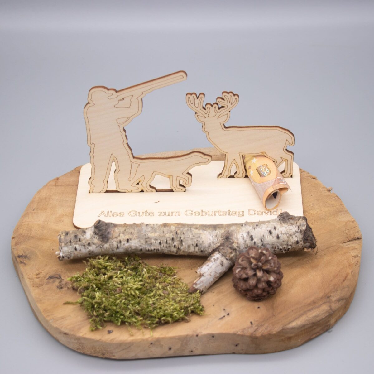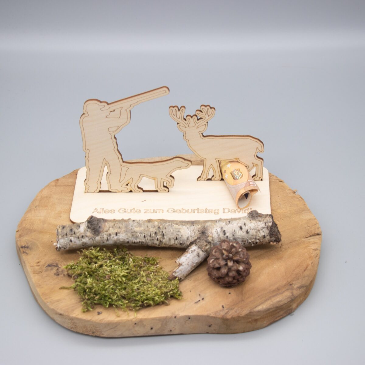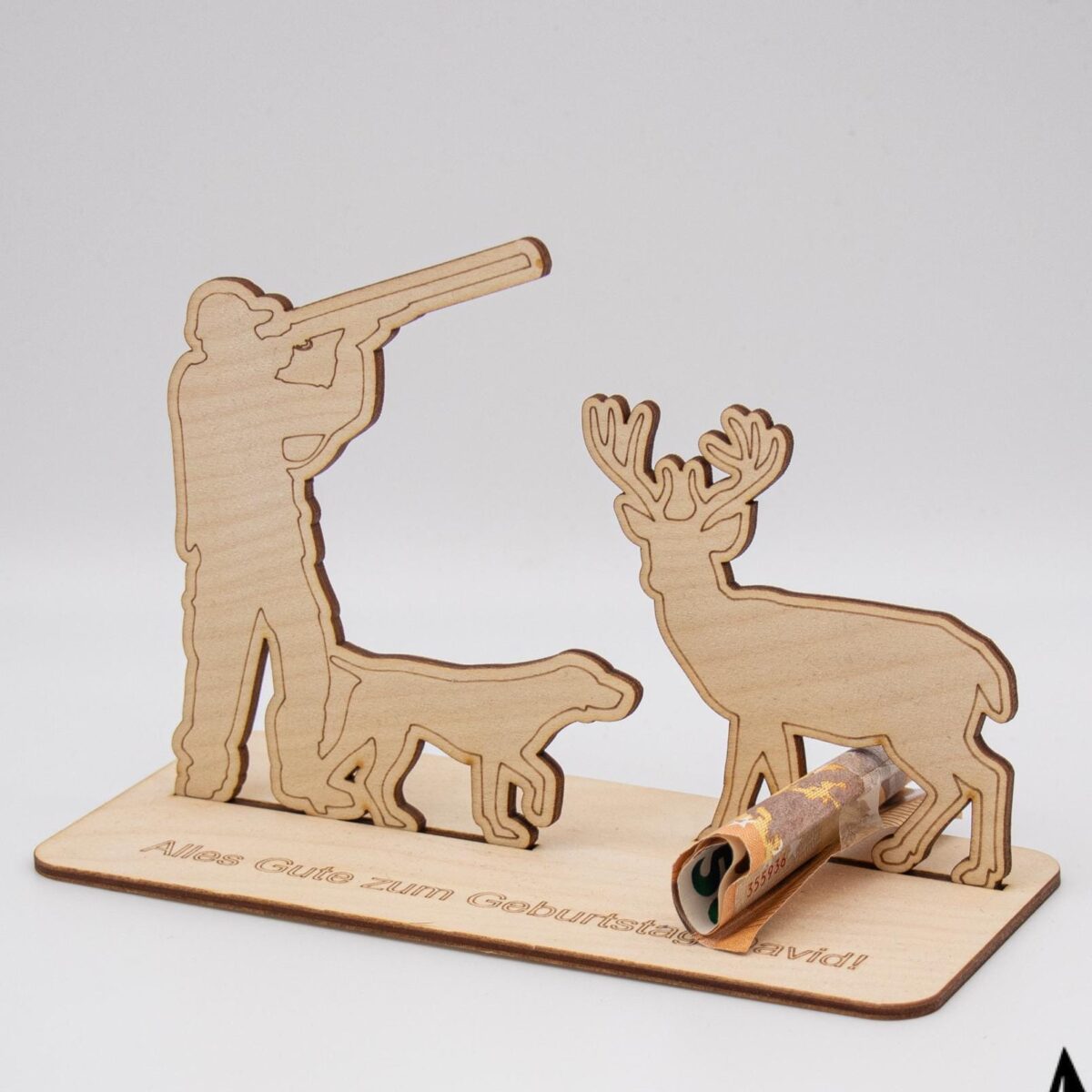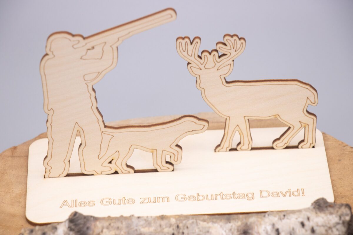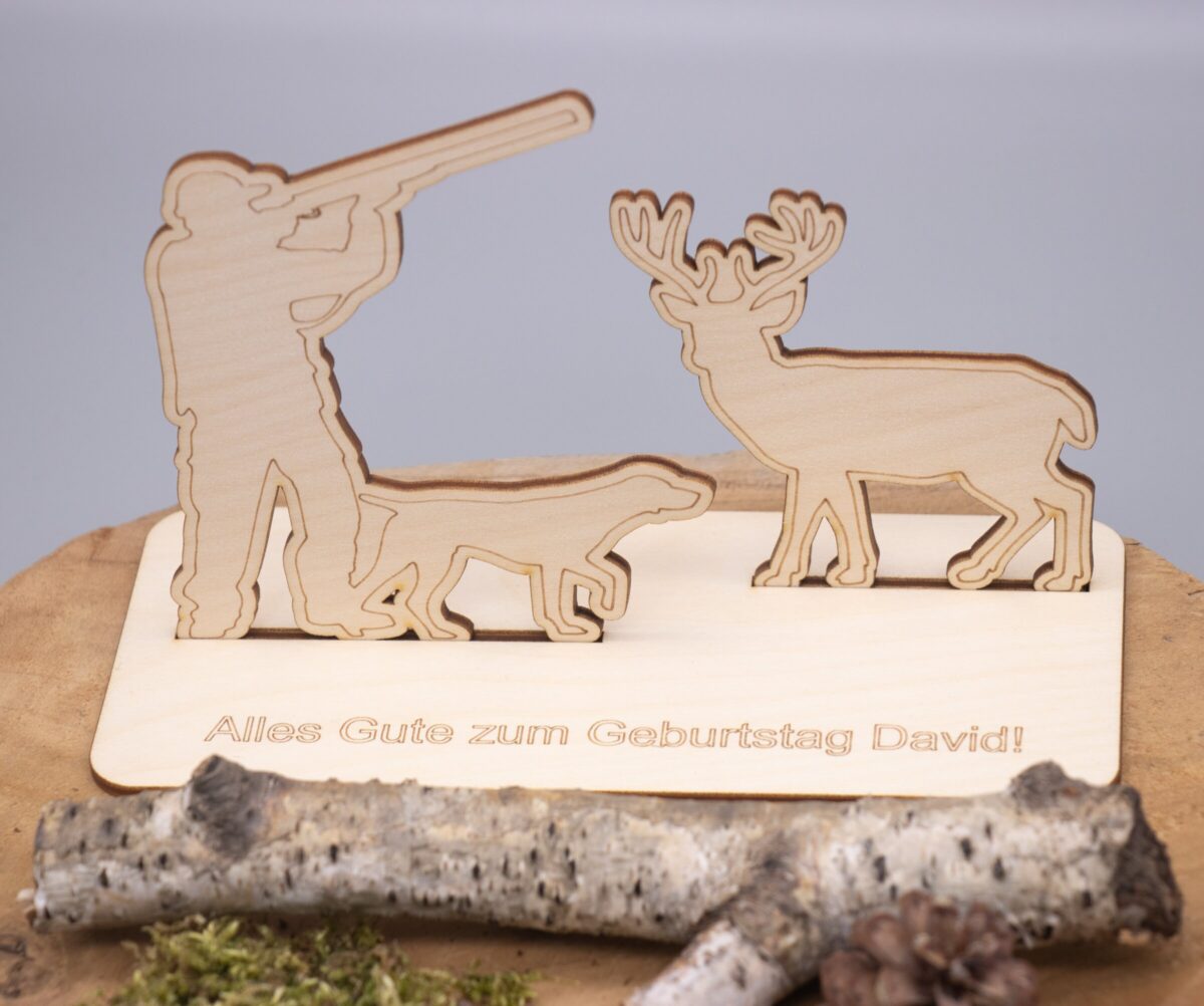 Verschenke Geld auf eine ganz besondere Art – mit unserem liebevoll gestalteten Holzaufsteller im Jagdmotiv! Dieses originelle Geldgeschenk besteht aus mehreren hochwertigen Holzteilen, die ganz einfach zusammengesteckt oder geklebt werden können. Der Aufsteller zeigt einen detailreichen Jäger samt Hirsch in einer stimmungsvollen Waldszene – perfekt für Naturfreunde, Jäger oder alle, die das Landleben lieben.