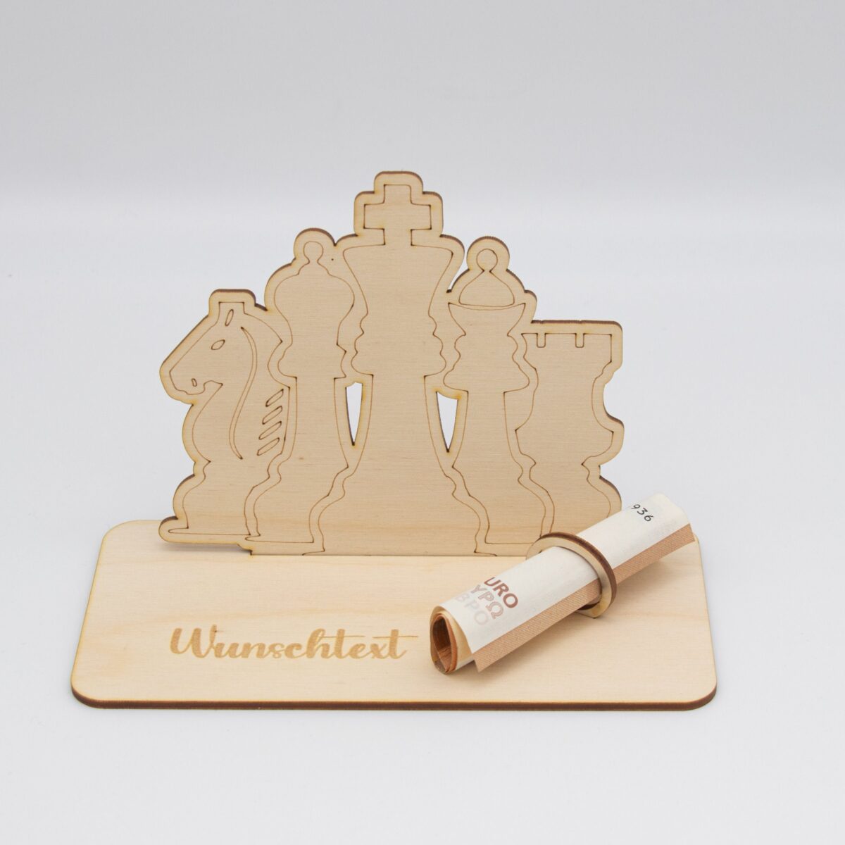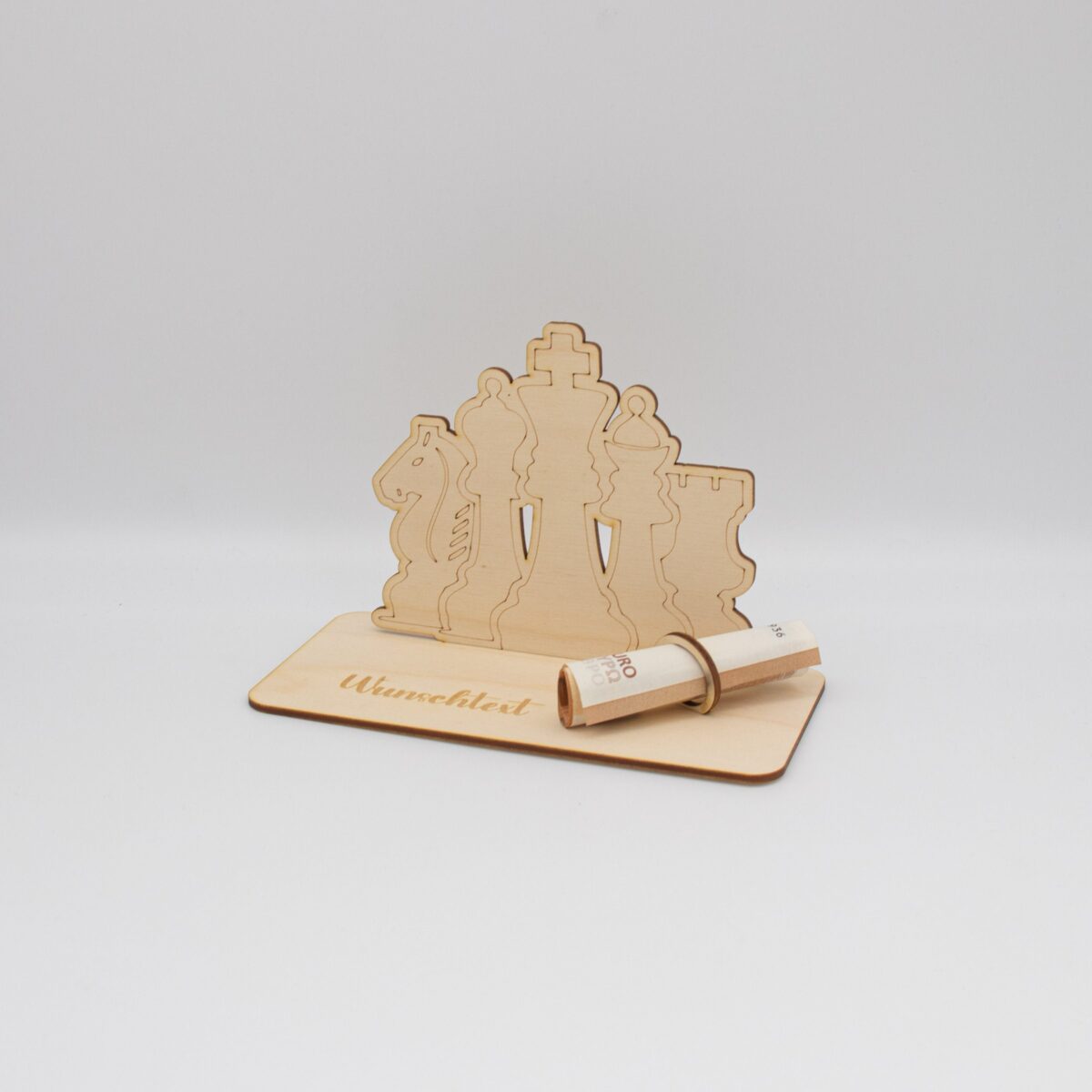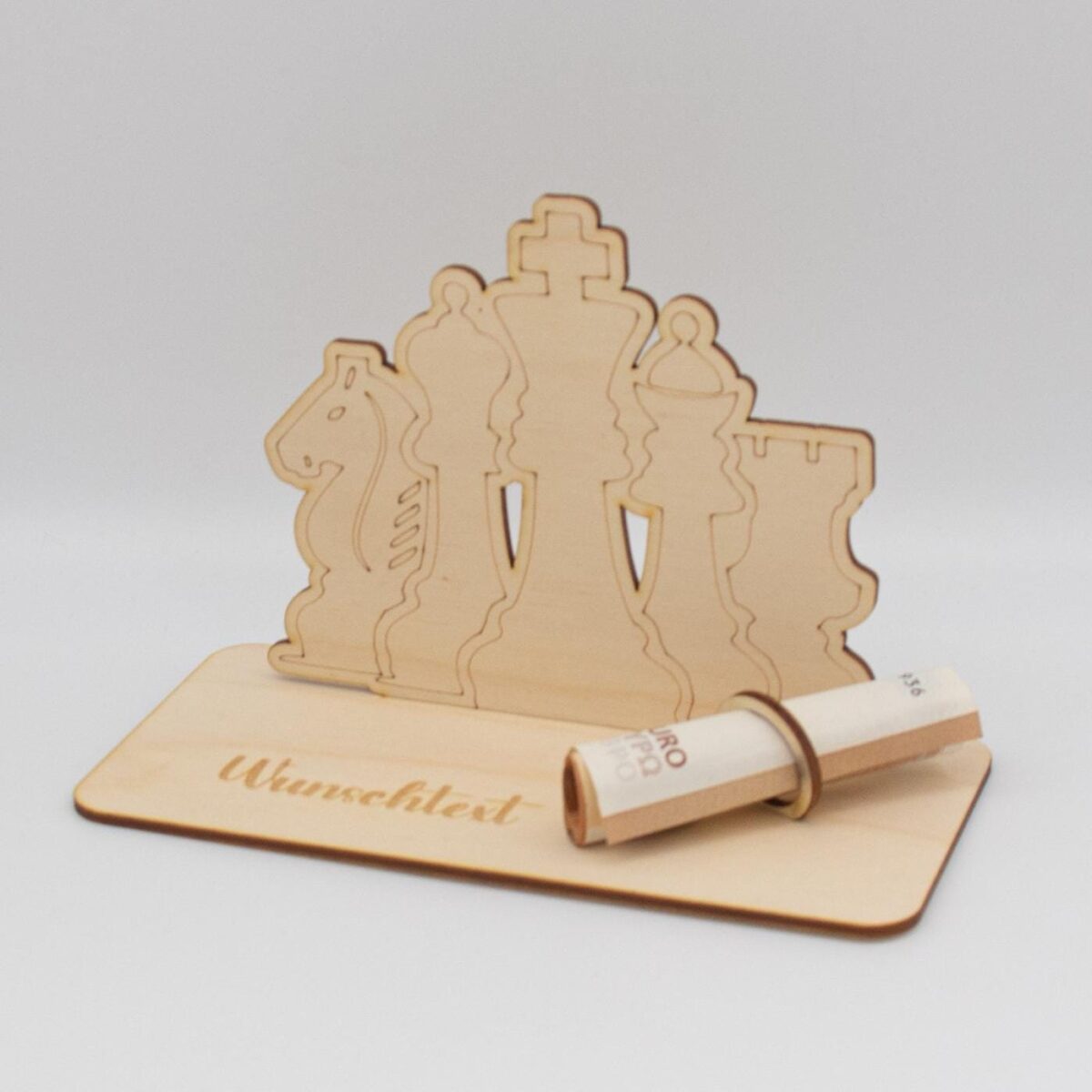 Schenken Sie Geld auf originelle und stilvolle Weise mit unserem einzigartigen Geldgeschenk aus 3mm unbehandeltem Birkensperrholz, das mit einem Schachmotiv versehen ist. Dieses sorgfältig gefertigte Geschenk vereint Handwerkskunst und Funktionalität, um jedem Anlass eine besondere Note zu verleihen.