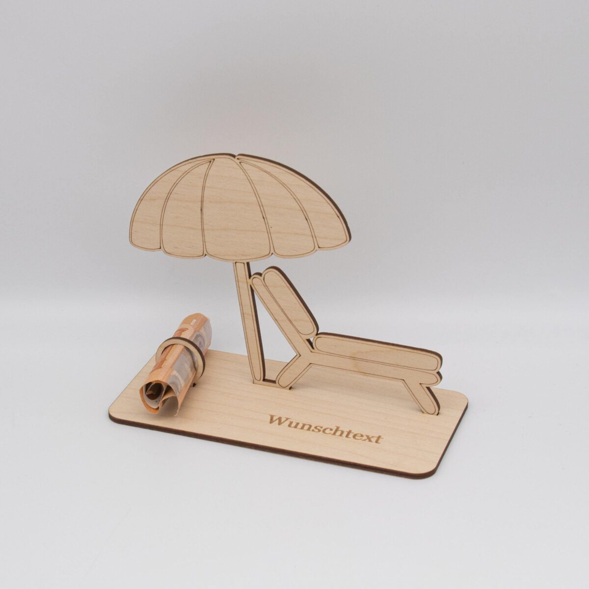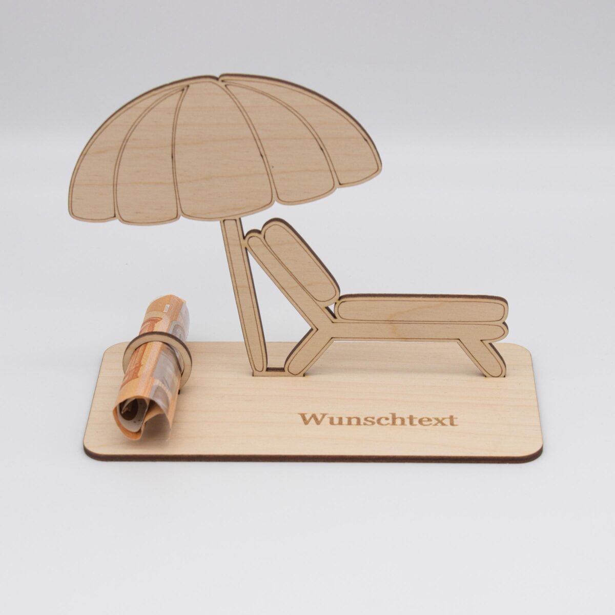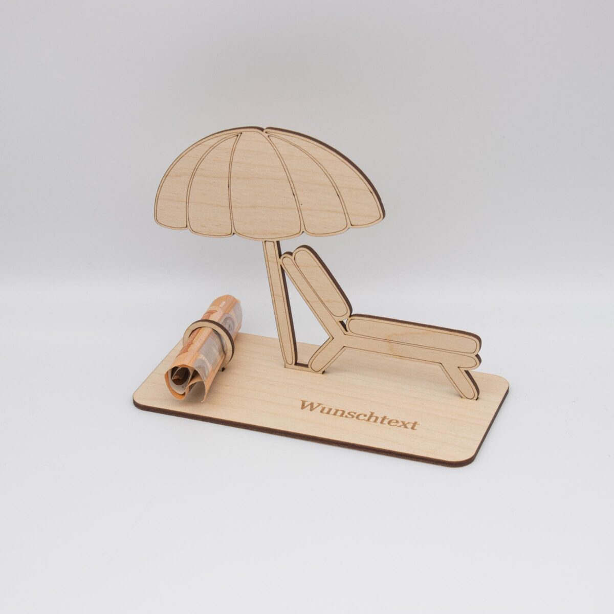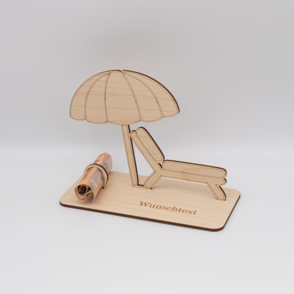 Du suchst nach einer kreativen Möglichkeit, Geld zu verschenken? Unser liebevoll gestalteter Holzaufsteller mit Liegestuhl und Sonnenschirm ist die perfekte Alternative zur klassischen Geldkarte!