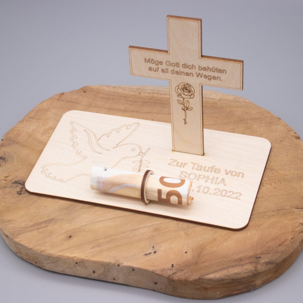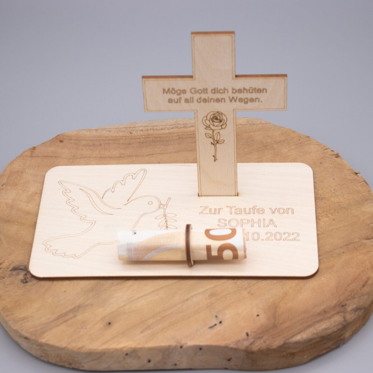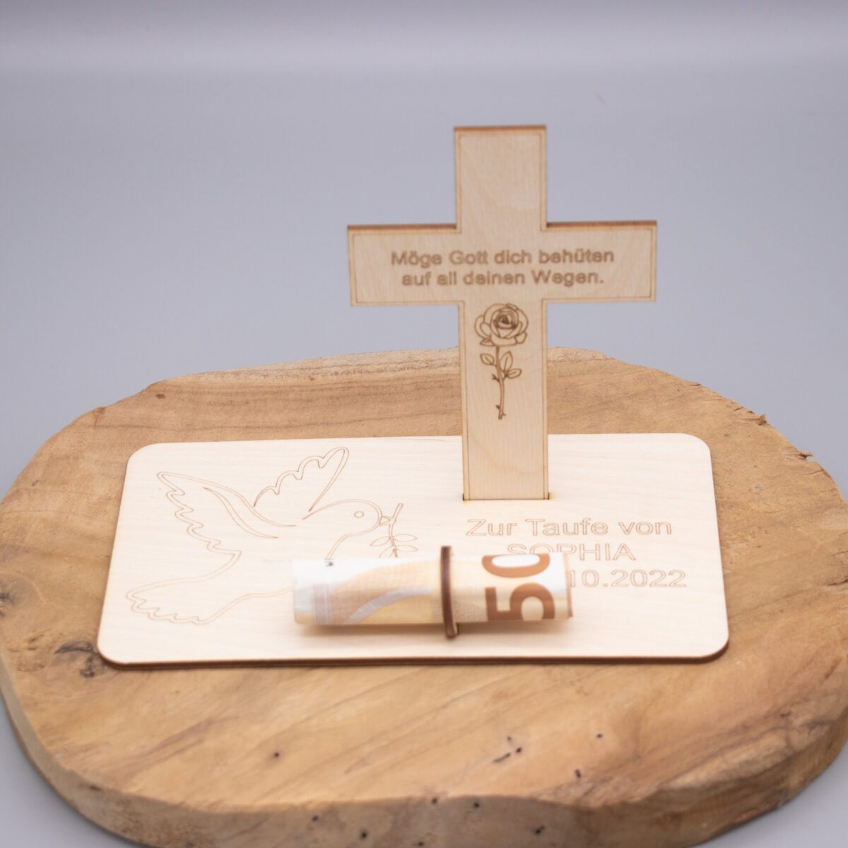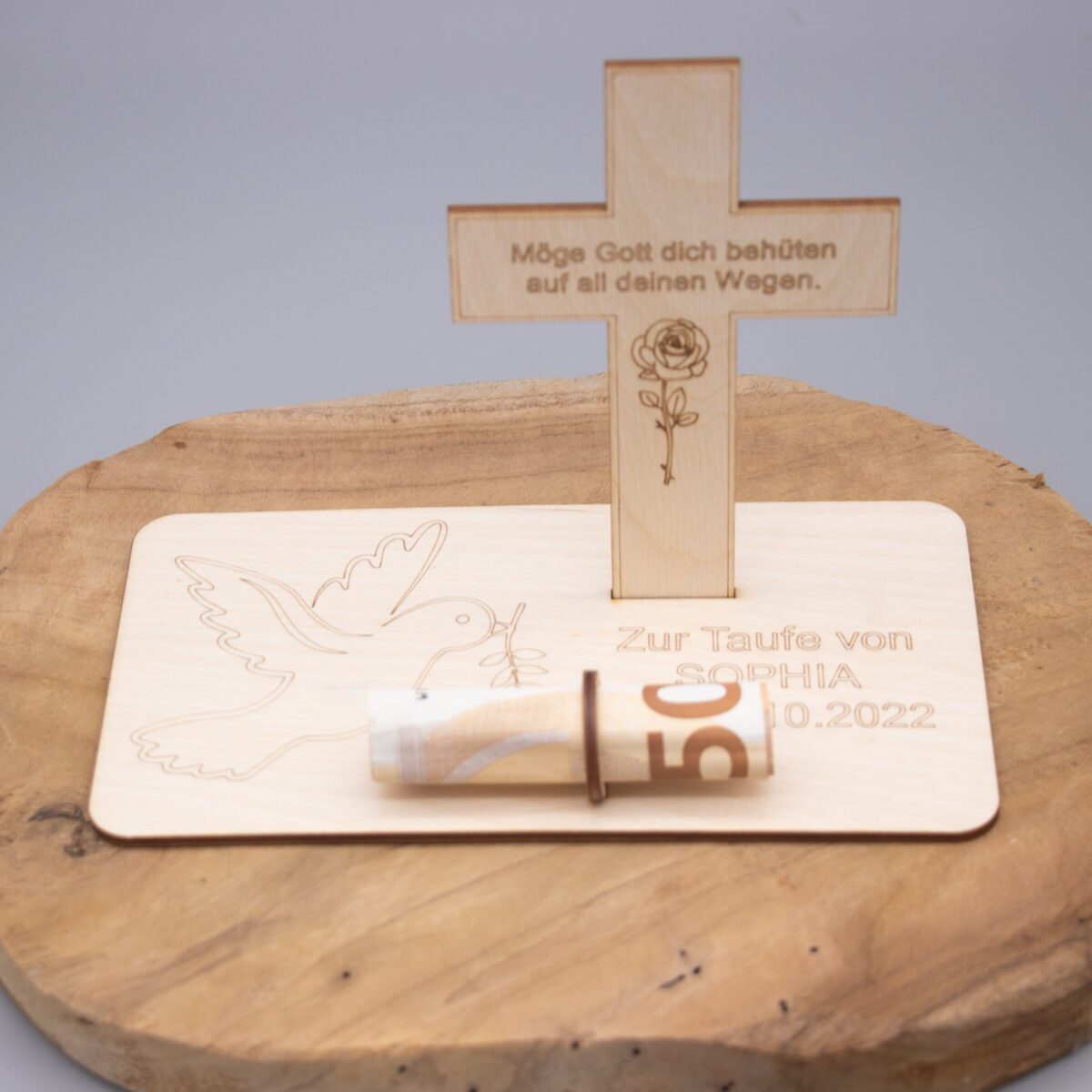 Ein besonderes Geschenk für einen besonderen Anlass: Unser liebevoll gestalteter Holzaufsteller mit Kreuz-Motiv ist die ideale Möglichkeit, Geldgeschenke zur Taufe oder Konfirmation stilvoll und symbolisch zu überreichen.