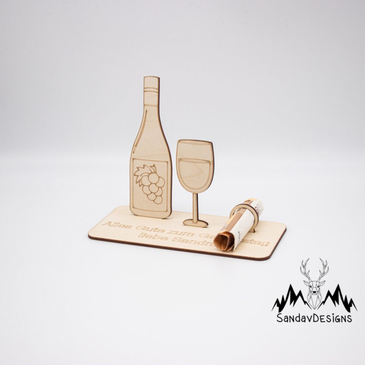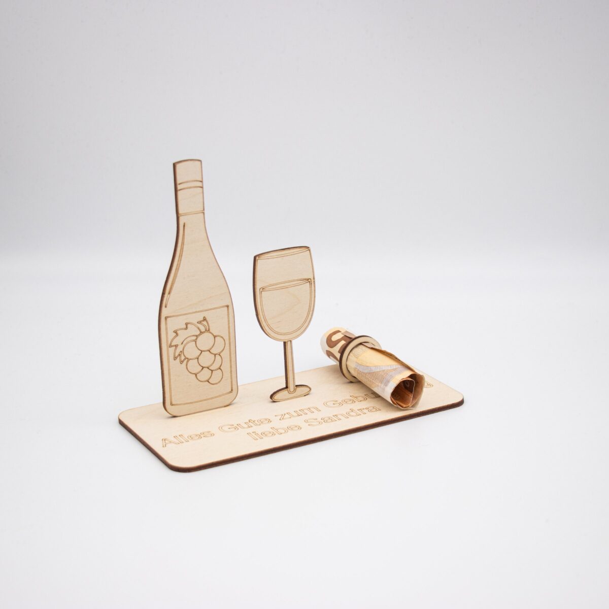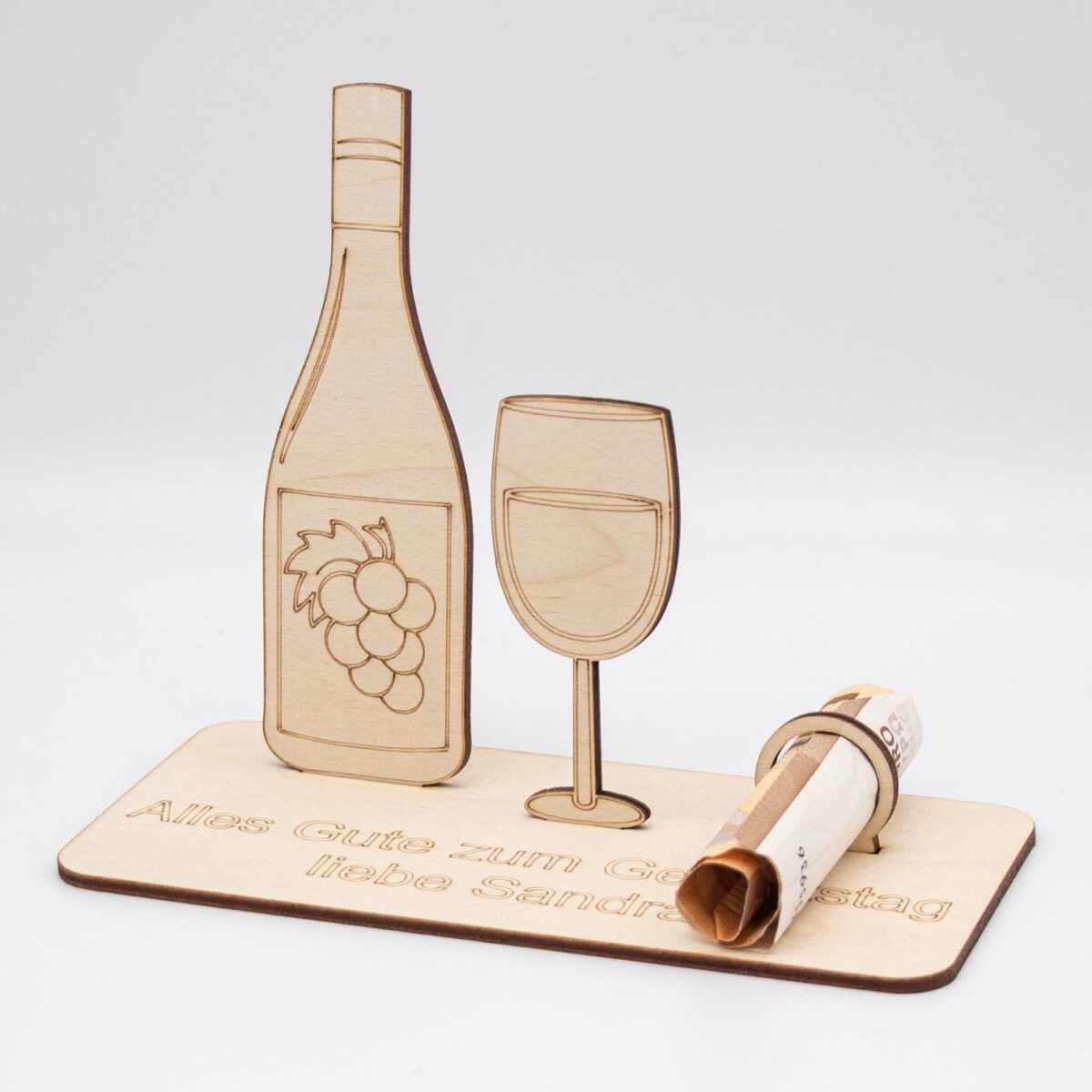 Unser liebevoll gestalteter Holzaufsteller mit Weinflasche und Glas-Motiv ist die perfekte Geschenkidee für alle, die Genuss zu schätzen wissen. Ob zum Geburtstag, zur Hochzeit, zum Jubiläum oder als Dankeschön – dieser Aufsteller setzt dein Geldgeschenk charmant in Szene.