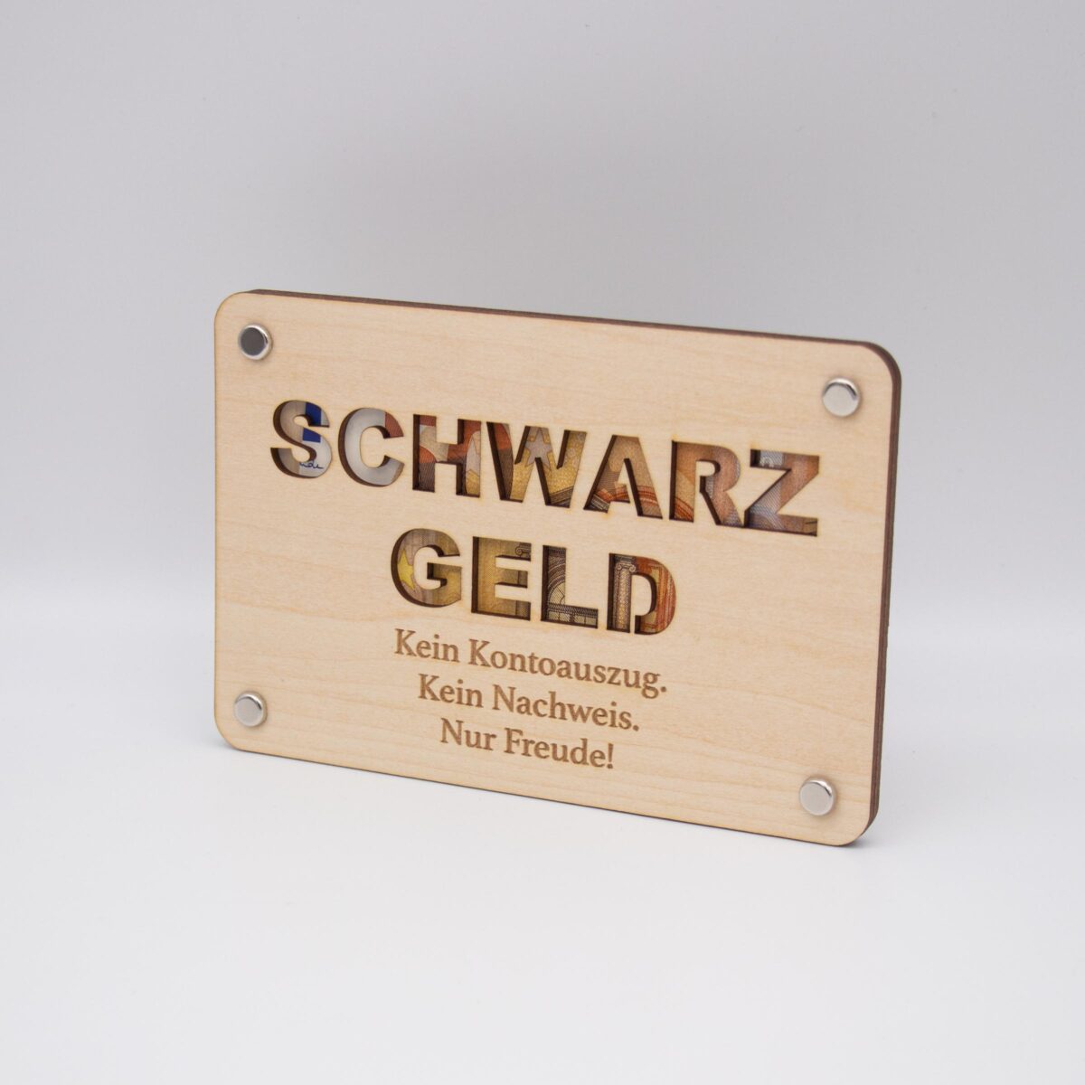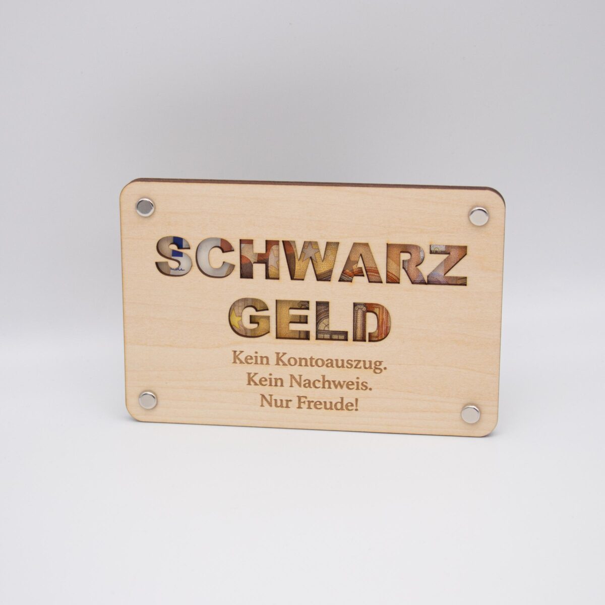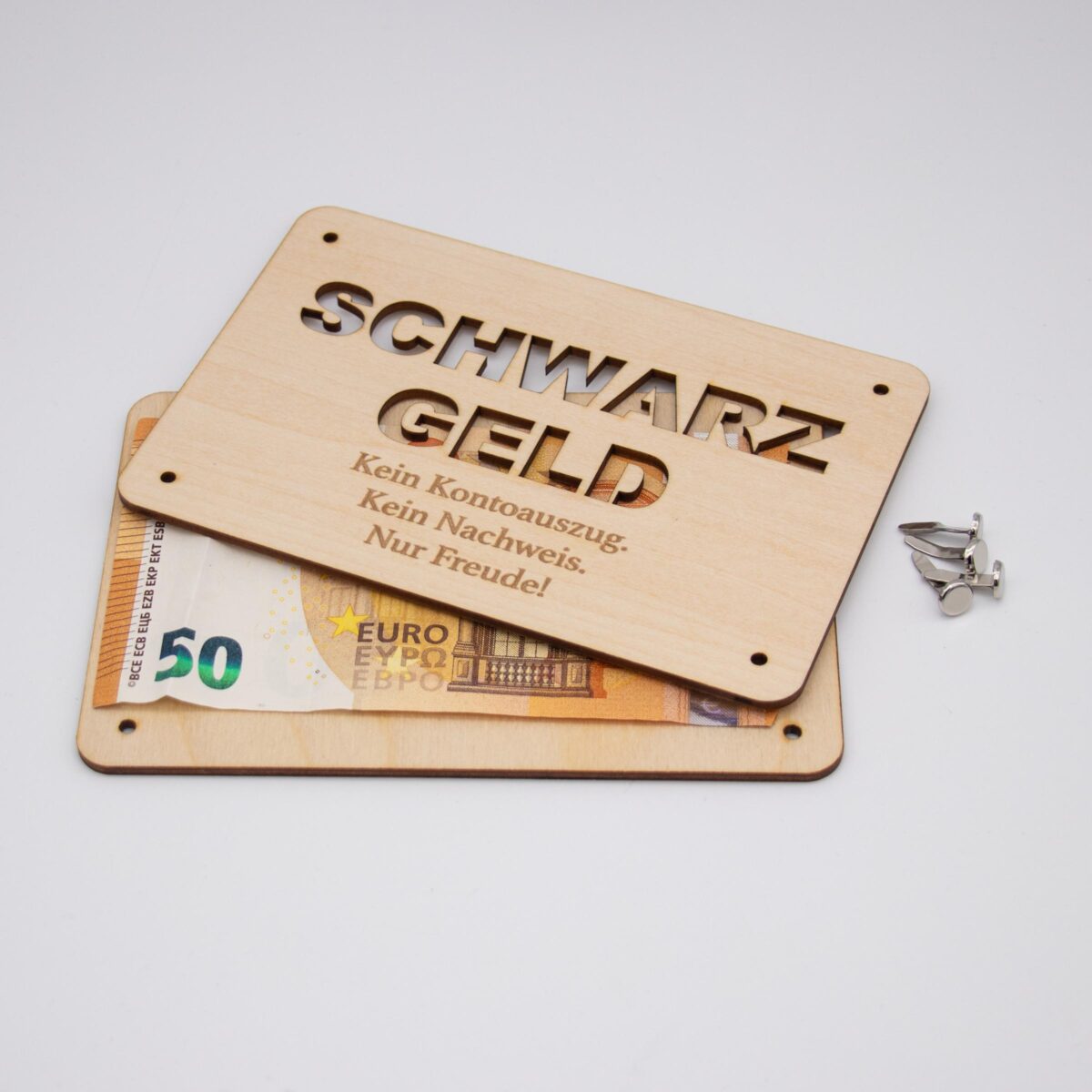Das Highlight: In der Vorderseite ist das Wort „Schwarzgeld“ fein ausgelasert, sodass das Geld durchscheint. Unter dem Motiv steht noch ein kurzer Spruch – so wird aus einem einfachen Geldgeschenk eine originelle und liebevolle Überraschung.