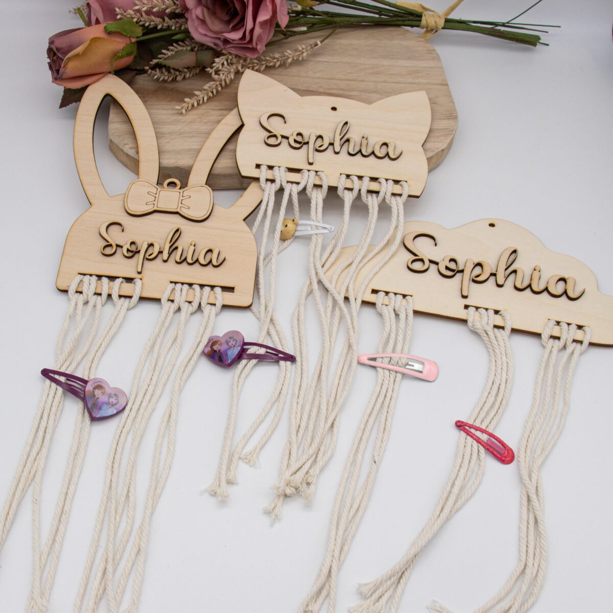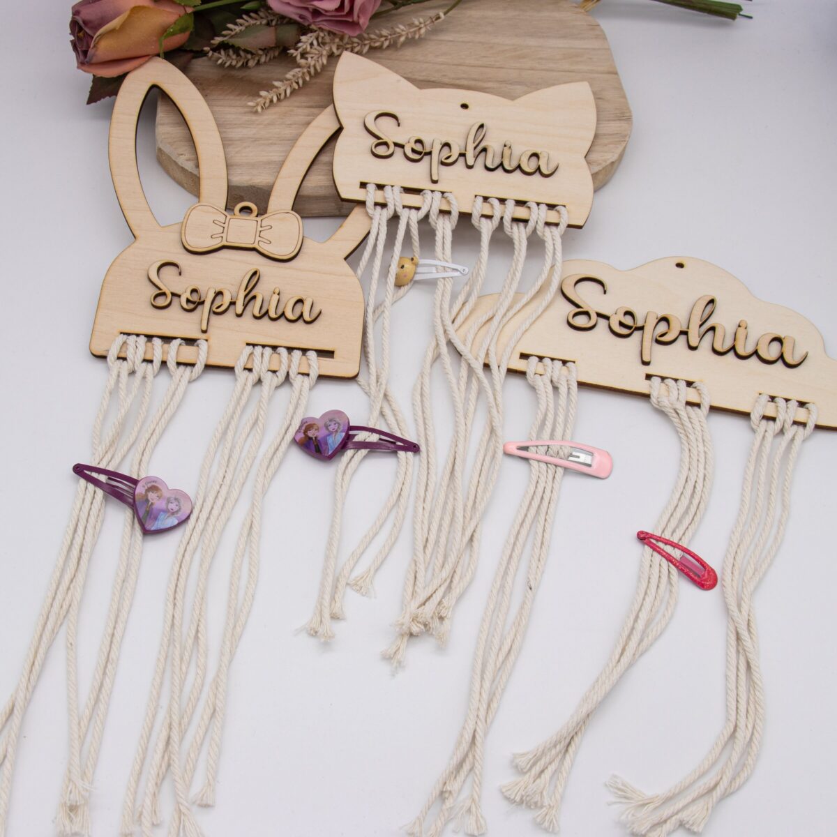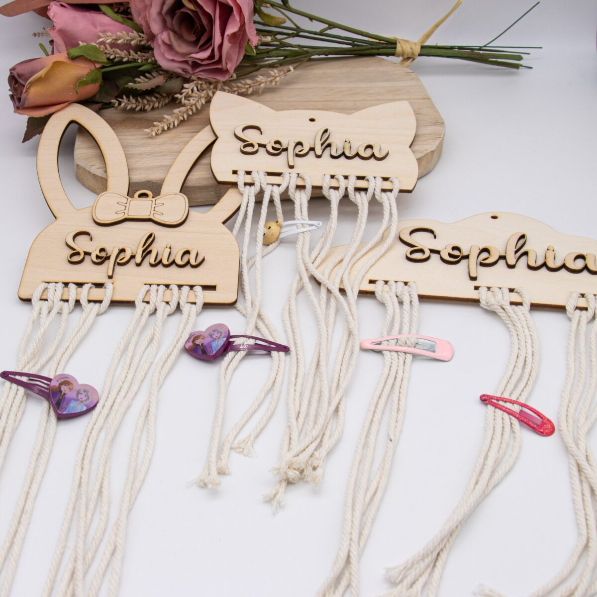 Bestellen Sie jetzt und verwandeln Sie die Aufbewahrung Ihrer Haarspangen in ein Kunstwerk. Personalisieren Sie Ihren Haarspangen-Halter mit einem Namen Ihrer Wahl und genießen Sie die Schönheit und Ordnung, die er in Ihr Leben bringt.