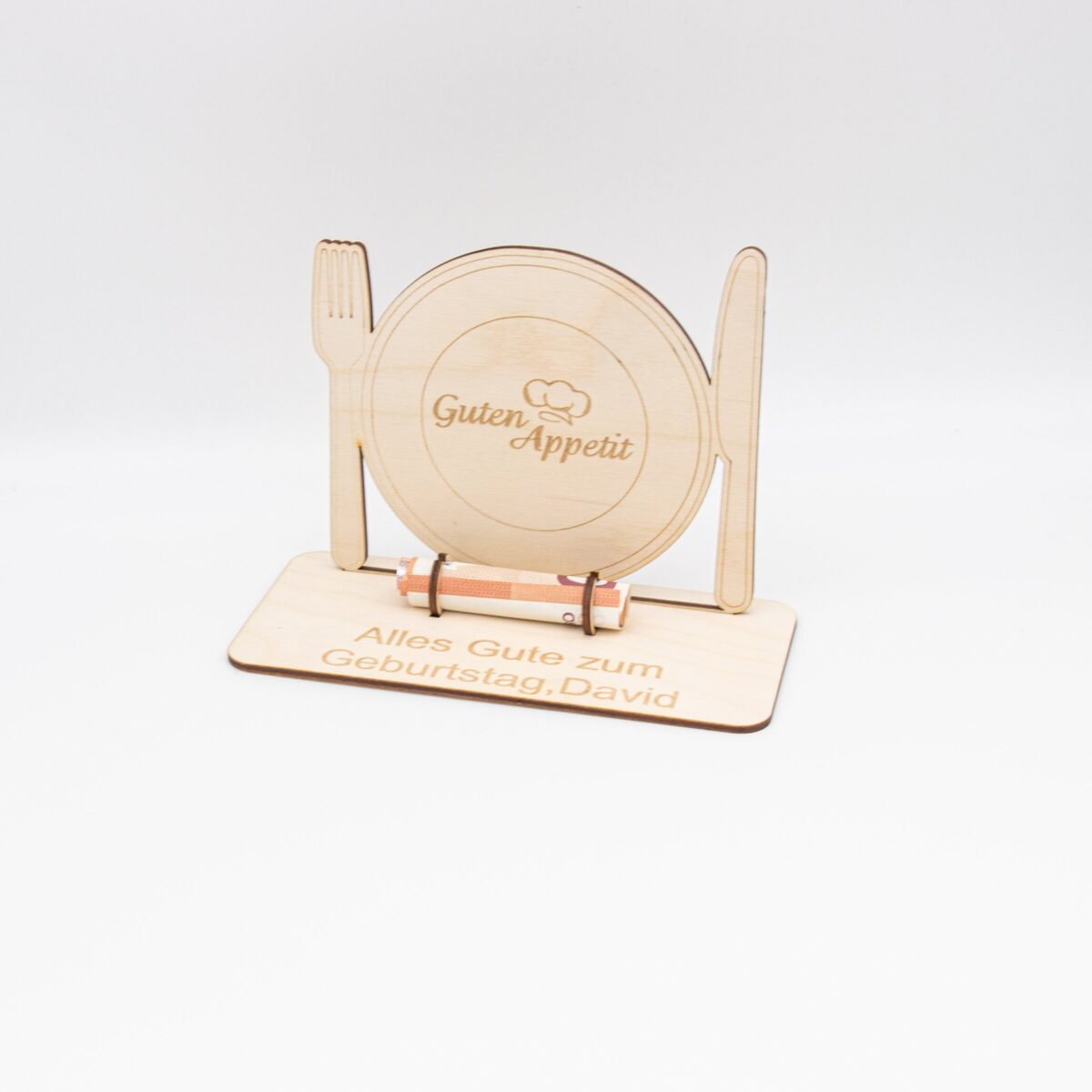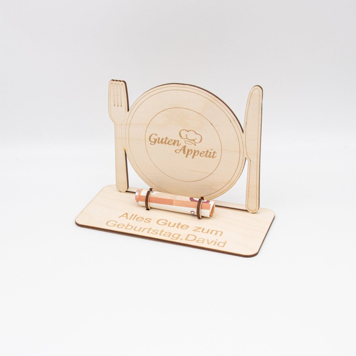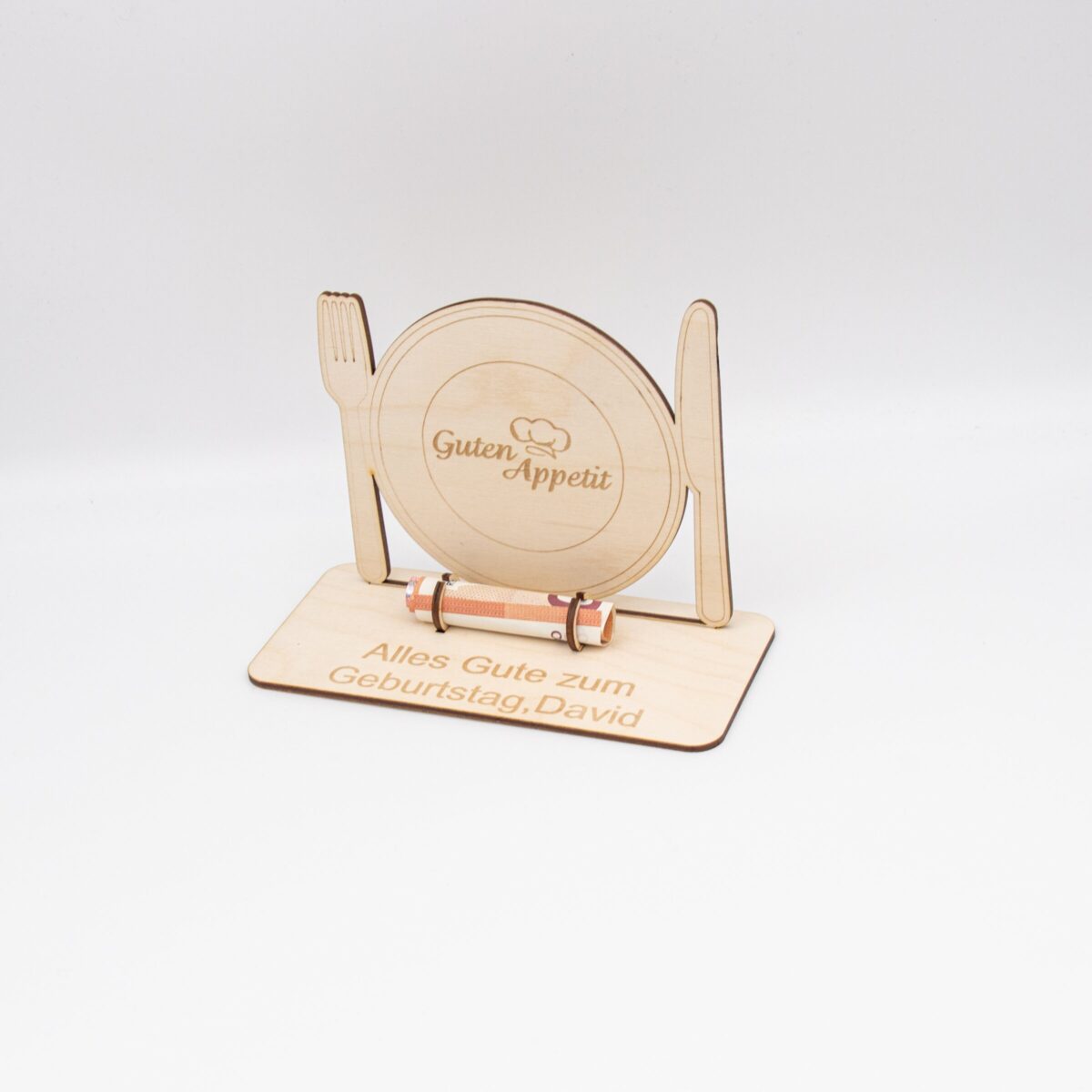 Entdecken Sie die perfekte Art, Gutscheine und Geldgeschenke mit Stil zu präsentieren! Unser einzigartiger Geschenkhalter, sorgfältig gefertigt aus 3 mm starkem Birkensperrholz, ist ein echter Hingucker. Dank der präzisen Lasergravur entsteht ein charmantes Motiv eines Tellers mit Besteck, das ideal zu jeder Essensgutschein- oder Bargeldüberraschung passt.