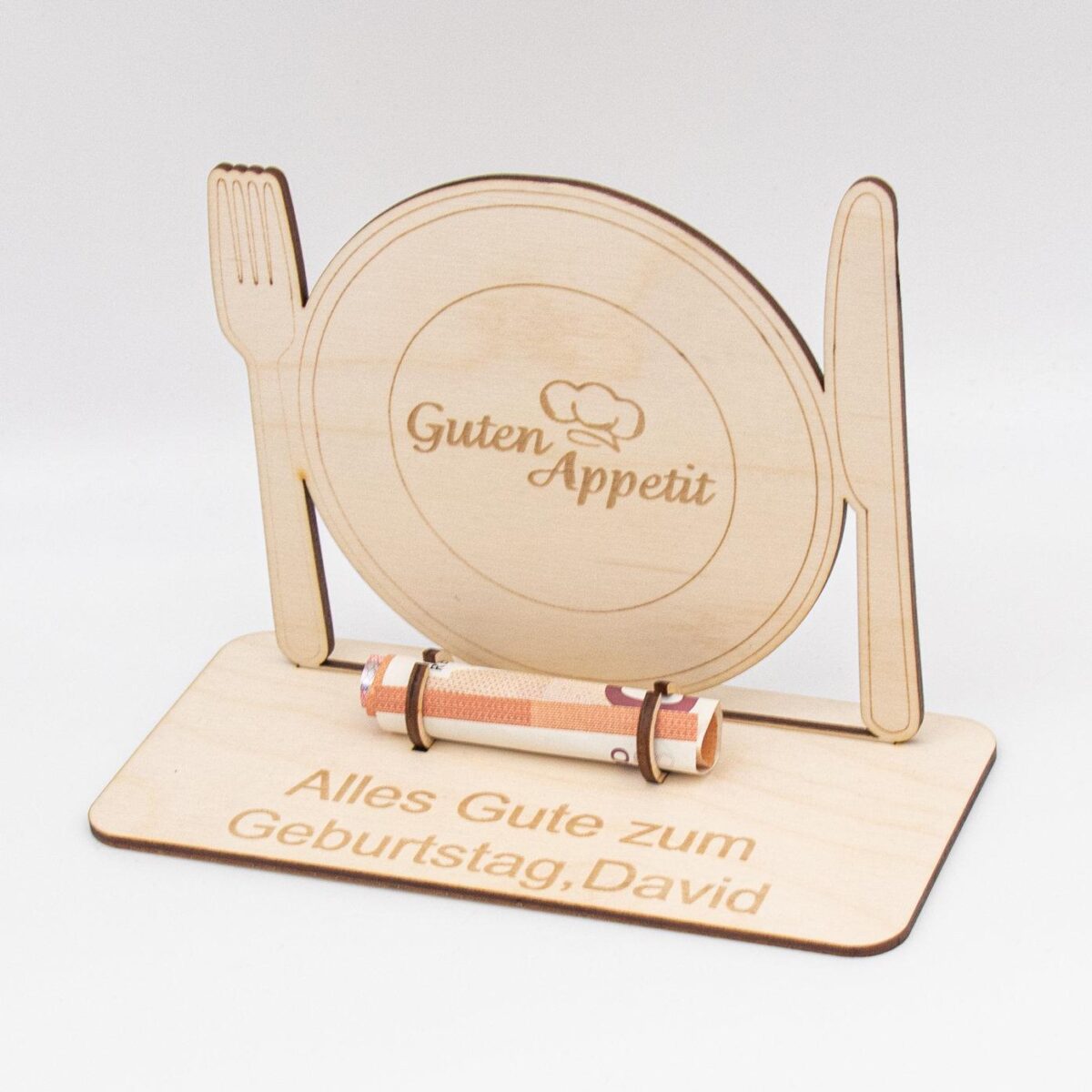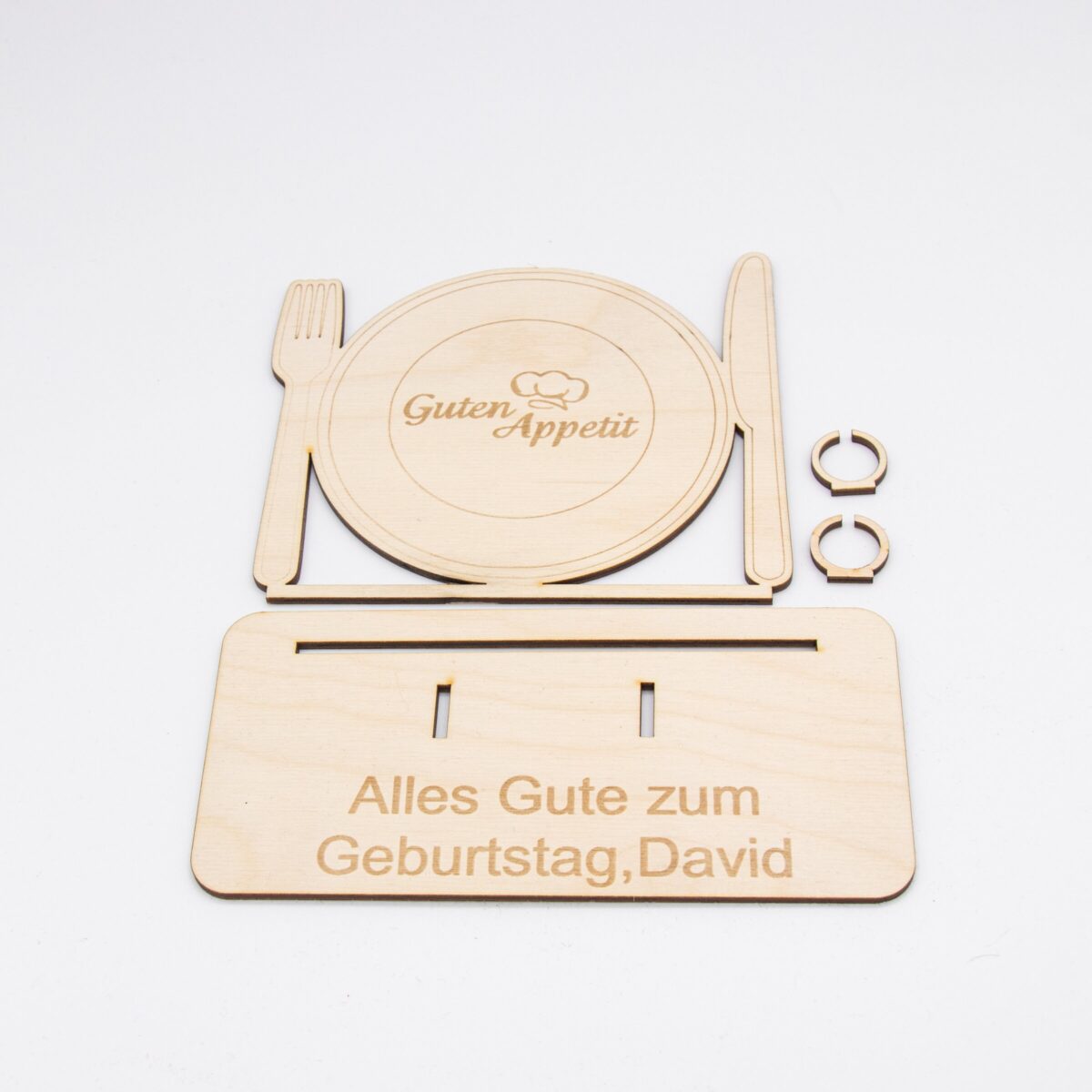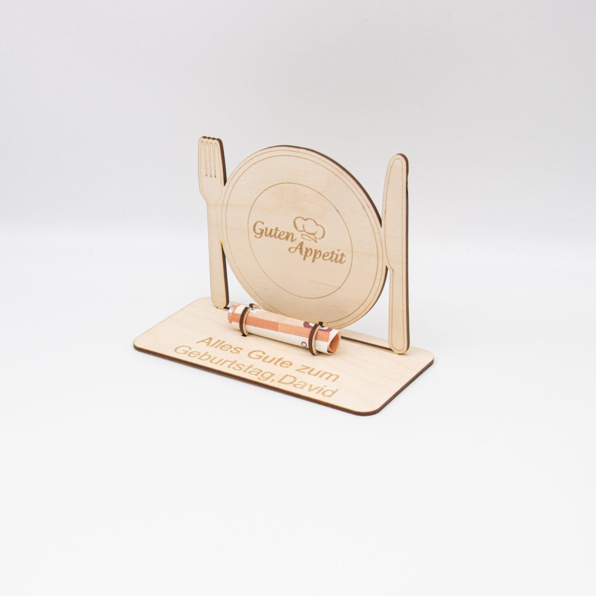 Entdecken Sie die perfekte Art, Gutscheine und Geldgeschenke mit Stil zu präsentieren! Unser einzigartiger Geschenkhalter, sorgfältig gefertigt aus 3 mm starkem Birkensperrholz, ist ein echter Hingucker. Dank der präzisen Lasergravur entsteht ein charmantes Motiv eines Tellers mit Besteck, das ideal zu jeder Essensgutschein- oder Bargeldüberraschung passt.
