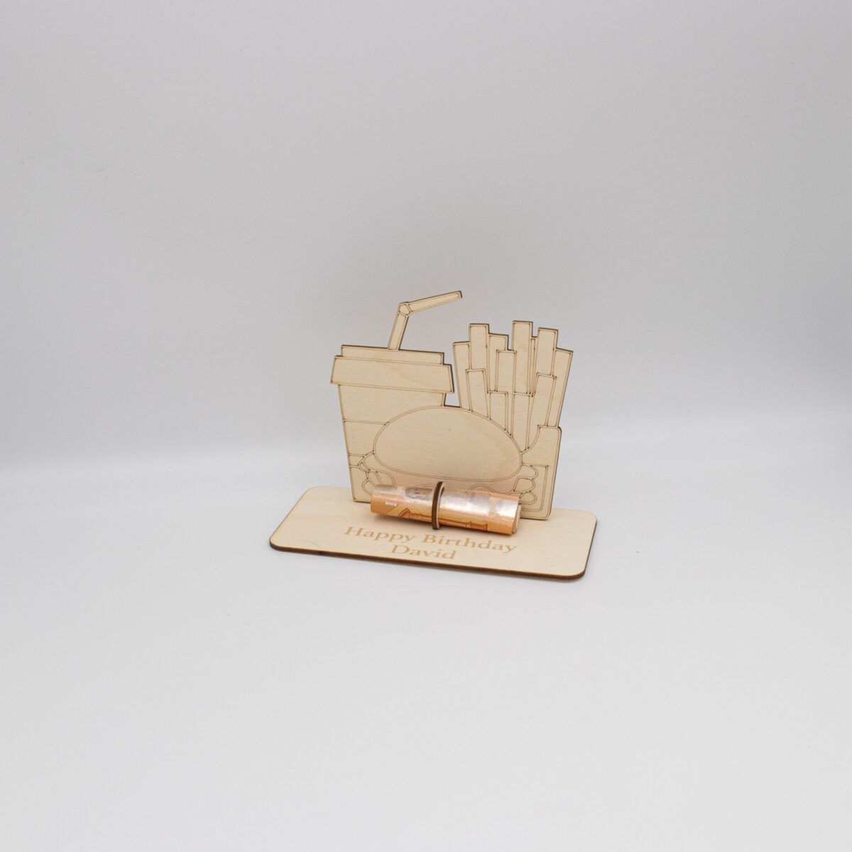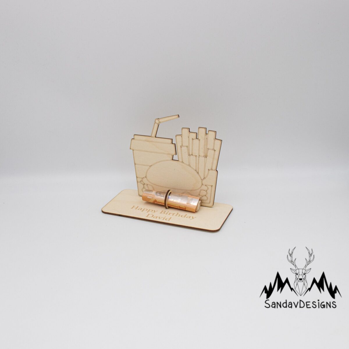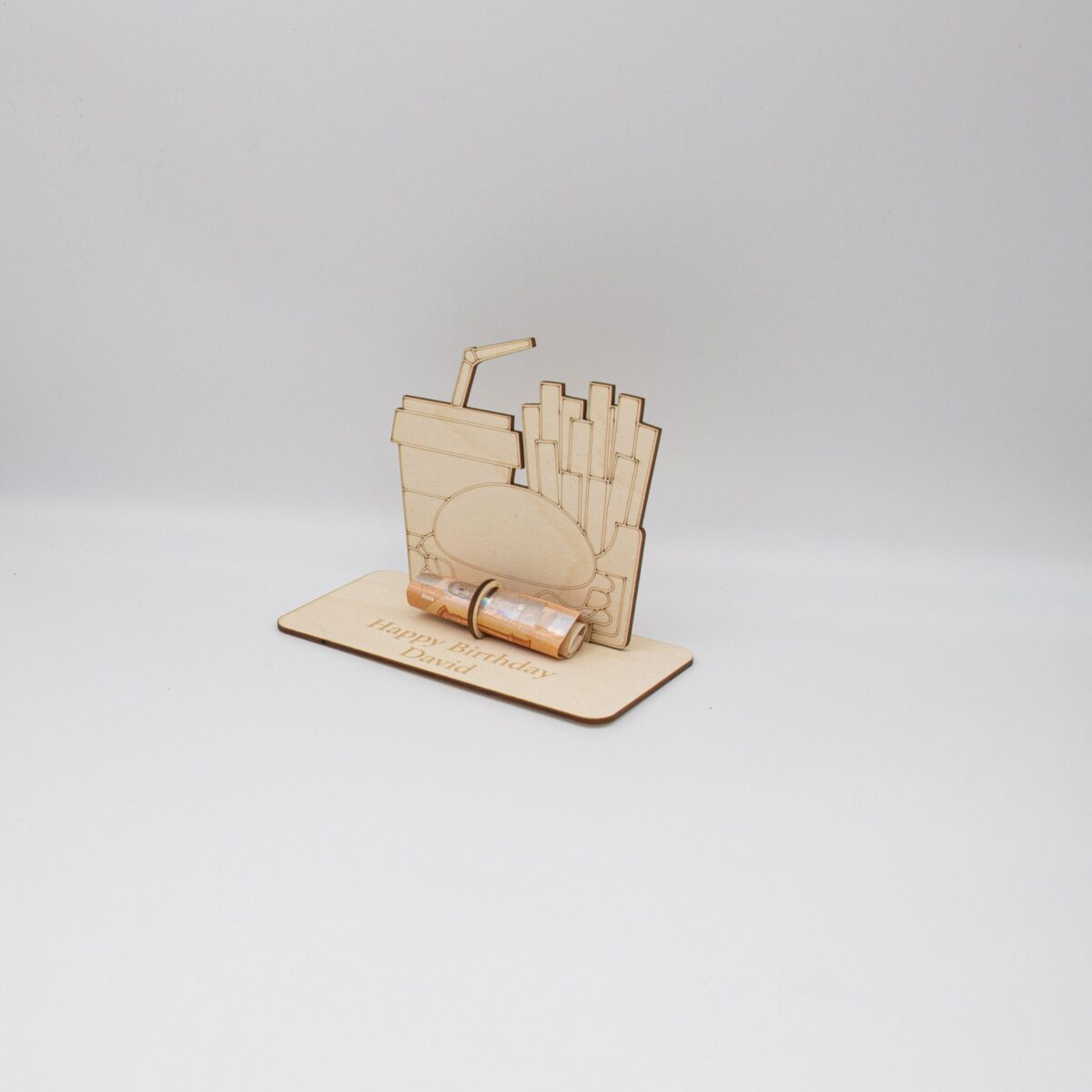 Entdecken Sie das perfekte Geschenk für Fastfood-Liebhaber! Unser einzigartiges Geldgeschenk vereint Stil und Kreativität. Es ist kunstvoll aus 3mm starkem Birkensperrholz gefertigt, das für seine Haltbarkeit und natürliche Schönheit bekannt ist. Dieses exquisite Stück zeichnet sich durch präzise Laserschnitte aus, die ein lebendiges Fastfood-Motiv zum Leben erwecken – inklusive knuspriger Pommes, eines saftigen Burgers und eines erfrischenden Softdrinks.