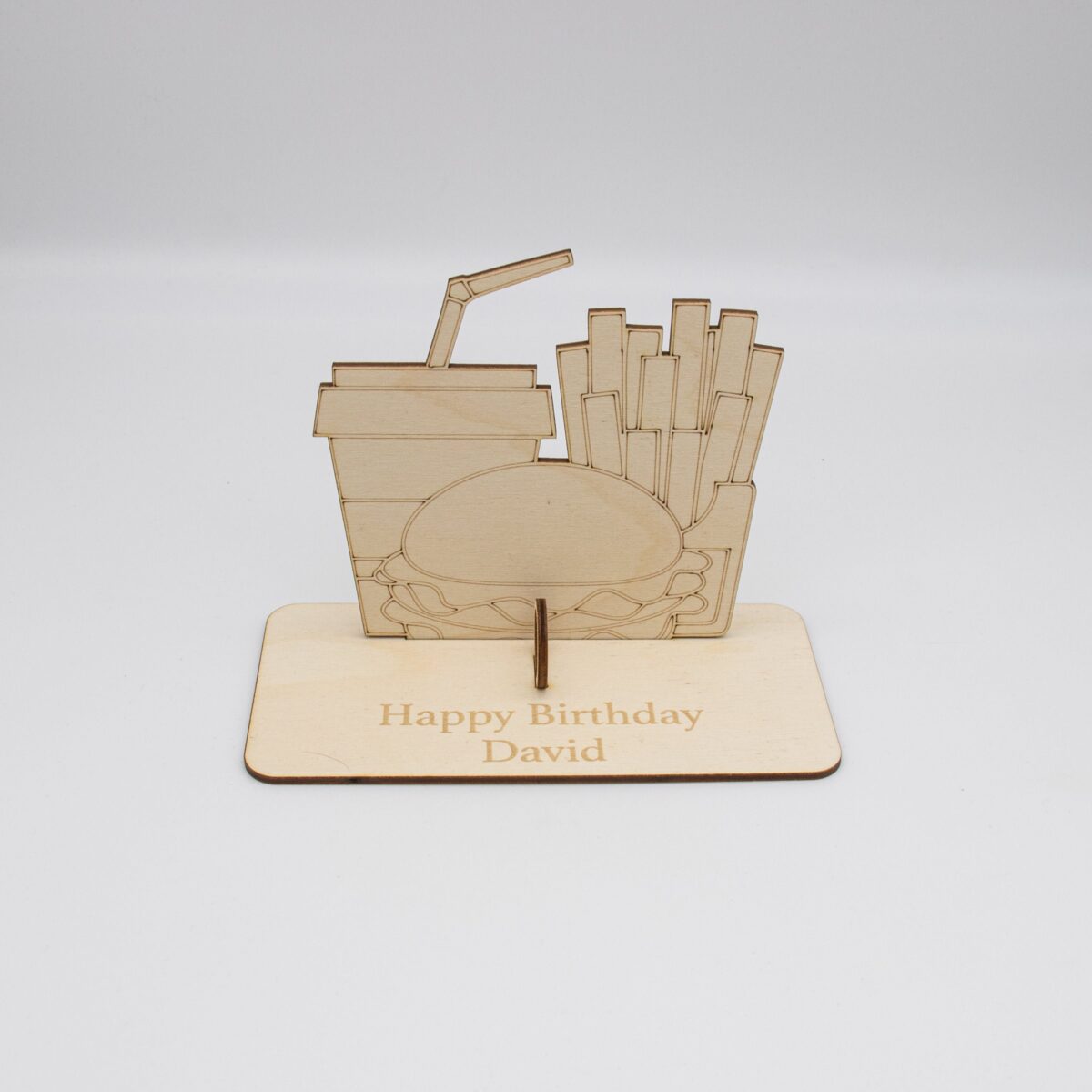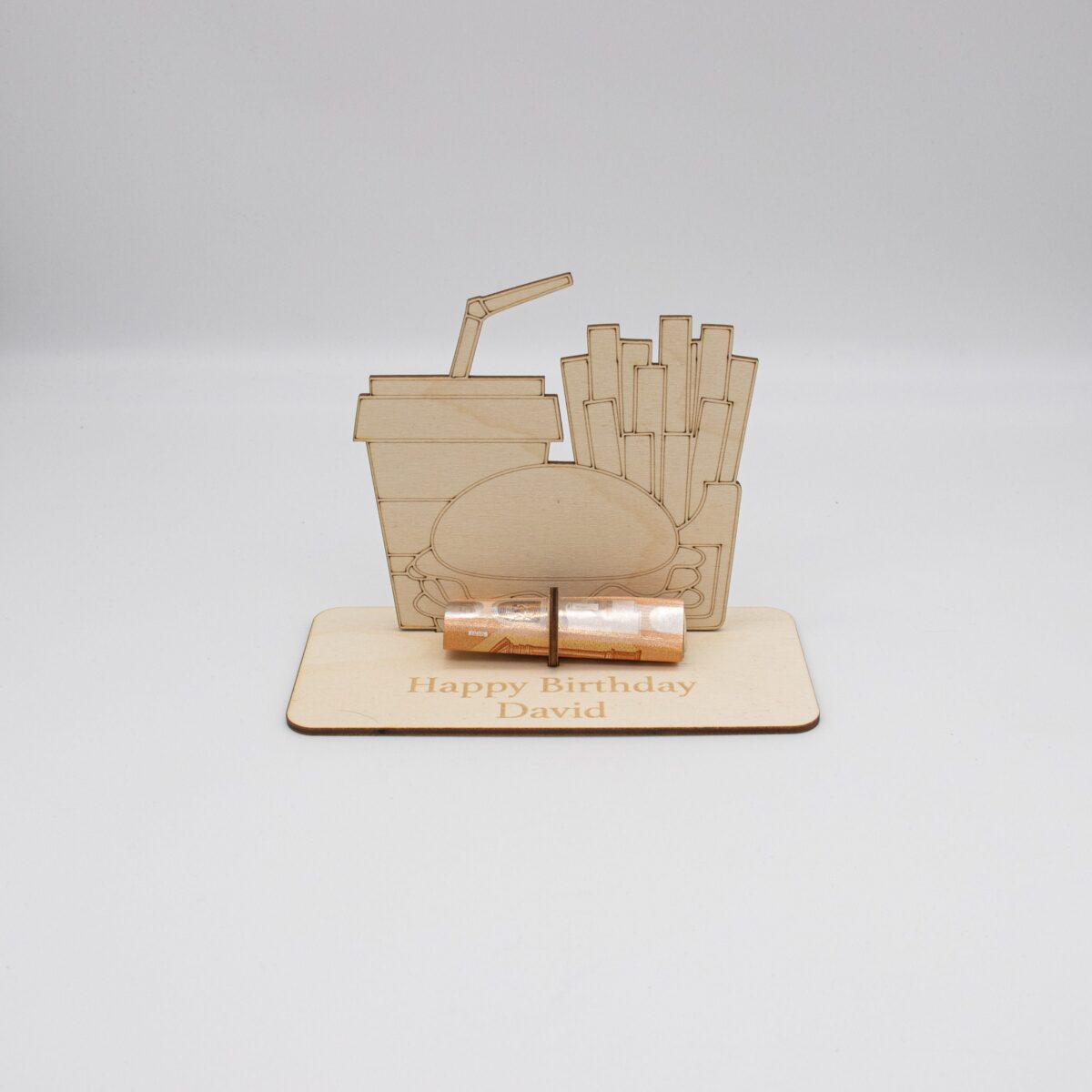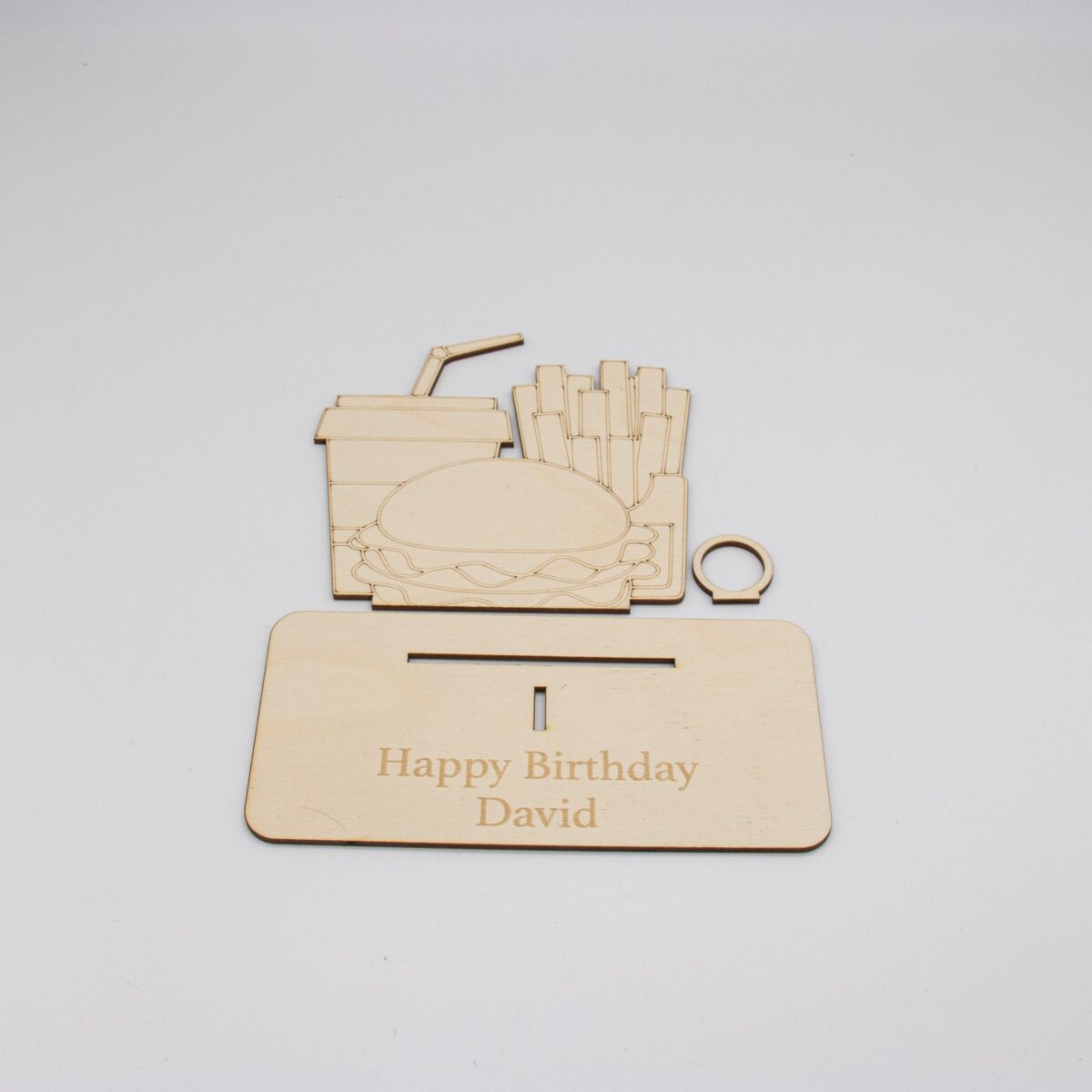Entdecken Sie das perfekte Geschenk für Fastfood-Liebhaber! Unser einzigartiges Geldgeschenk vereint Stil und Kreativität. Es ist kunstvoll aus 3mm starkem Birkensperrholz gefertigt, das für seine Haltbarkeit und natürliche Schönheit bekannt ist. Dieses exquisite Stück zeichnet sich durch präzise Laserschnitte aus, die ein lebendiges Fastfood-Motiv zum Leben erwecken – inklusive knuspriger Pommes, eines saftigen Burgers und eines erfrischenden Softdrinks.