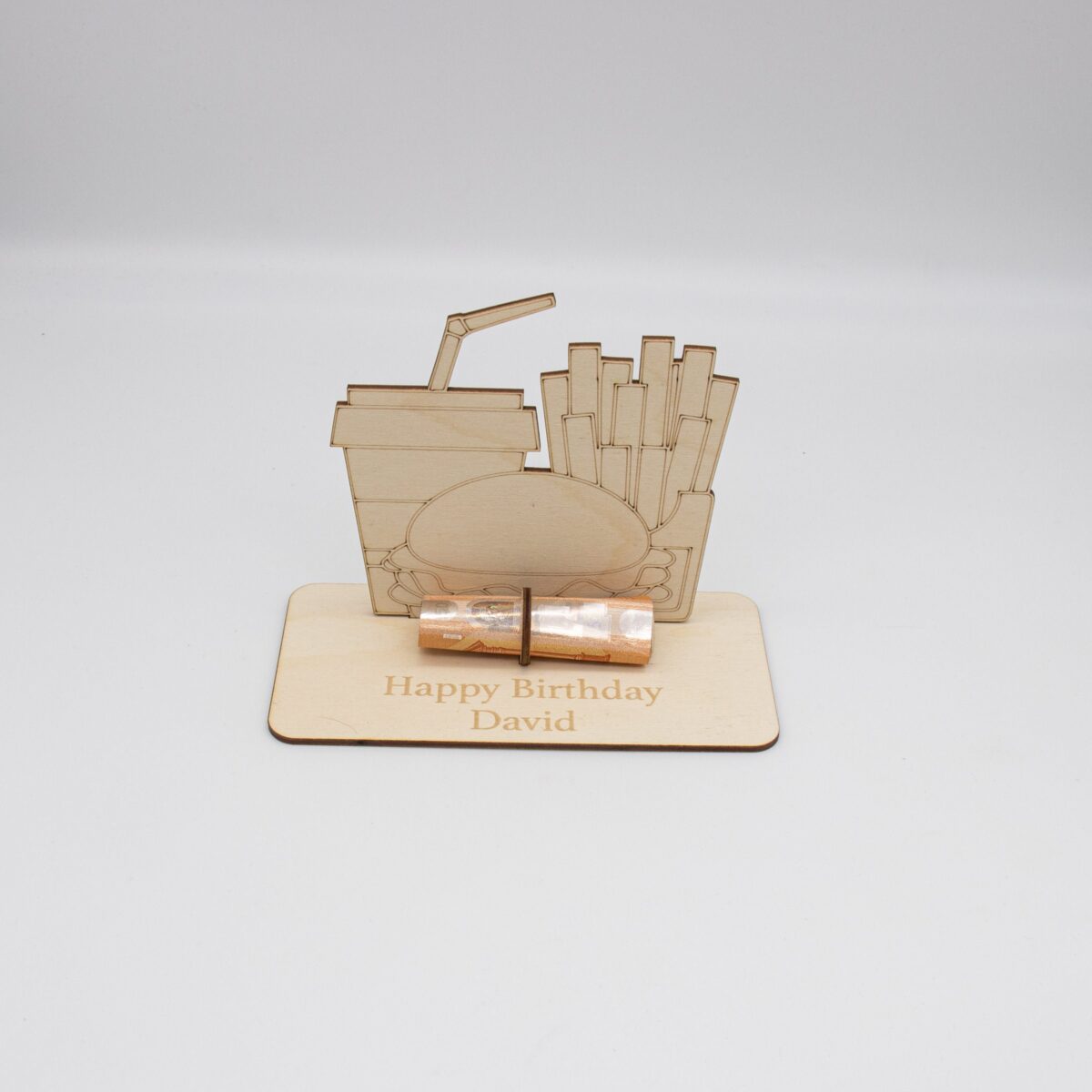 Jedes Detail wurde sorgfältig bedacht, um eine ansprechende und realistische Darstellung zu erreichen, die die Freude und den Spaß am Fastfood einfängt. Die Personalisierungsmöglichkeiten heben dieses Geldgeschenk von anderen ab. Sie können den Namen des Beschenkten oder eine besondere Nachricht hinzufügen, was es zu einem wirklich individuellen und denkwürdigen Geschenk macht.