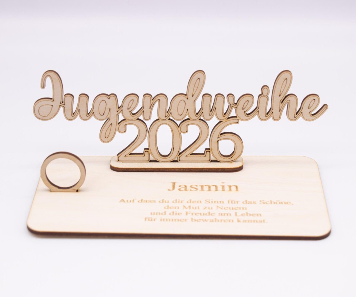 Schenken Sie etwas Besonderes zur Jugendweihe 2026! Unser edles Geldgeschenk aus 3 mm unbehandeltem Birkenholz vereint Schlichtheit und Eleganz in einem zeitlosen Design. Das Herzstück des Geschenks ist der kunstvoll gestaltete Schriftzug „Jugendweihe 2026“, der aus hochwertigem Holz präzise gelasert wurde.