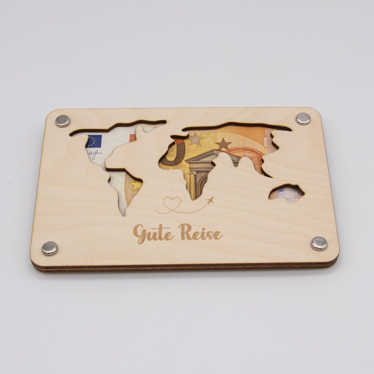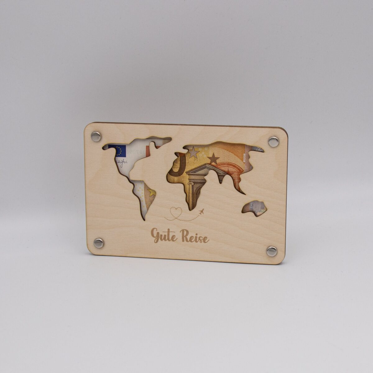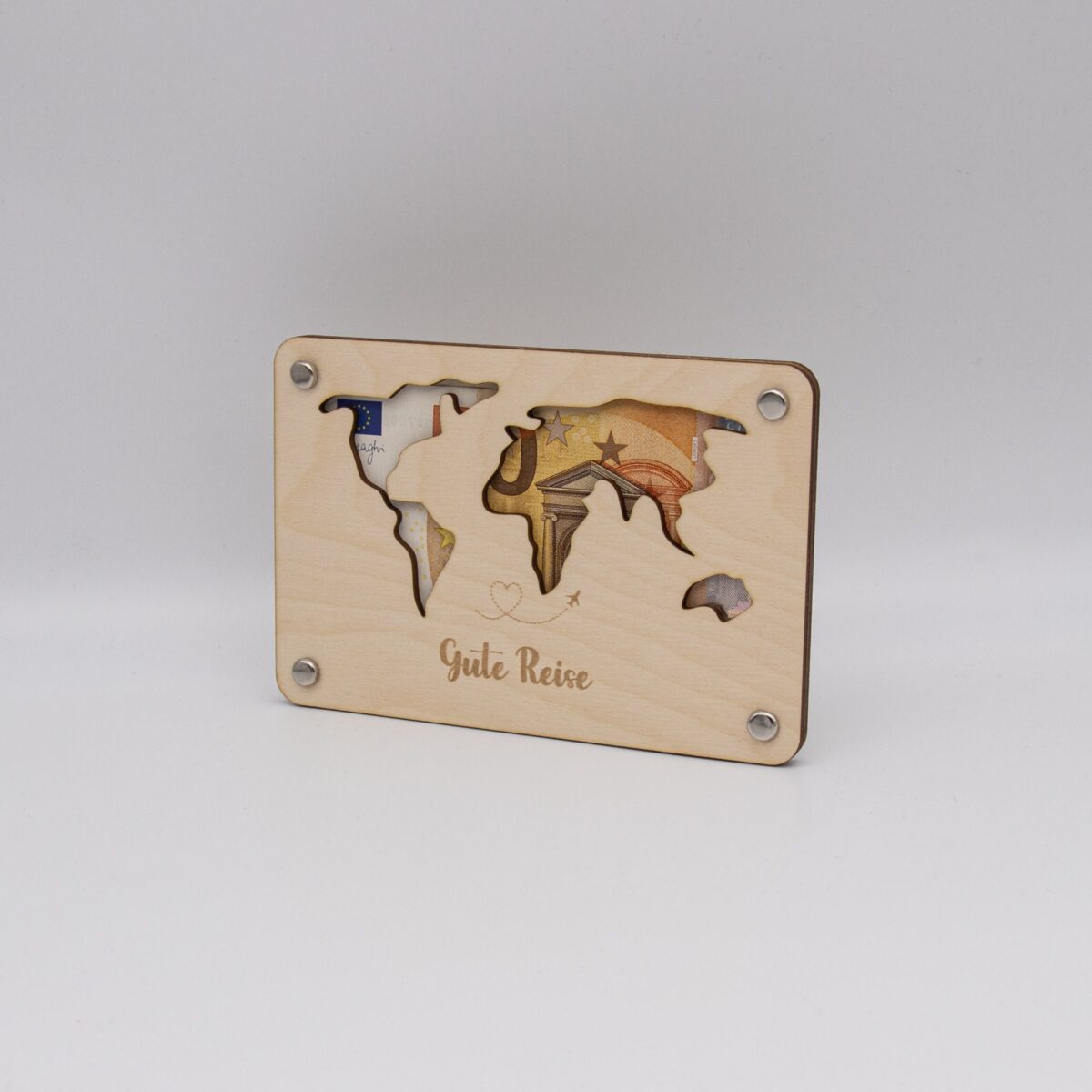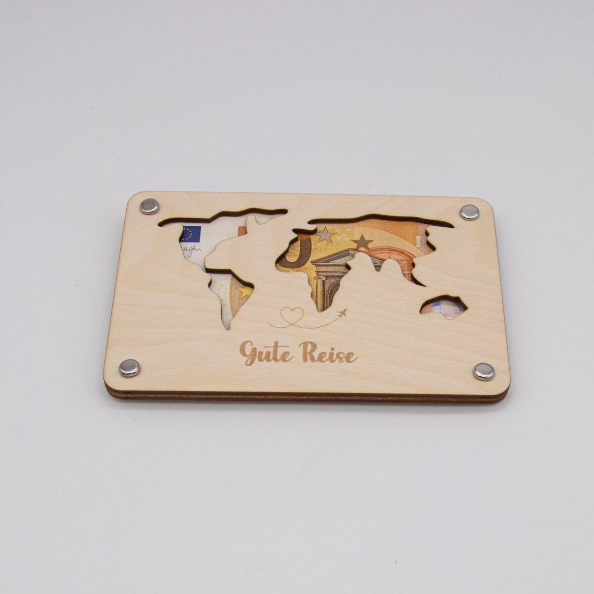 Funktionsweise: Die Karte besteht aus zwei sorgfältig zugeschnittenen Holzplatten, die jeweils 3mm dick sind. Die Platten sind mit präzisen Löchern versehen, durch die kleine Klammern gesteckt werden können, um die Platten zusammenzuhalten. Zwischen diesen beiden Holzplatten wird das Geld platziert. Durch die kunstvoll ausgelaserten Stellen der Weltkarte ist das Geld sichtbar und wird so Teil des Gesamtdesigns.