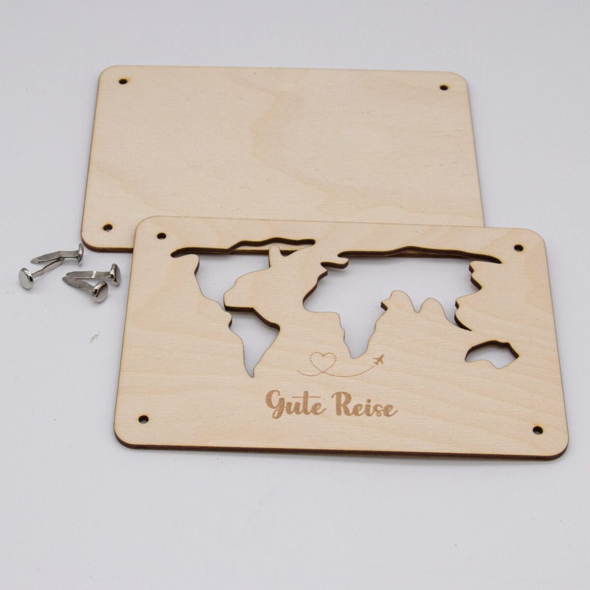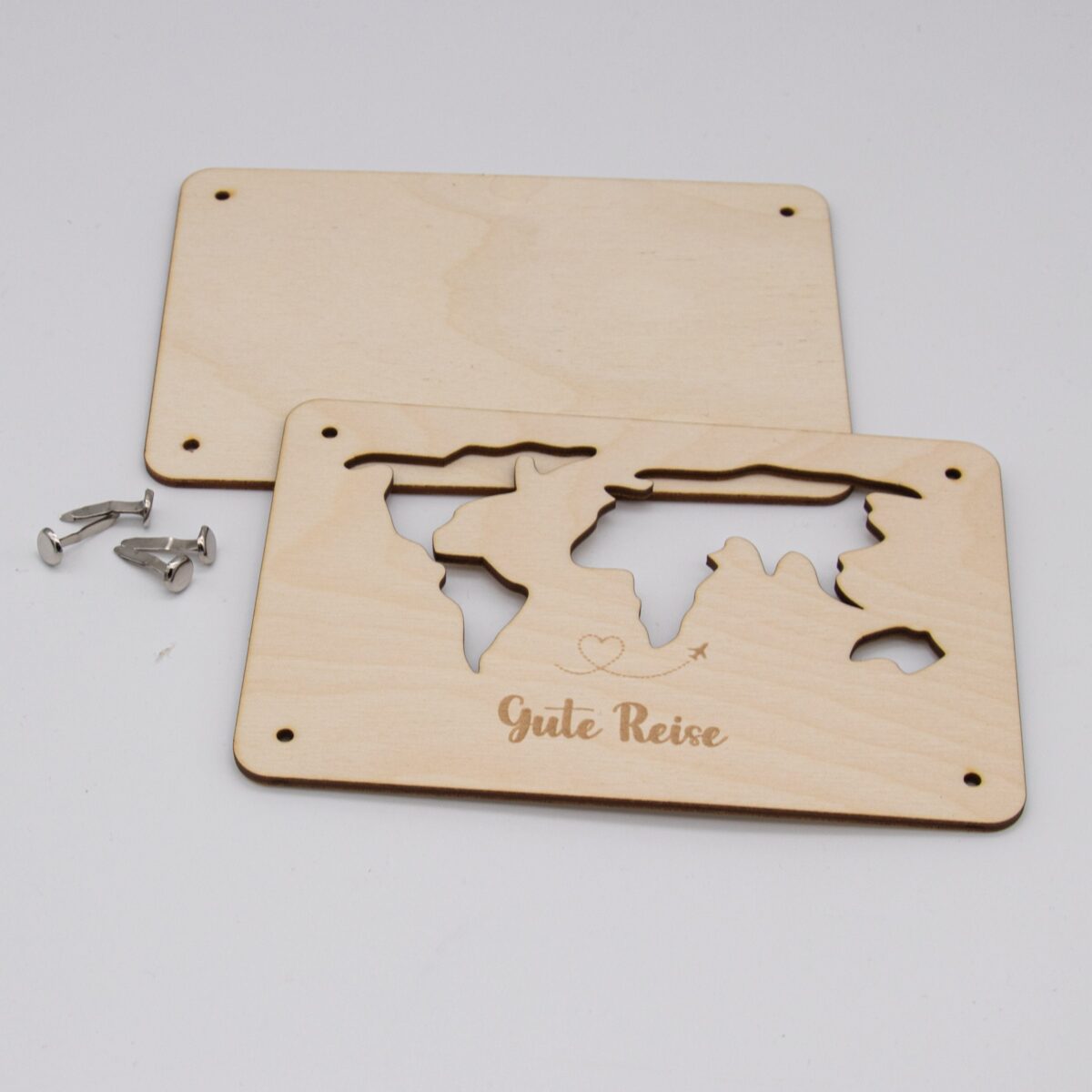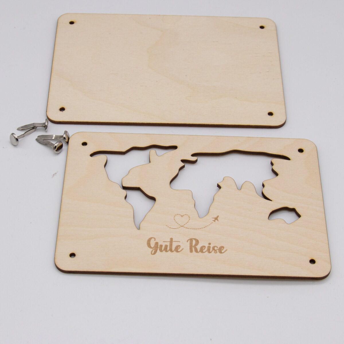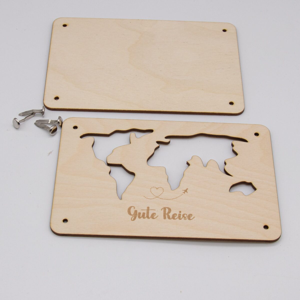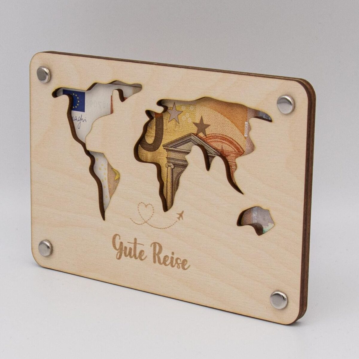 Funktionsweise: Die Karte besteht aus zwei sorgfältig zugeschnittenen Holzplatten, die jeweils 3mm dick sind. Die Platten sind mit präzisen Löchern versehen, durch die kleine Klammern gesteckt werden können, um die Platten zusammenzuhalten. Zwischen diesen beiden Holzplatten wird das Geld platziert. Durch die kunstvoll ausgelaserten Stellen der Weltkarte ist das Geld sichtbar und wird so Teil des Gesamtdesigns.