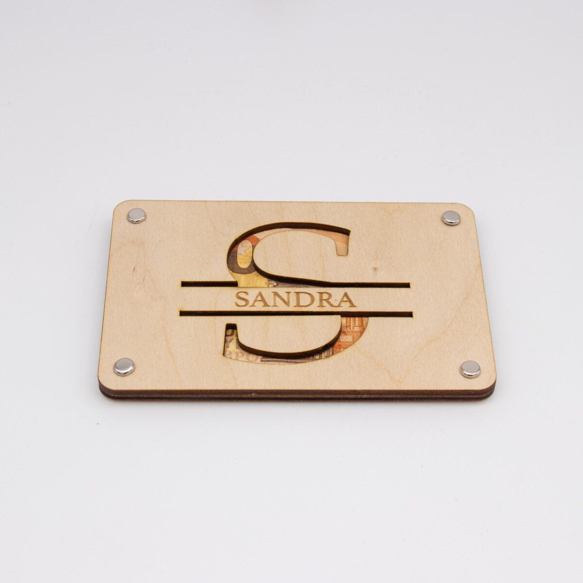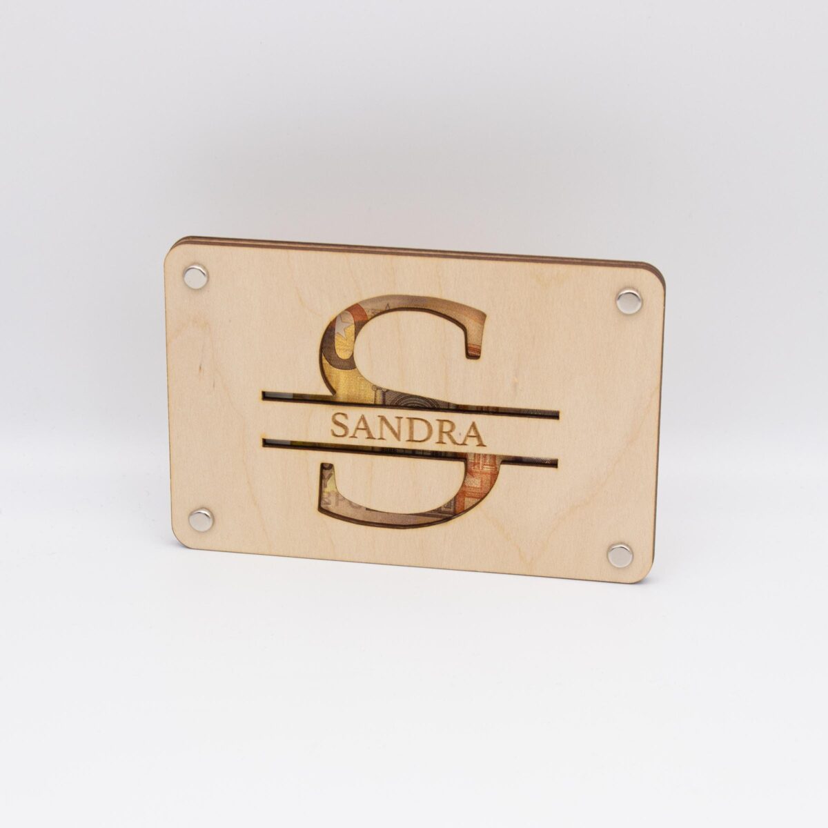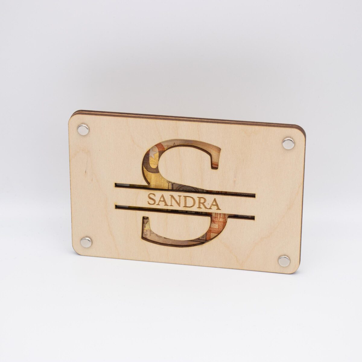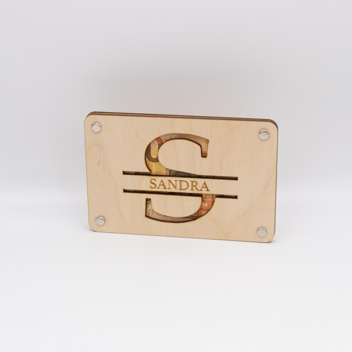 Das Herzstück dieser Karte ist ein akribisch ausgelaserter Buchstabe, der kunstvoll in das Holz geschnitten ist.Die sorgfältig lasergeschnittenen Details bieten einen spannenden Blick auf das darunterliegende Geldgeschenk und betonen die Exklusivität dieses Geschenks.