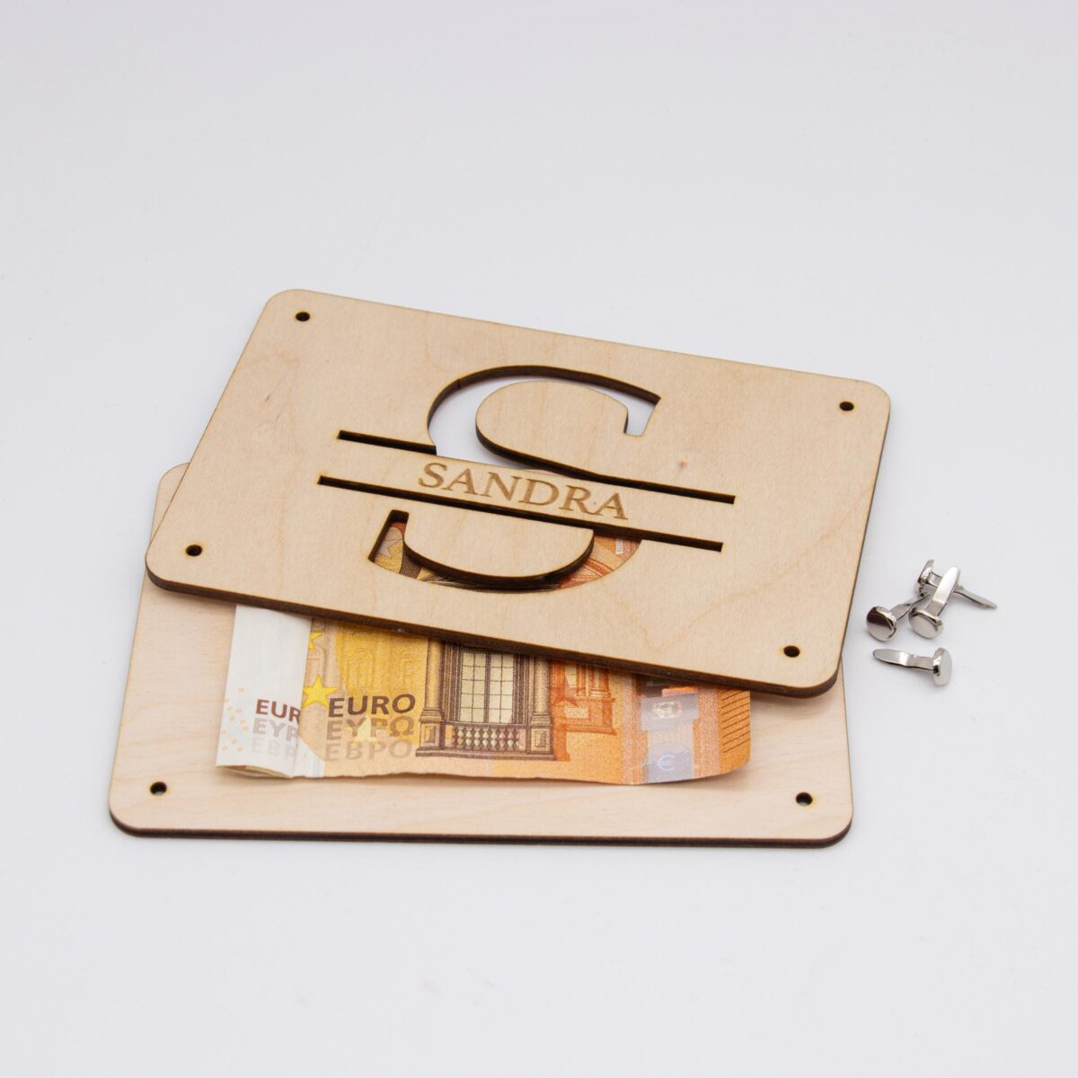 Die Karte besteht aus zwei stabilen Holzplatten, die durch präzise ausgestanzte Löcher miteinander verbunden werden können. Diese Löcher dienen dazu, kleine Klammern oder Bänder durchzustecken, was ein einfaches und sicheres Verschließen der Karte ermöglicht. Das Besondere: Legen Sie Geldscheine zwischen die Holzplatten, sind diese durch die ausgelaserten Stellen sichtbar. Dies verleiht dem Geldgeschenk nicht nur eine überraschende Komponente, sondern auch einen Hauch von Eleganz und Raffinesse.
