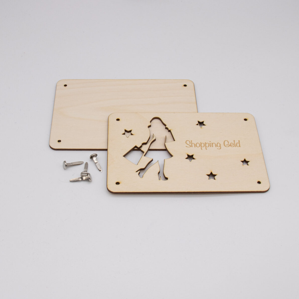 Funktionsweise: Die Karte besteht aus zwei sorgfältig zugeschnittenen Holzplatten, die jeweils 3mm dick sind. Die Platten sind mit präzisen Löchern versehen, durch die kleine Klammern gesteckt werden können, um die Platten zusammenzuhalten. Zwischen diesen beiden Holzplatten wird das Geld platziert. Durch die kunstvoll ausgelaserten Stellen des „Shopping Girl“-Motivs ist das Geld sichtbar und wird so Teil des Gesamtdesigns.