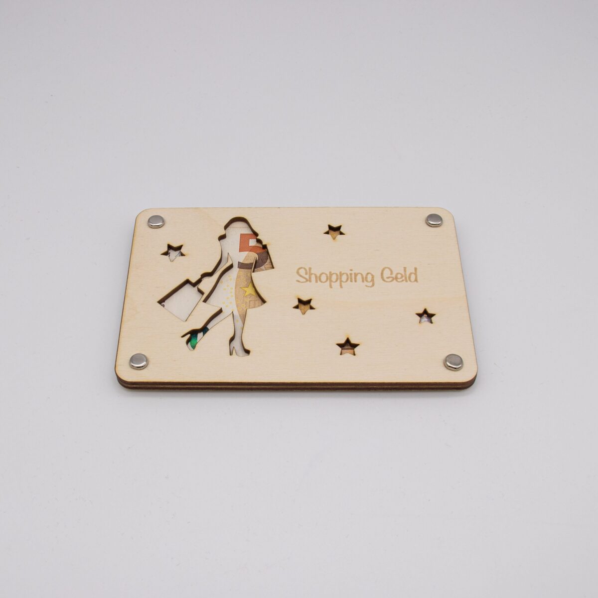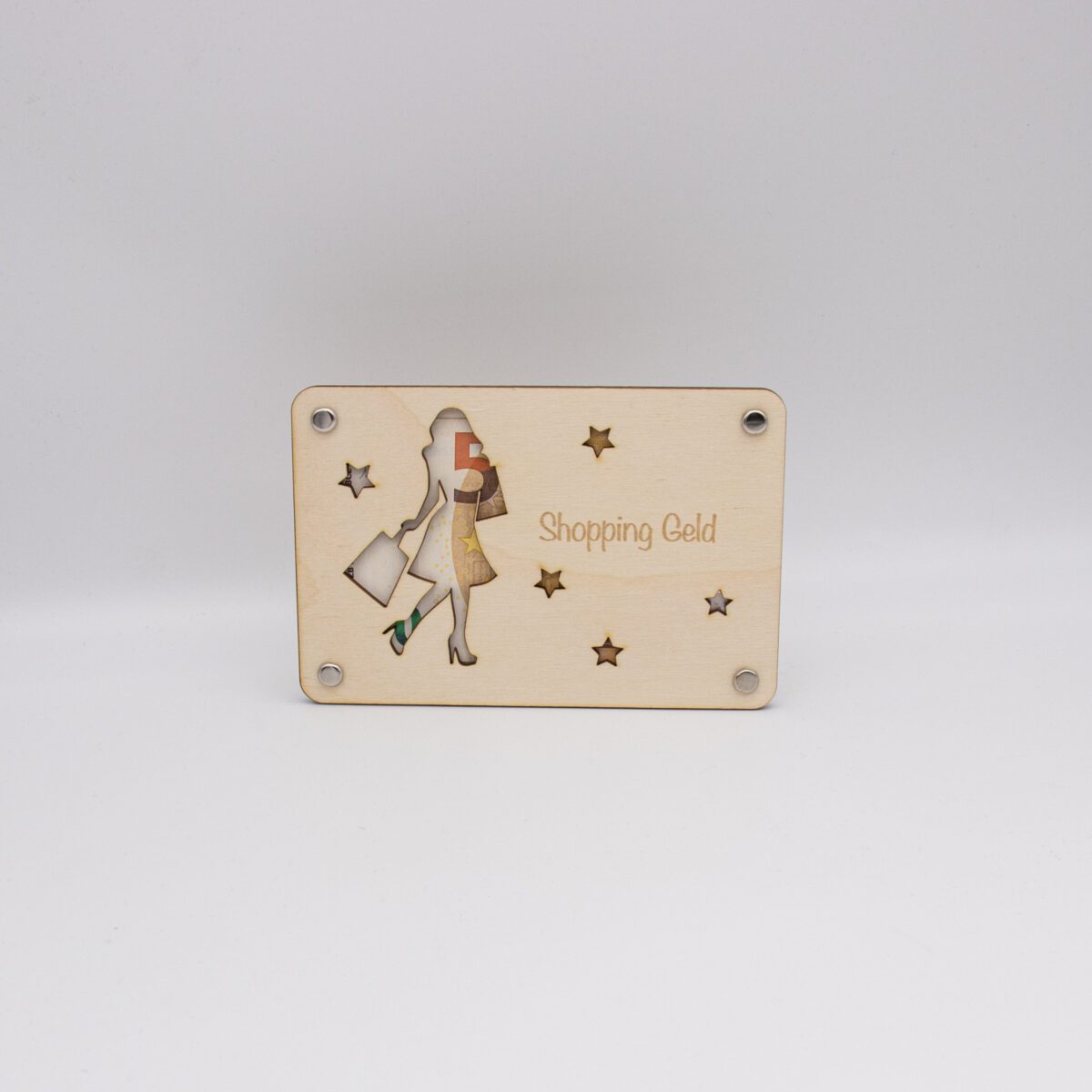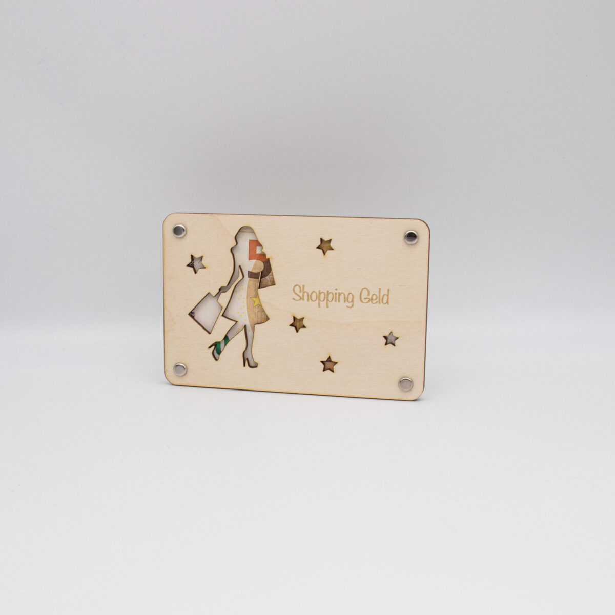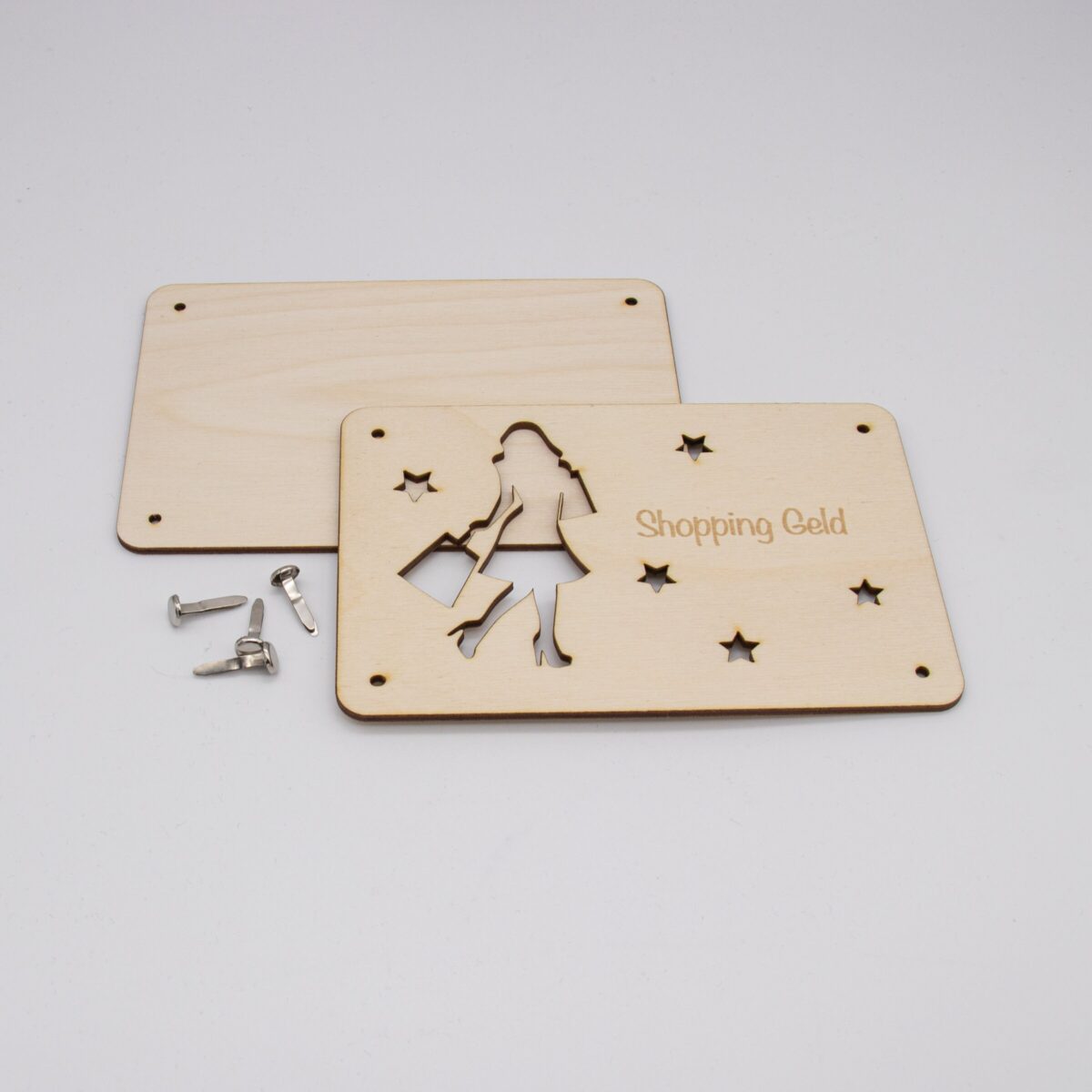 Design: Diese stilvolle und kreative Geldgeschenk-Karte ist perfekt für alle, die ein einzigartiges und persönliches Geschenk suchen. Das Motiv eines ausgelaserten „Shopping Girls“ wird aus hochwertigem Birken-Sperrholz gefertigt und bietet einen charmanten Rahmen für Ihr Geldgeschenk.