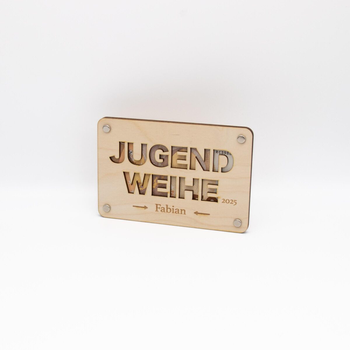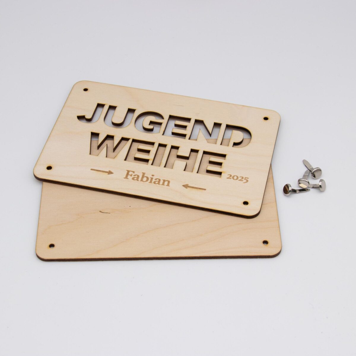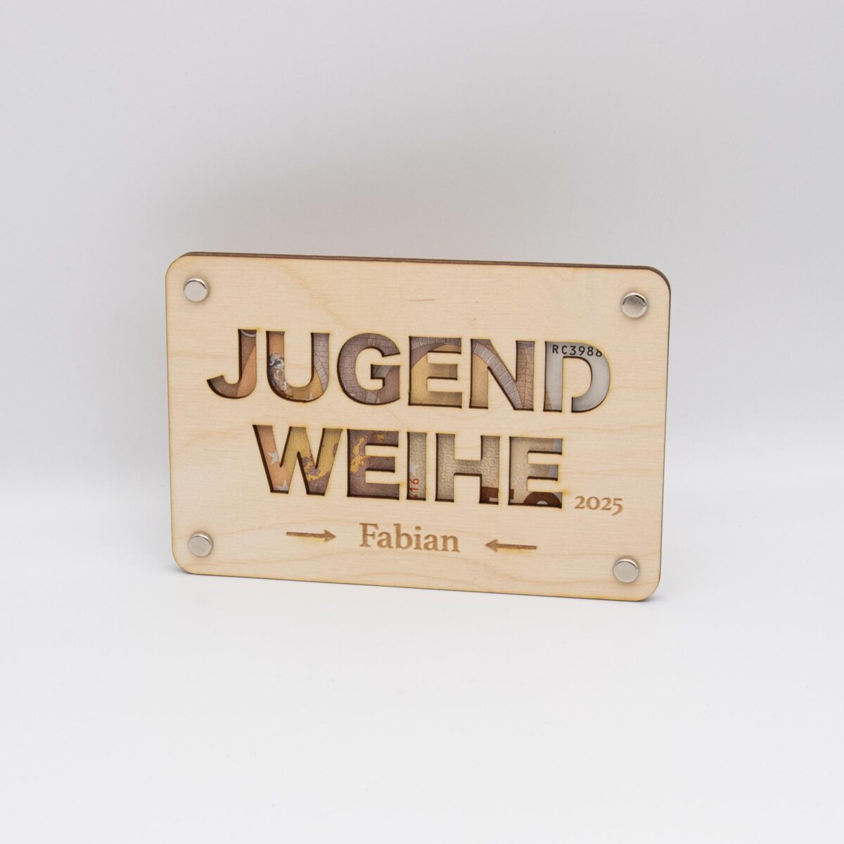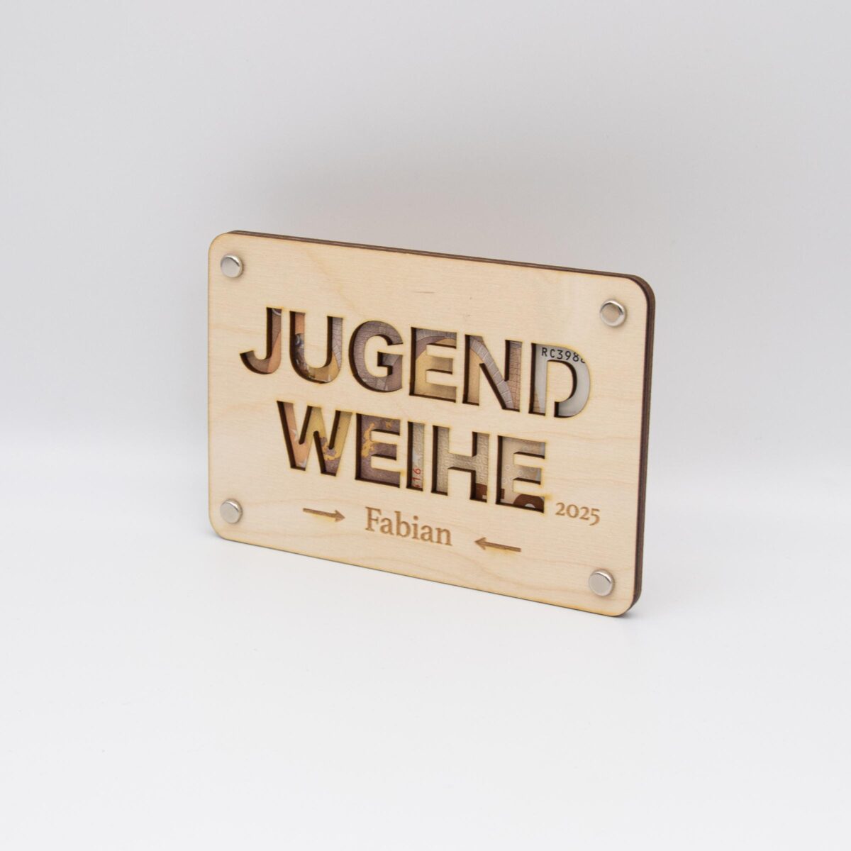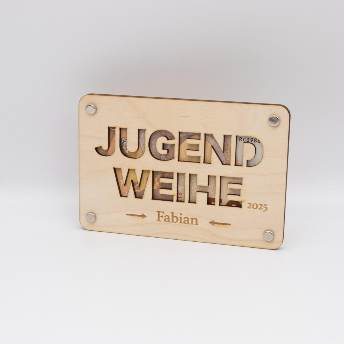 Design: Diese stilvolle und kreative Geldgeschenk-Karte ist perfekt für alle, die ein einzigartiges und persönliches Geschenk suchen. Das Motiv eines ausgelaserten Jugendweihe Schriftzugs wird aus hochwertigem Birken-Sperrholz gefertigt und bietet einen charmanten Rahmen für Ihr Geldgeschenk.