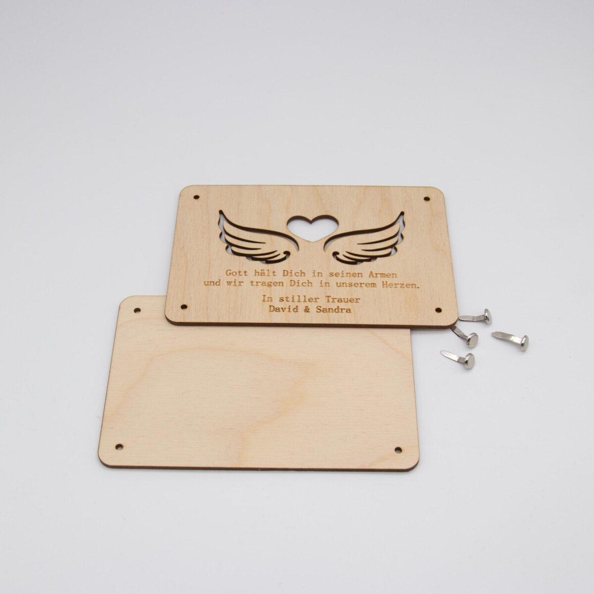 Die beiden Holzplatten werden mit dekorativen Musterklammern an den Ecken verbunden, die nicht nur für Stabilität sorgen, sondern auch das Design abrunden. Die natürlichen Holzmaserungen und die unbehandelte Oberfläche verleihen der Karte eine rustikale und gleichzeitig edle Optik.