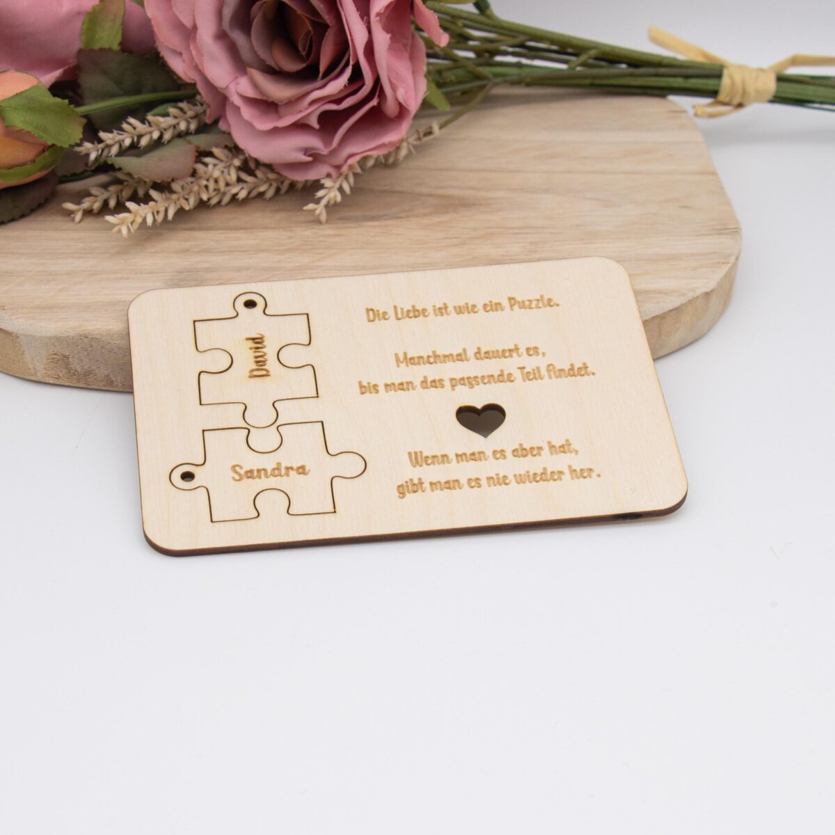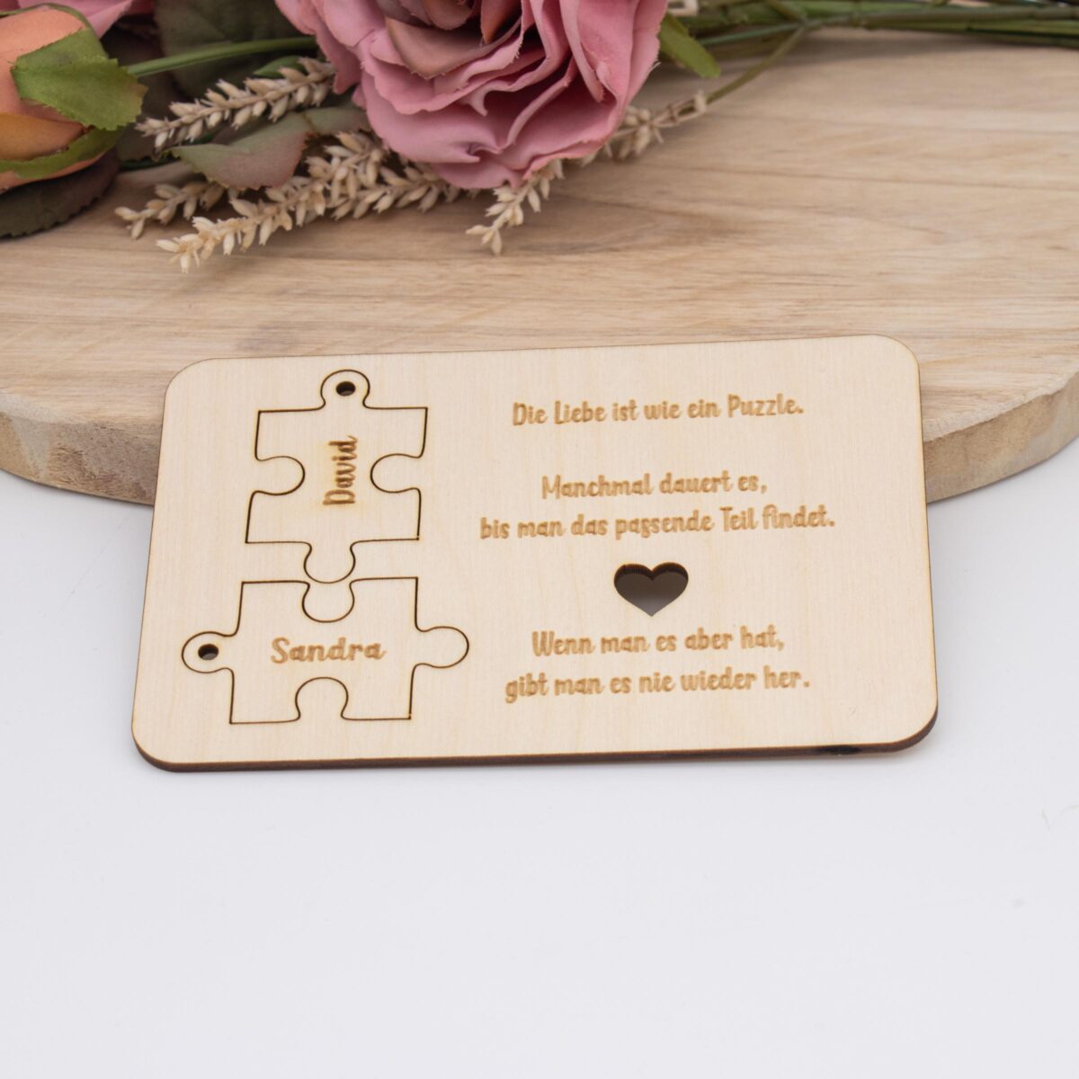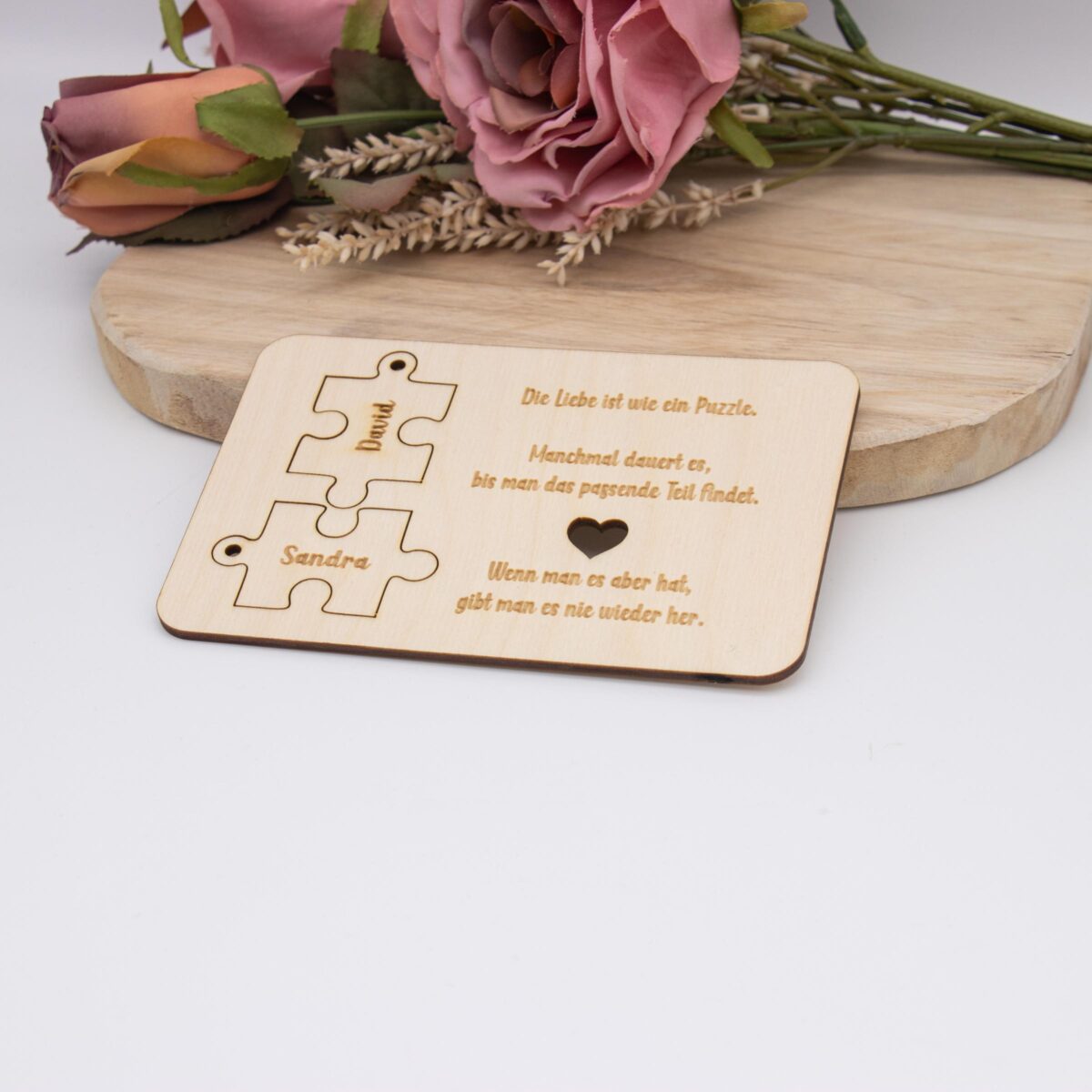 Warum unsere Holzkarte? Diese Karte ist nicht nur ein Gruß, sondern ein liebevolles Erinnerungsstück, das bleibt. Das Design mit den herausnehmbaren Puzzleteilen macht sie zu etwas ganz Besonderem – eine Botschaft, die von Herzen kommt, in einer Form, die für immer hält.
