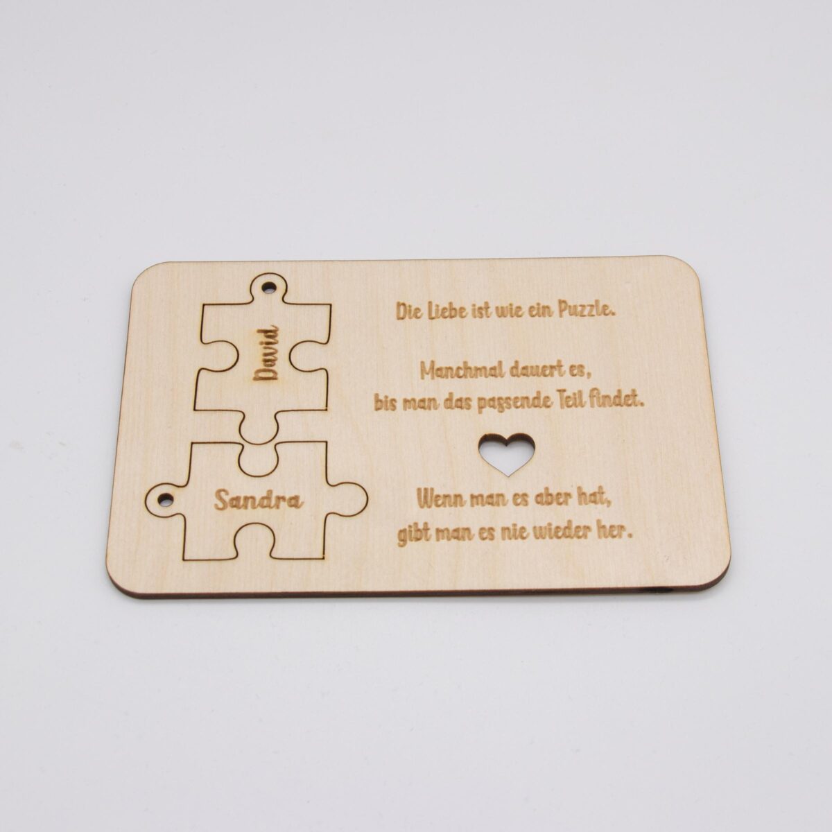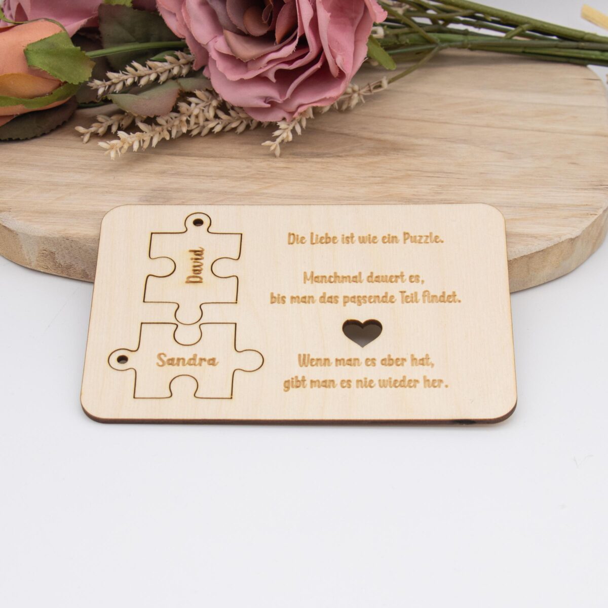 Puzzleherzen zum Raustrennen: Zwei süße Puzzleteile mit euren Namen können leicht herausgetrennt werden. Sie symbolisieren die Verbundenheit zweier Herzen und eignen sich als kleiner Glücksbringer oder Andenken, das Sie mit Ihrem Lieblingsmenschen teilen können.