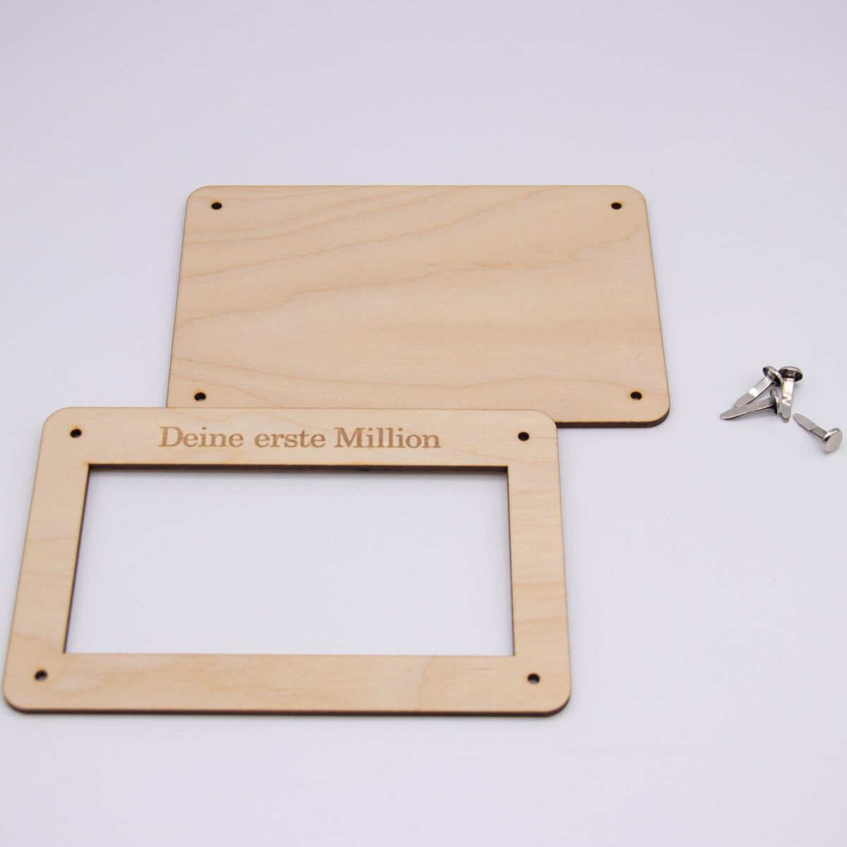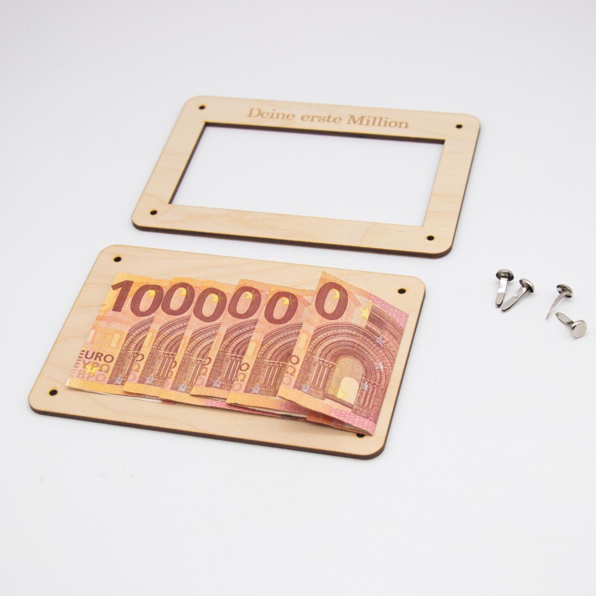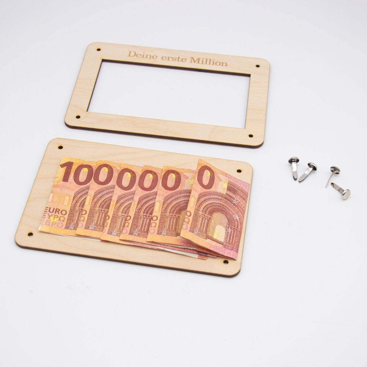 Funktionsweise: Die Karte besteht aus zwei sorgfältig zugeschnittenen Holzplatten, die jeweils 3mm dick sind. Die Platten sind mit präzisen Löchern versehen, durch die kleine Klammern gesteckt werden können, um die Platten zusammenzuhalten. Zwischen diesen beiden Holzplatten wird das Geld platziert. Durch die kunstvoll ausgelaserten Stellen des Motivs ist das Geld sichtbar und wird so Teil des Gesamtdesigns.