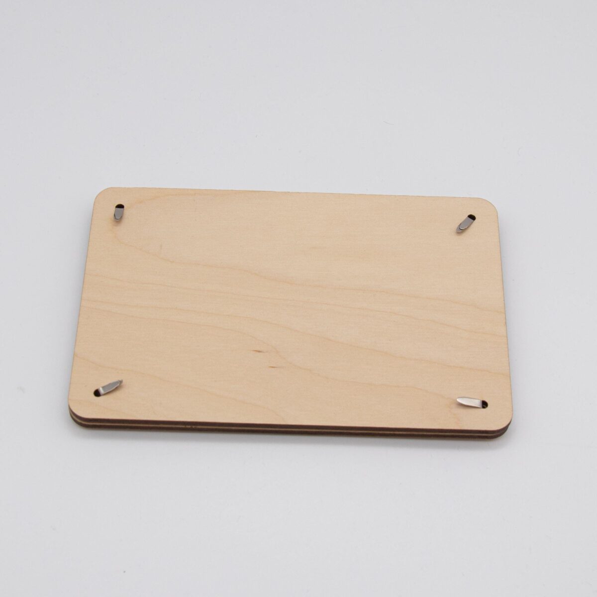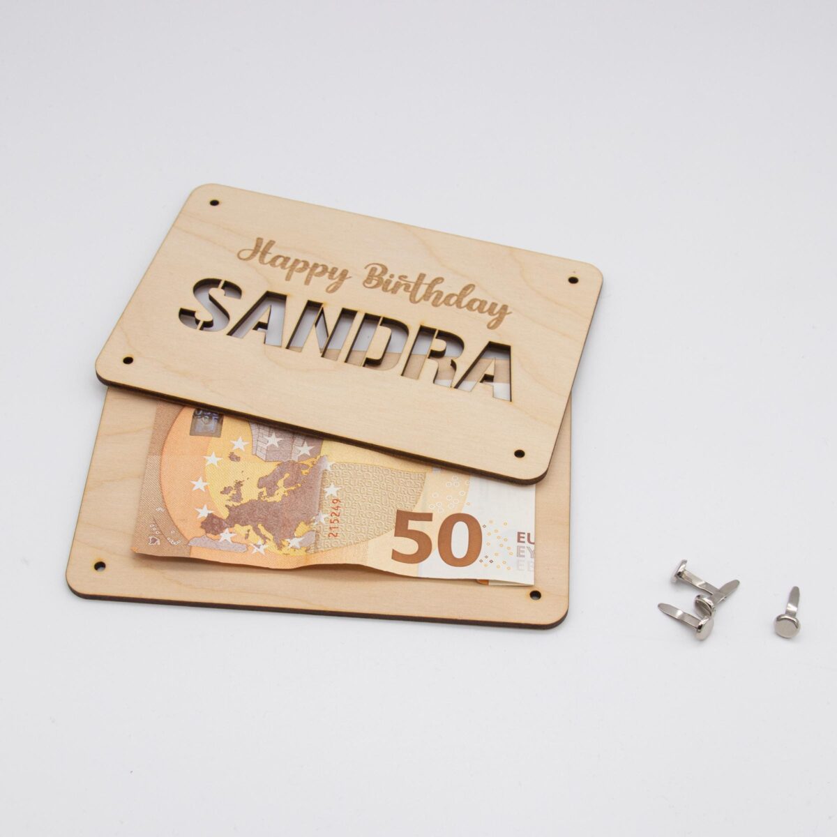 Funktionsweise: Die Karte besteht aus zwei sorgfältig zugeschnittenen Holzplatten, die jeweils 3mm dick sind. Die Platten sind mit präzisen Löchern versehen, durch die kleine Klammern gesteckt werden können, um die Platten zusammenzuhalten. Zwischen diesen beiden Holzplatten wird das Geld platziert. Durch die kunstvoll ausgelaserten Stellen des Motivs ist das Geld sichtbar und wird so Teil des Gesamtdesigns.