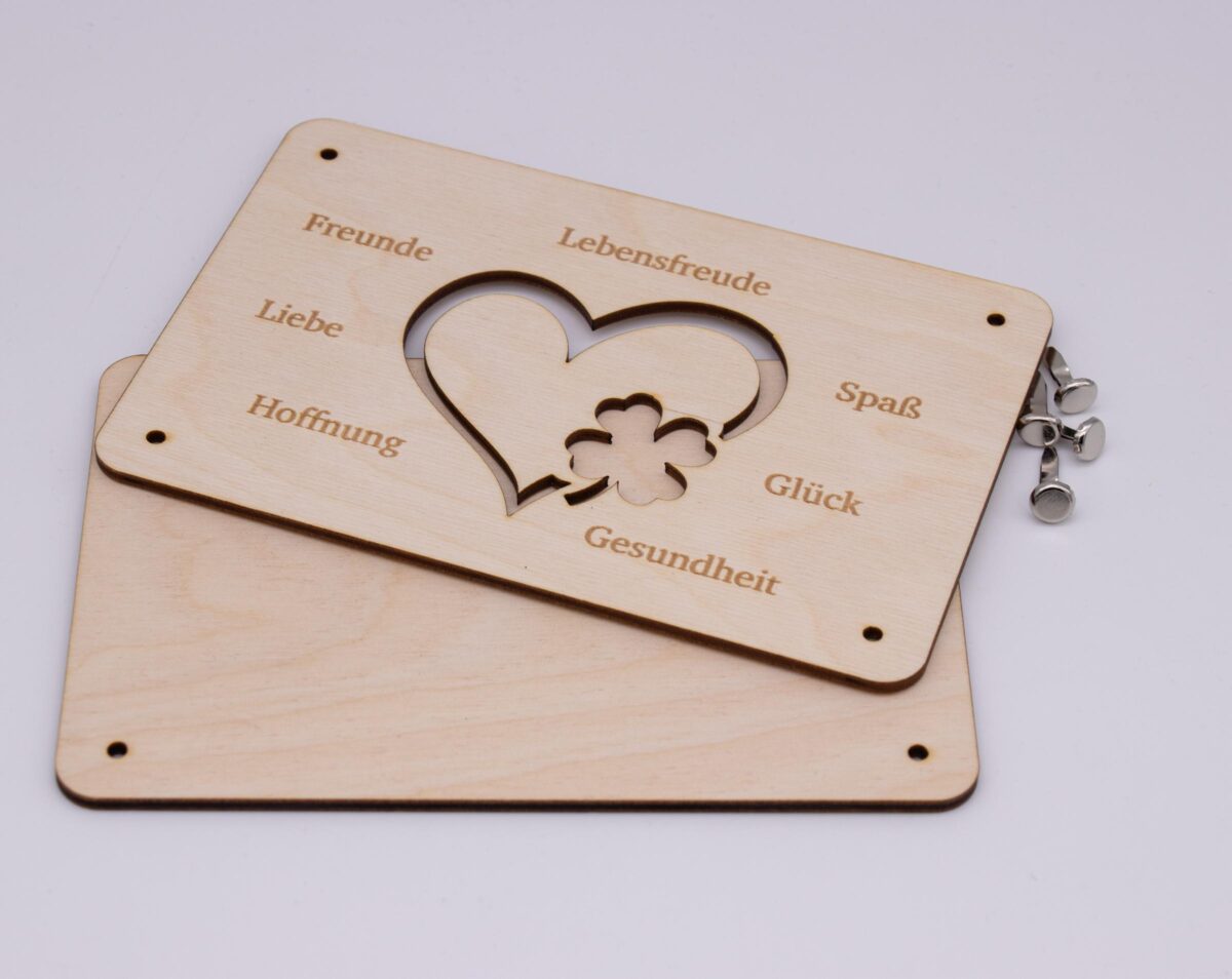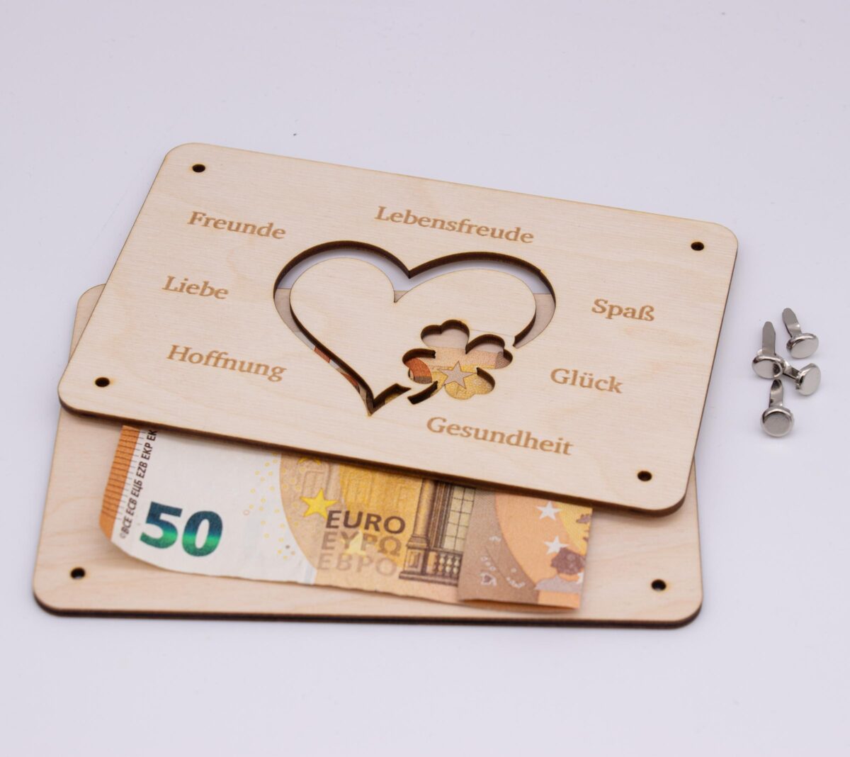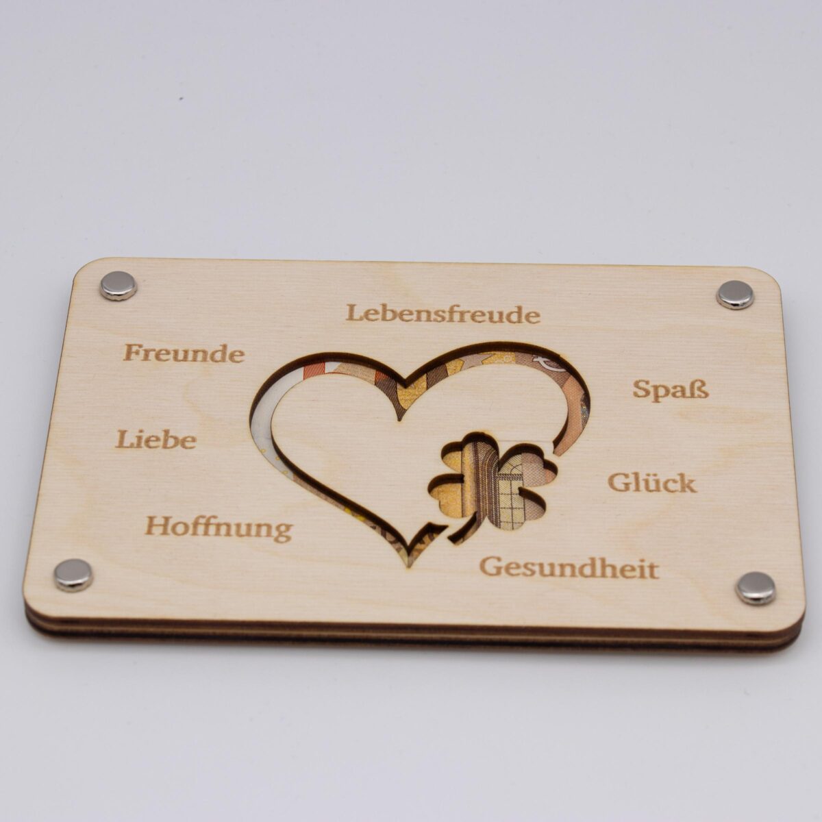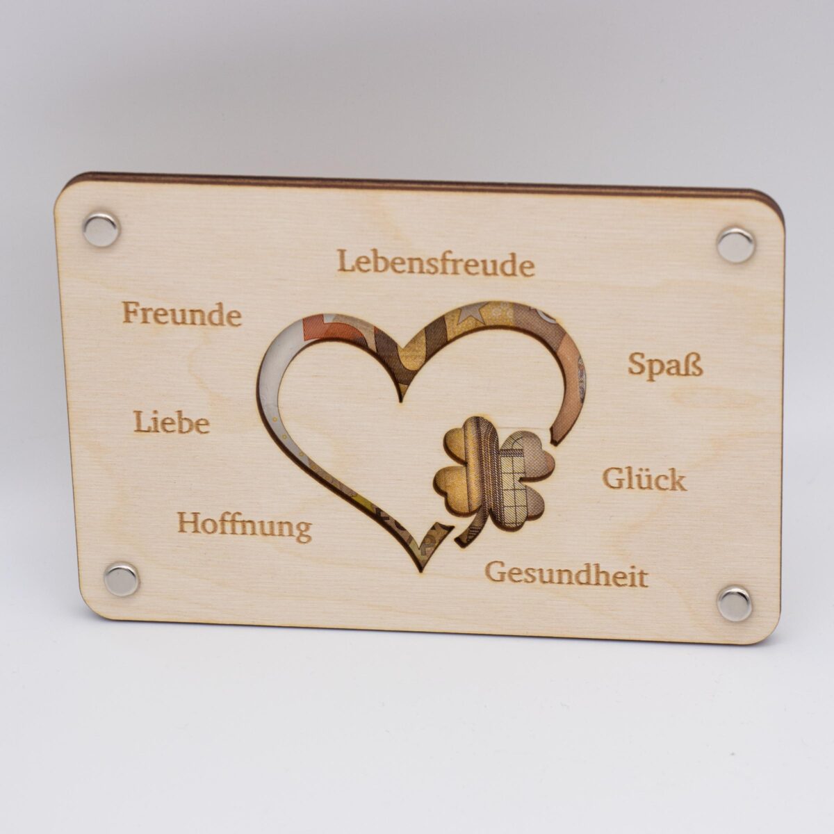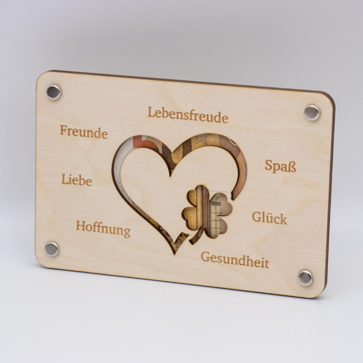 Das besondere Highlight: Ein filigran ausgelasertes Herz mit Kleeblatt-Motiv sorgt dafür, dass das darin platzierte Geld sichtbar bleibt – ein origineller Hingucker! Zusätzlich sind liebevolle Glückwünsche wie „Liebe“, „Glück“ und „Gesundheit“ ins Holz eingraviert, um dem Geschenk eine persönliche Note zu verleihen.